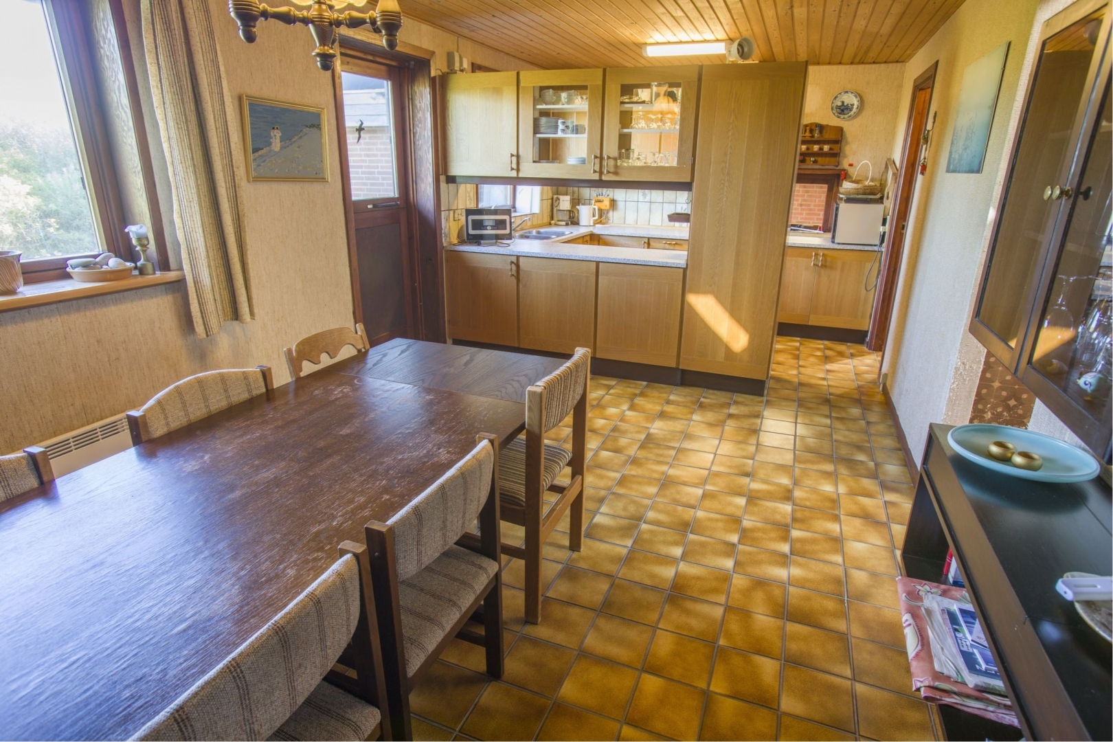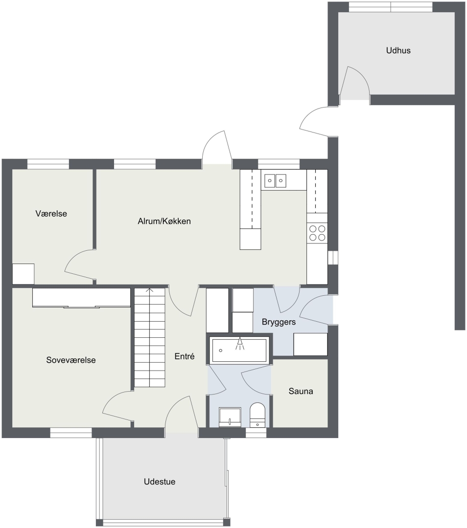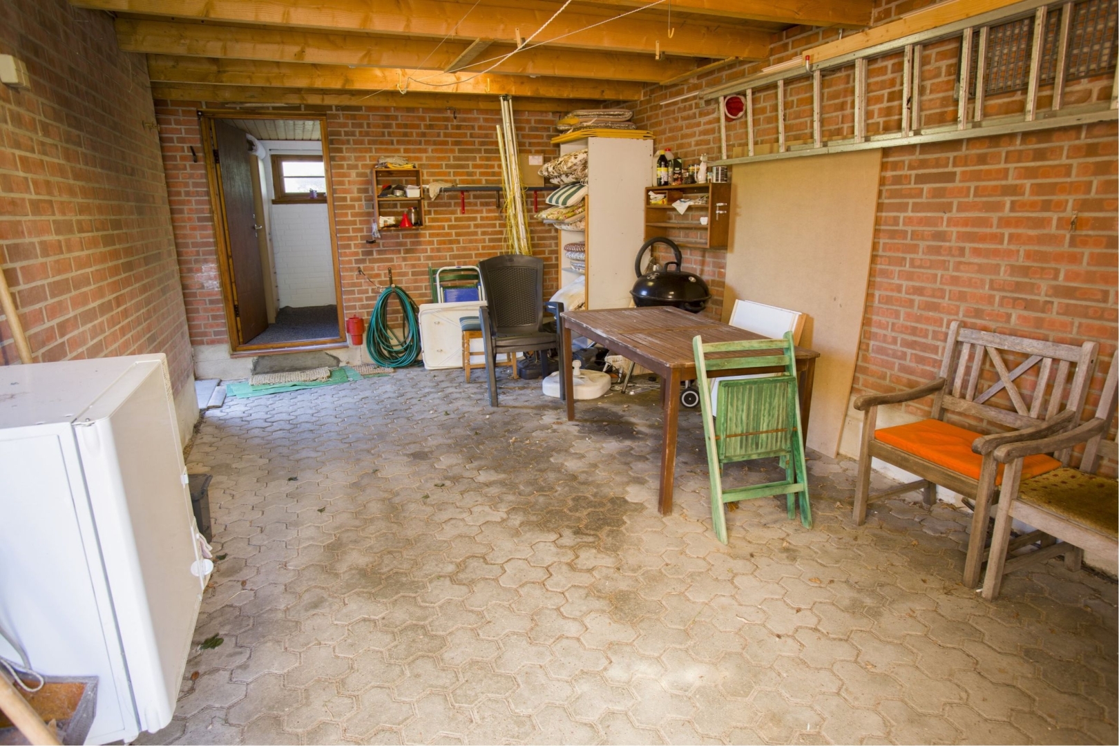 Denne udsigts bolig indeholder: Entre med garderobe trappe til 1. sal - Badeværelse med sauna, badekar, toilet, vask og gulvvarme - Soveværelse med skabe - Værelse med skab - Stort køkken/alrum med klinkegulv og udgang til helt lukket og ugeneret gårdhave - Baggang med indgang fra garagen. Yderligere er der sammenbygget muret garage med tilhørende udhus og havestue i glas.
