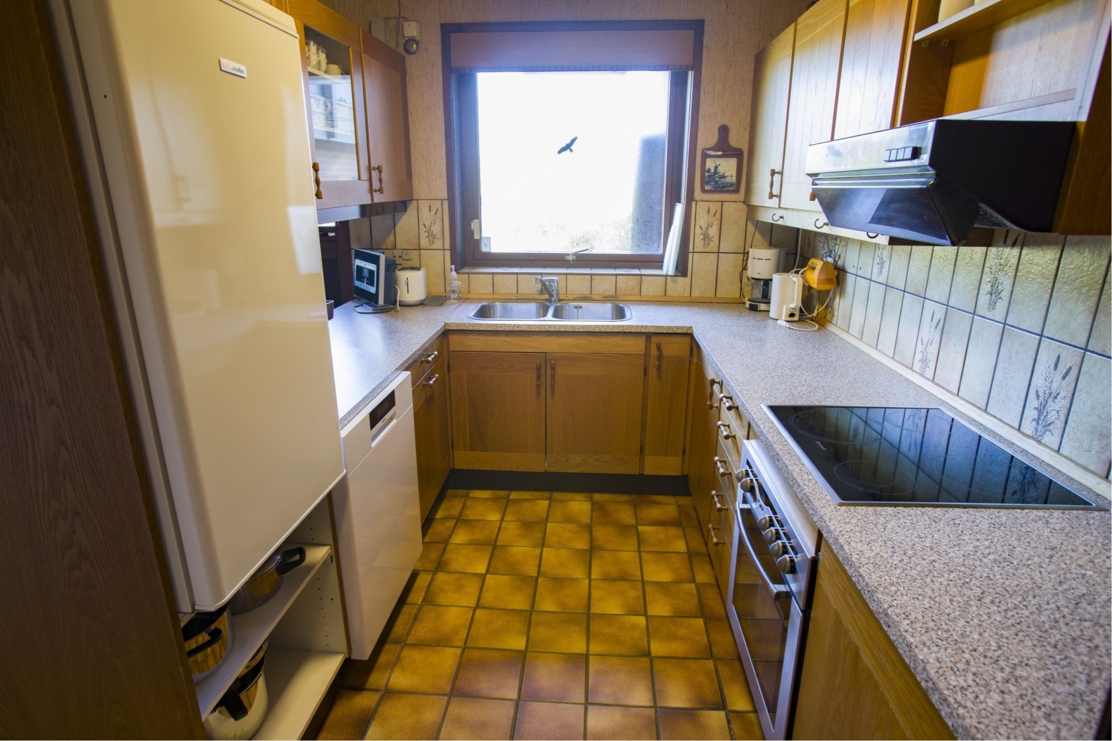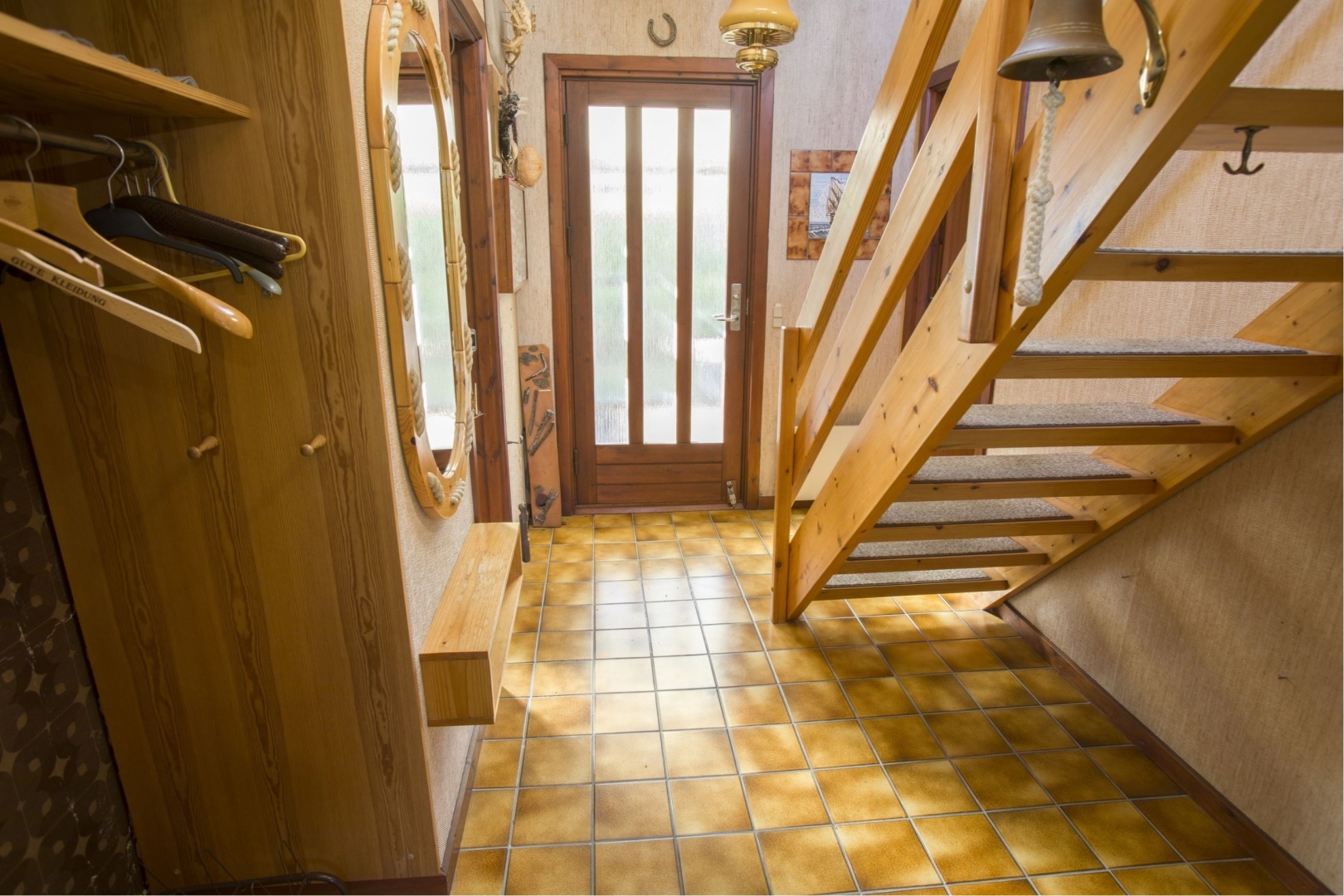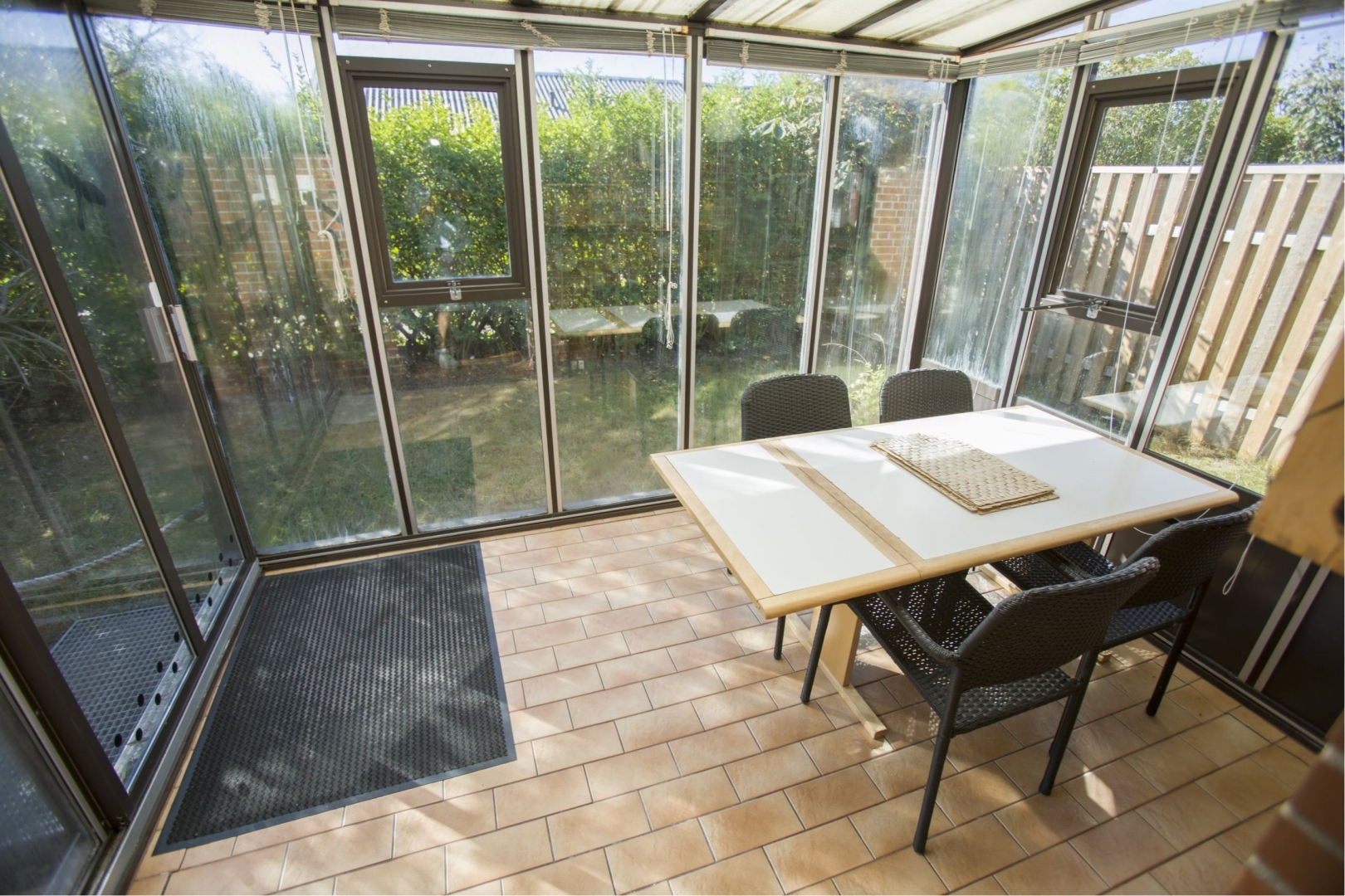 Denne udsigts bolig indeholder: Entre med garderobe trappe til 1. sal - Badeværelse med sauna, badekar, toilet, vask og gulvvarme - Soveværelse med skabe - Værelse med skab - Stort køkken/alrum med klinkegulv og udgang til helt lukket og ugeneret gårdhave - Baggang med indgang fra garagen. Yderligere er der sammenbygget muret garage med tilhørende udhus og havestue i glas.