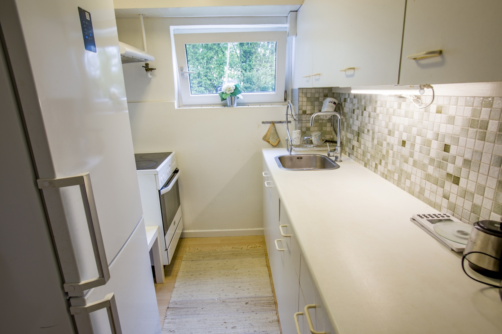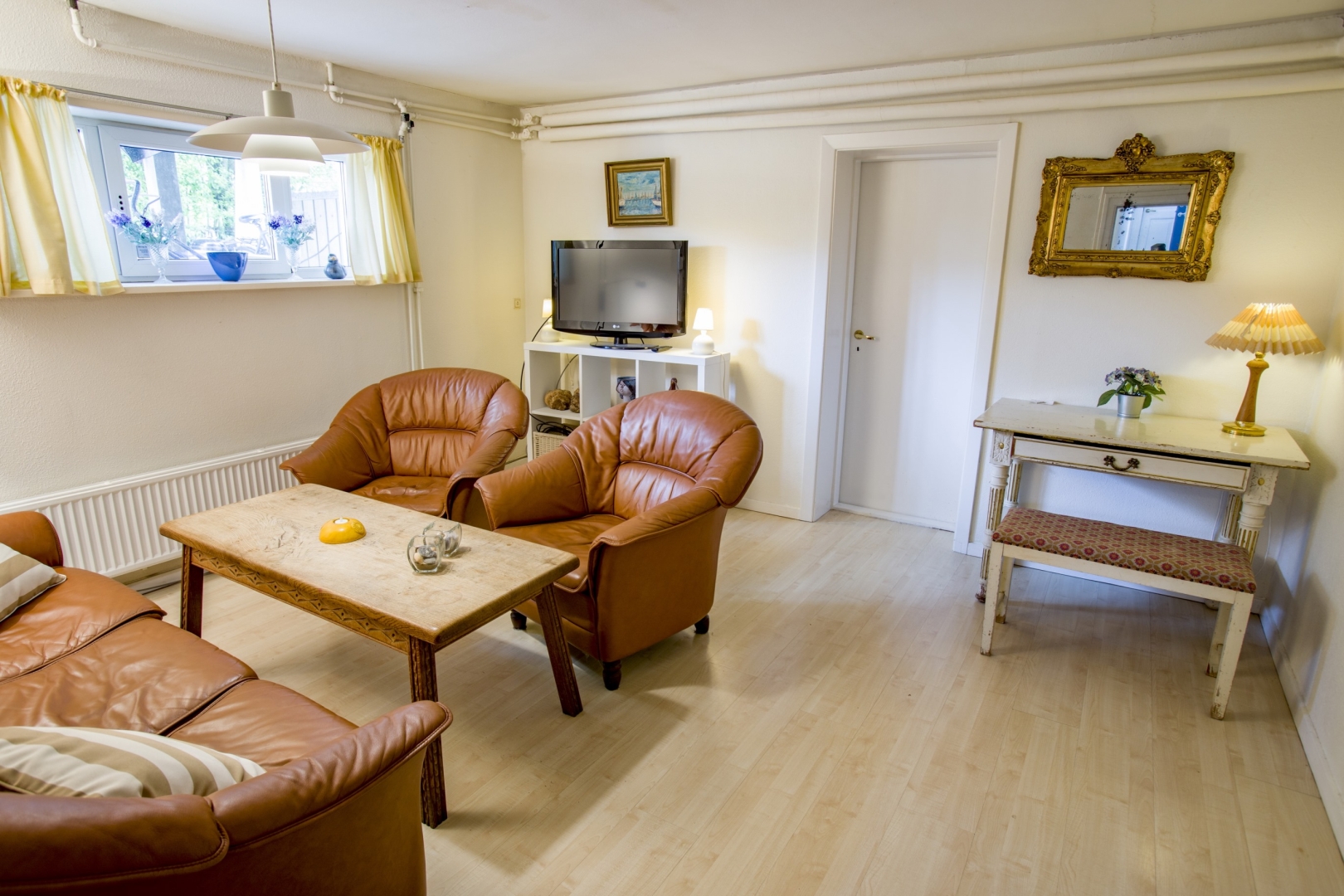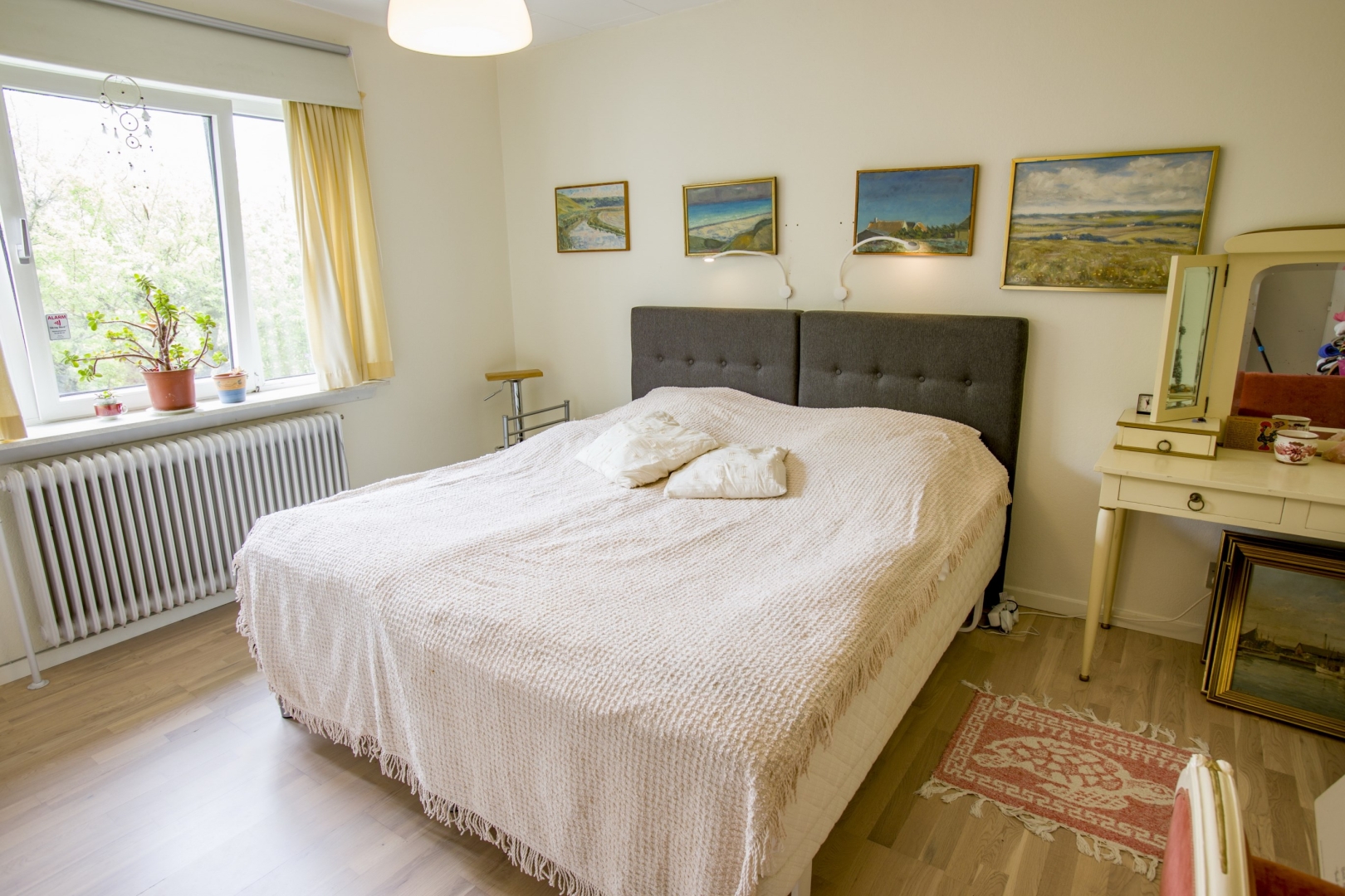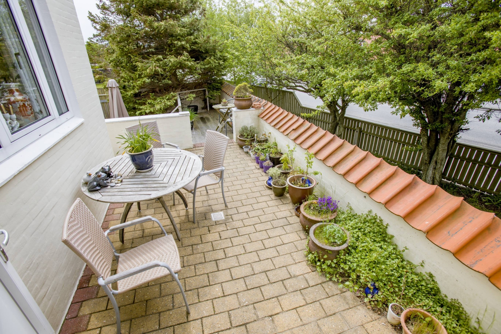 Høj lejlighed i midt etage, lys og god udsigt hele vejen rundt fra alle værelser og stuer. En stue med udgang til terrasse og derfra en teak gangbro ned i ugeneret solgård. Dør ud til flisebelagt stor sydvendt terrasse, som har været forbeholdt lejer.