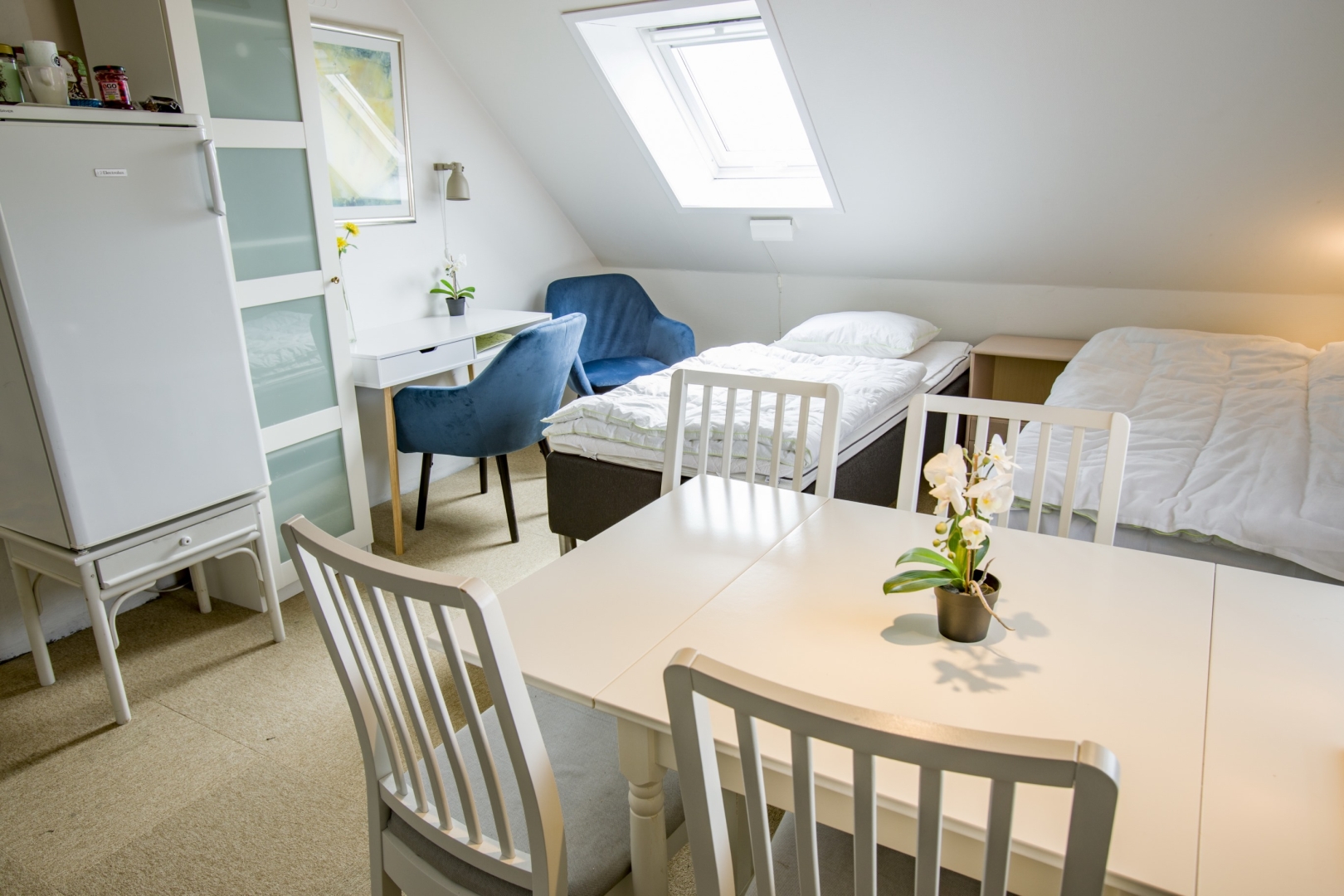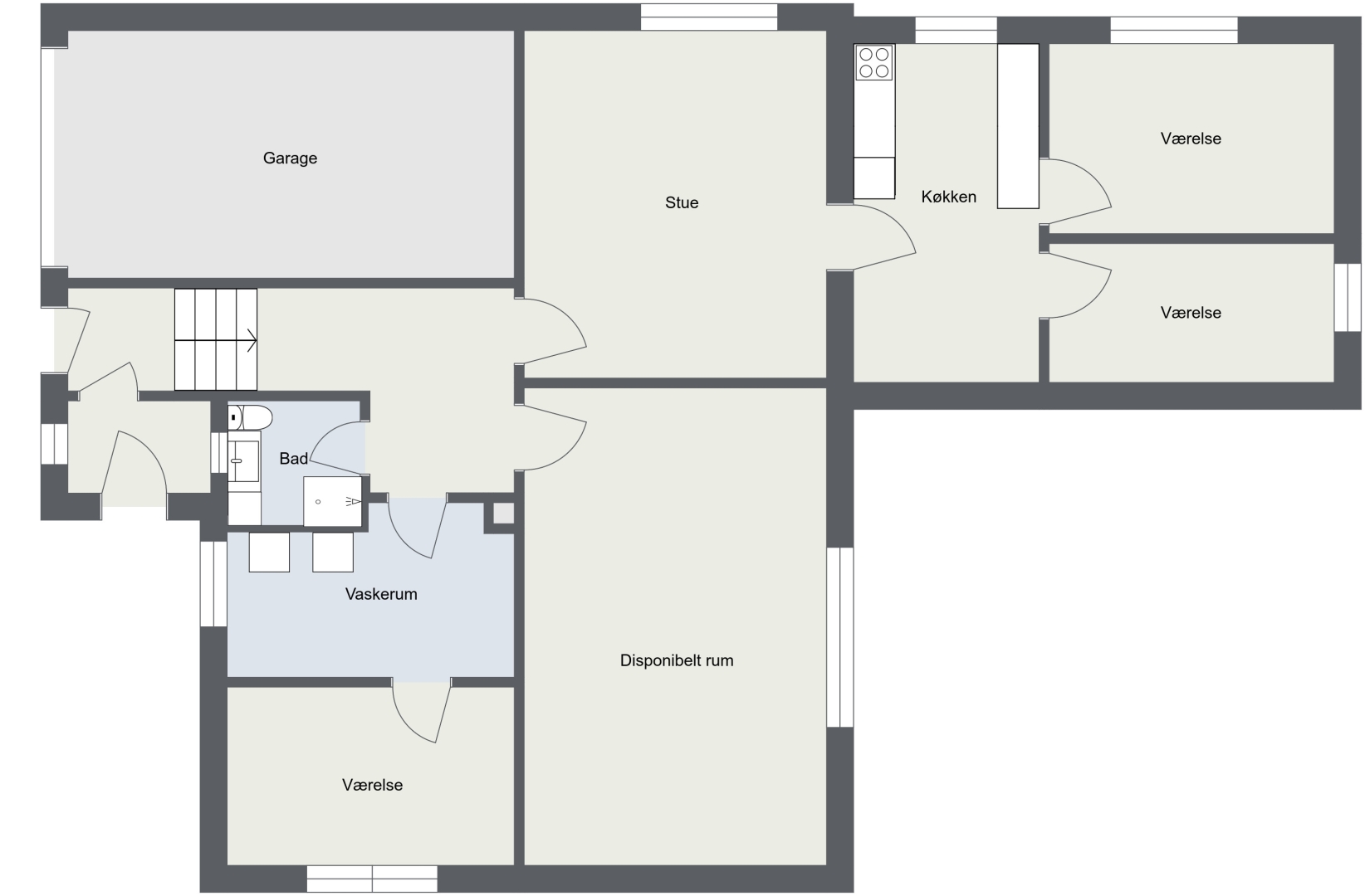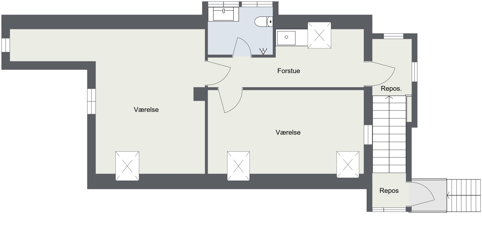 Stor p-plads, herfra trappetårn op til 2 store dejlige værelser med te-køkken og badeværelse. Underetagen har flere disponible rum og værelser. Der er fin sammenhæng mellem etagerne. Der er nedkørsel til garage/værksted. Huset har en lav varmeregning.