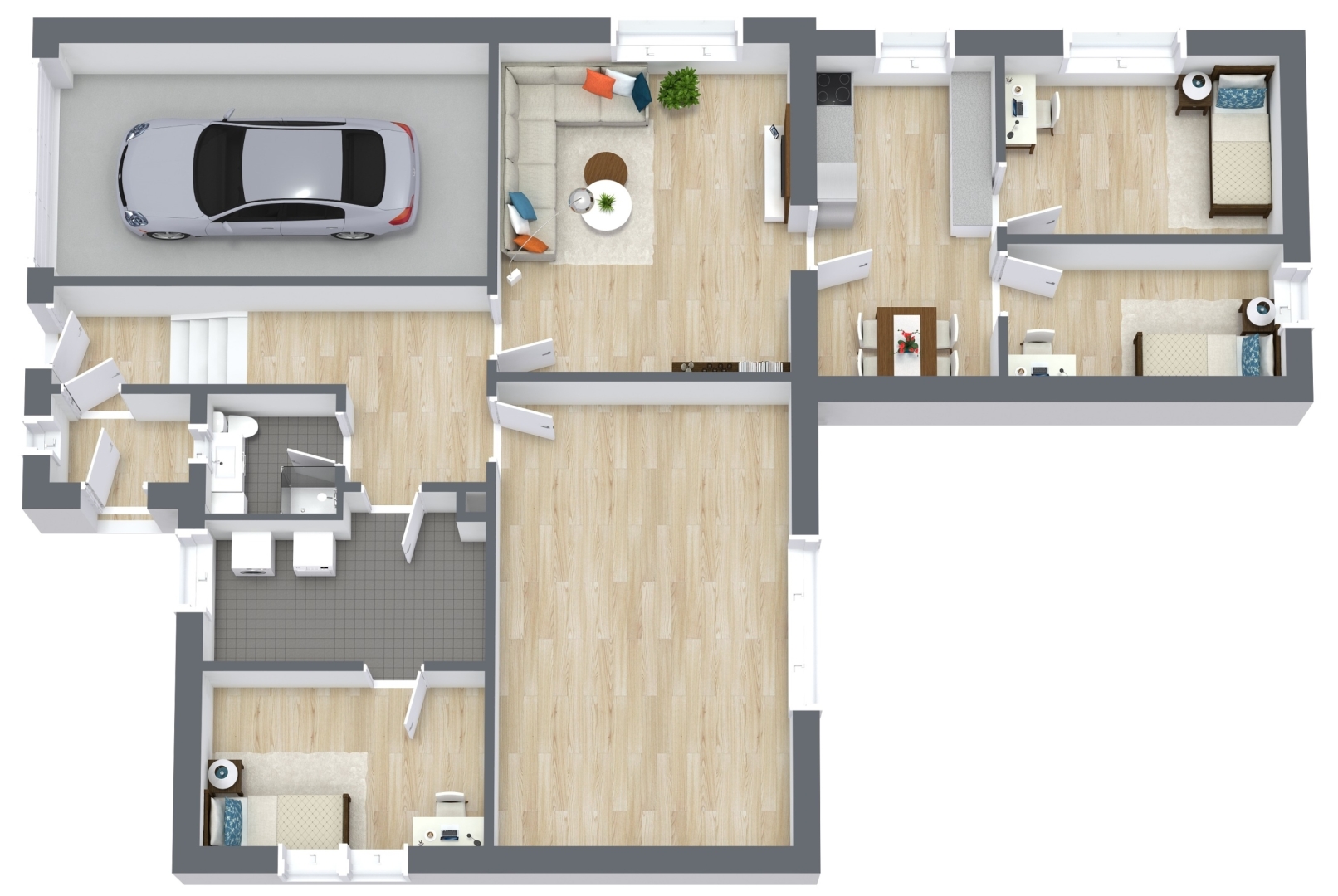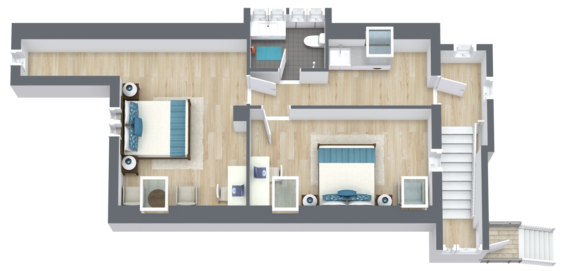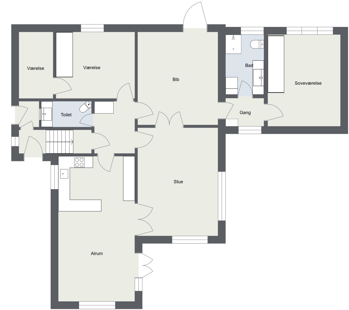 Stor p-plads, herfra trappetårn op til 2 store dejlige værelser med te-køkken og badeværelse. Underetagen har flere disponible rum og værelser. Der er fin sammenhæng mellem etagerne. Der er nedkørsel til garage/værksted. Huset har en lav varmeregning.