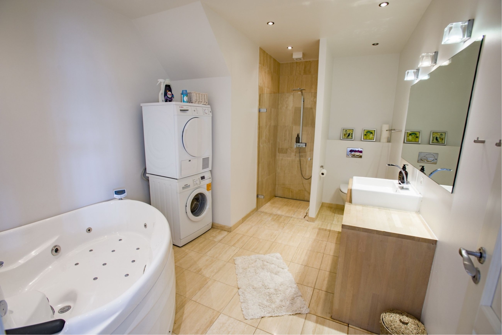 Lejlighedens 162 m² er fordelt over to plan. Stueplan byder på et stilfuldt badeværelse med hjørnespa, bruseniche, vaskesøjle og diskrete loftspots. Det pæne køkken, dekoreret med stuk i loftet, er åbent mod den lyse spiseplads, hvorfra der er adgang til en stor, eksklusiv tagterrasse i hårdttræ. Her kan du nyde en fantastisk udsigt og stemningsfyldte aftener i det fri. To lyse værelser med stuk og indbyggede skabe.