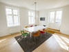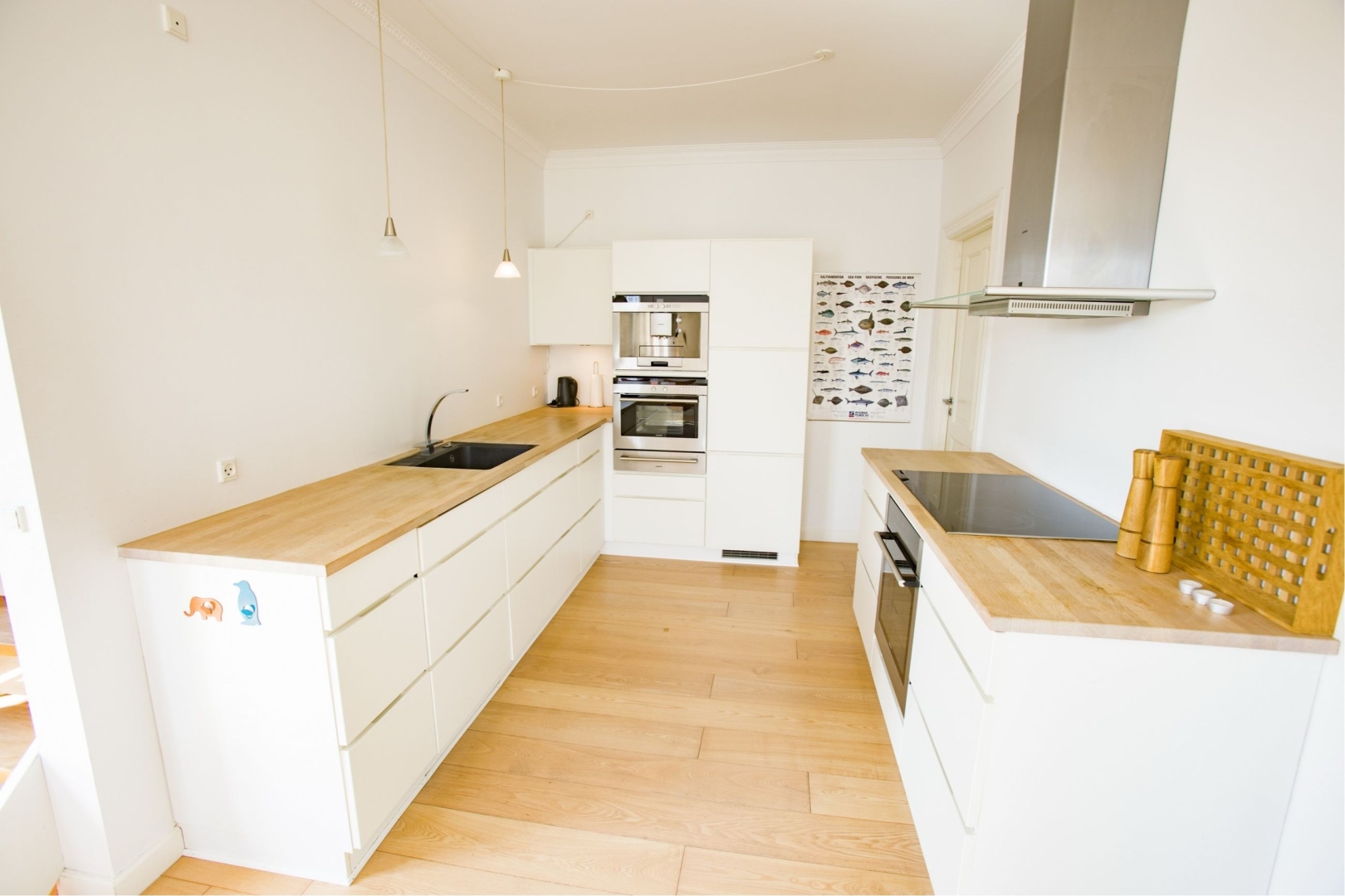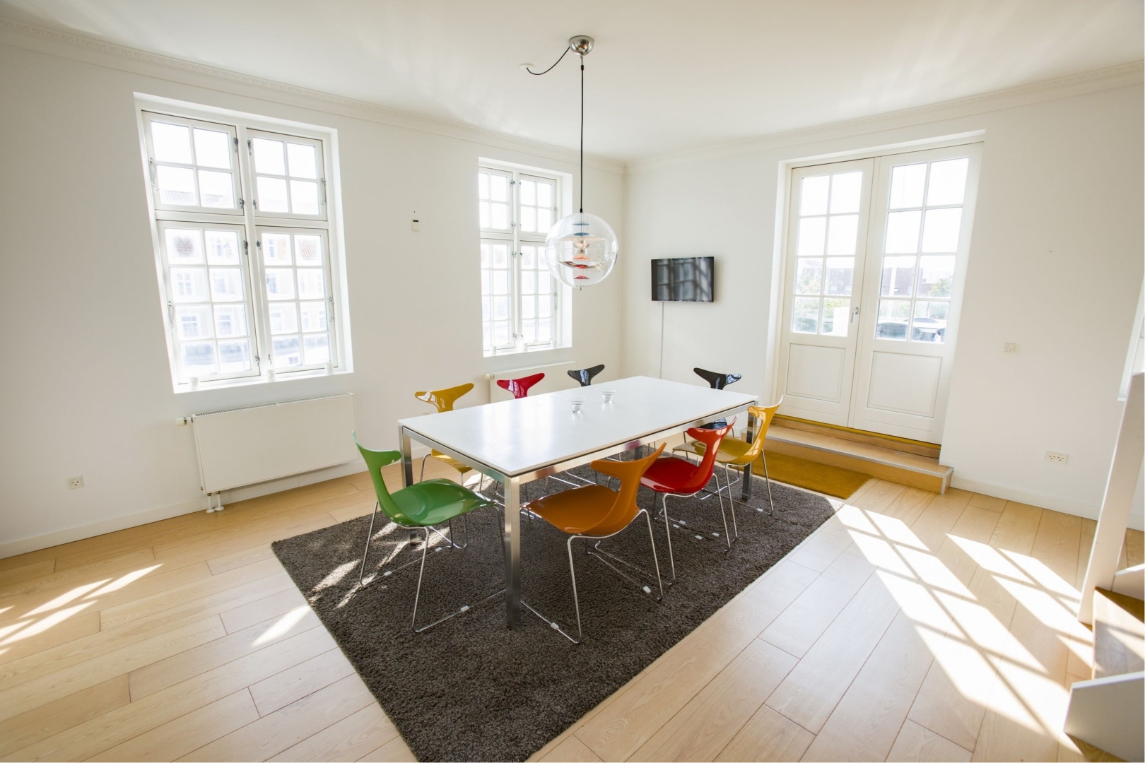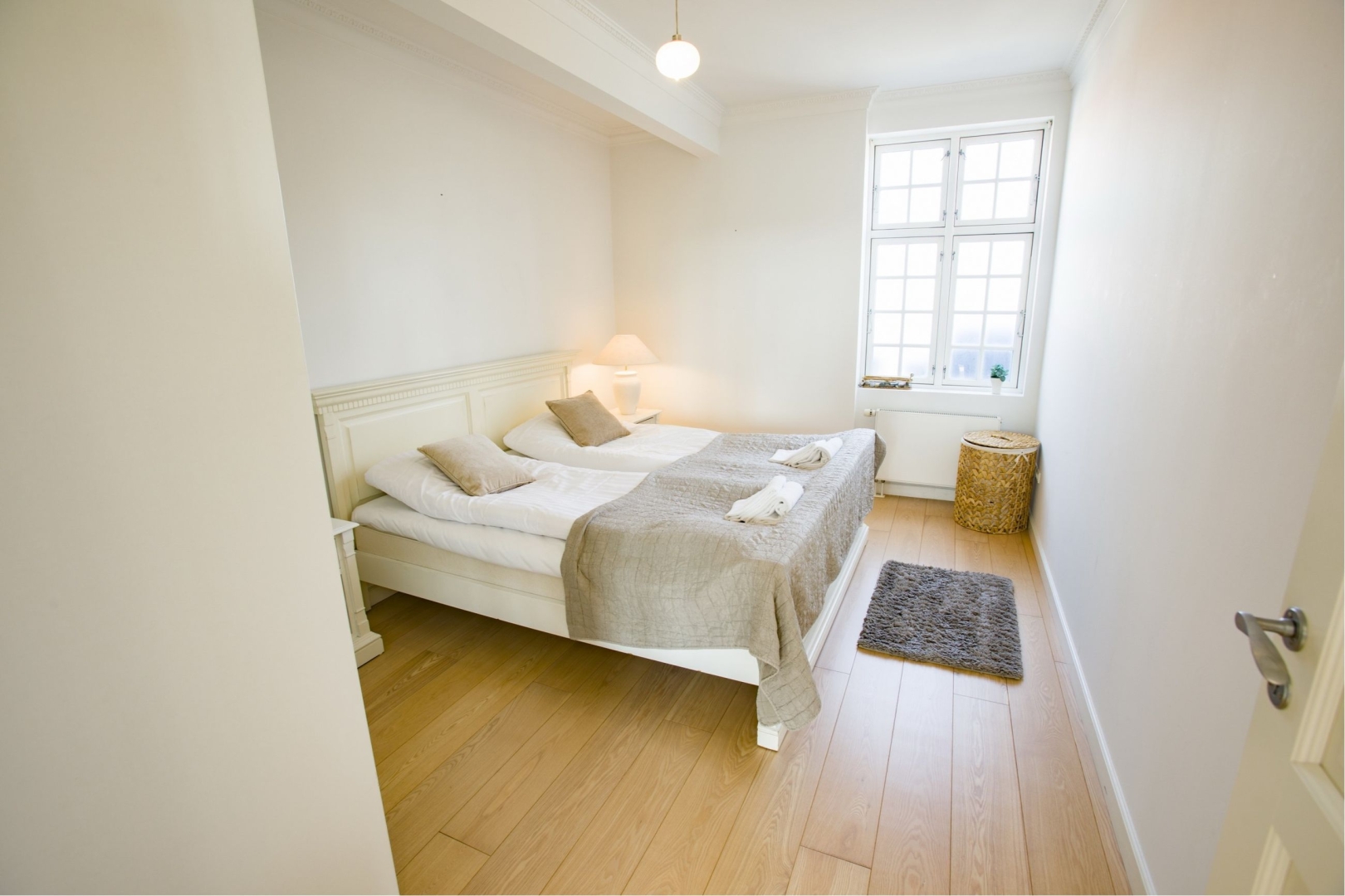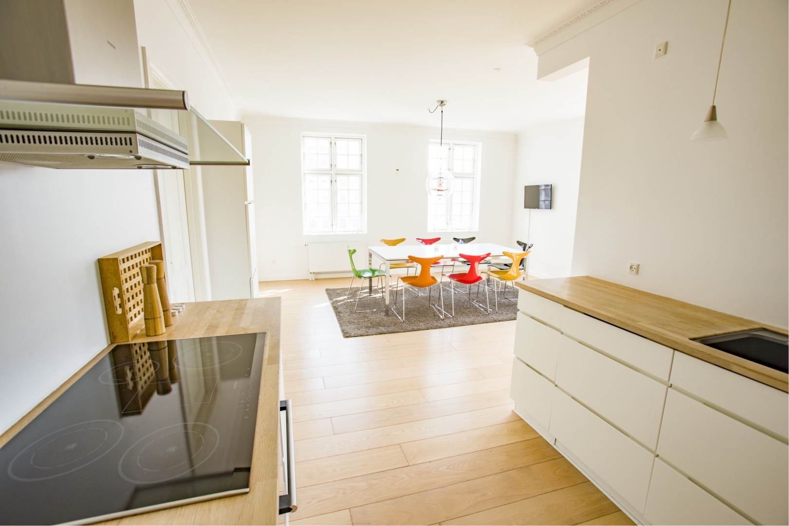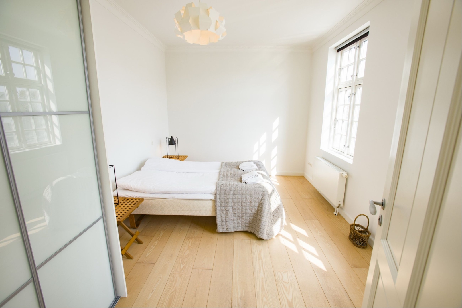Bygningen fra 1920 blev nænsomt renoveret i 2007, og denne lejlighed fremstår i dag moderne og indbydende med en perfekt balance mellem klassisk charme og skandinavisk elegance. De originale bjælker skaber et varmt og hyggeligt miljø i stuen, og den oprindelige trappeopgang med de smukt bevarede døre og gelænder tilfører ekstra sjæl til boligen. Til lejligheden medfølger en privat parkeringsplads.