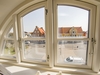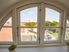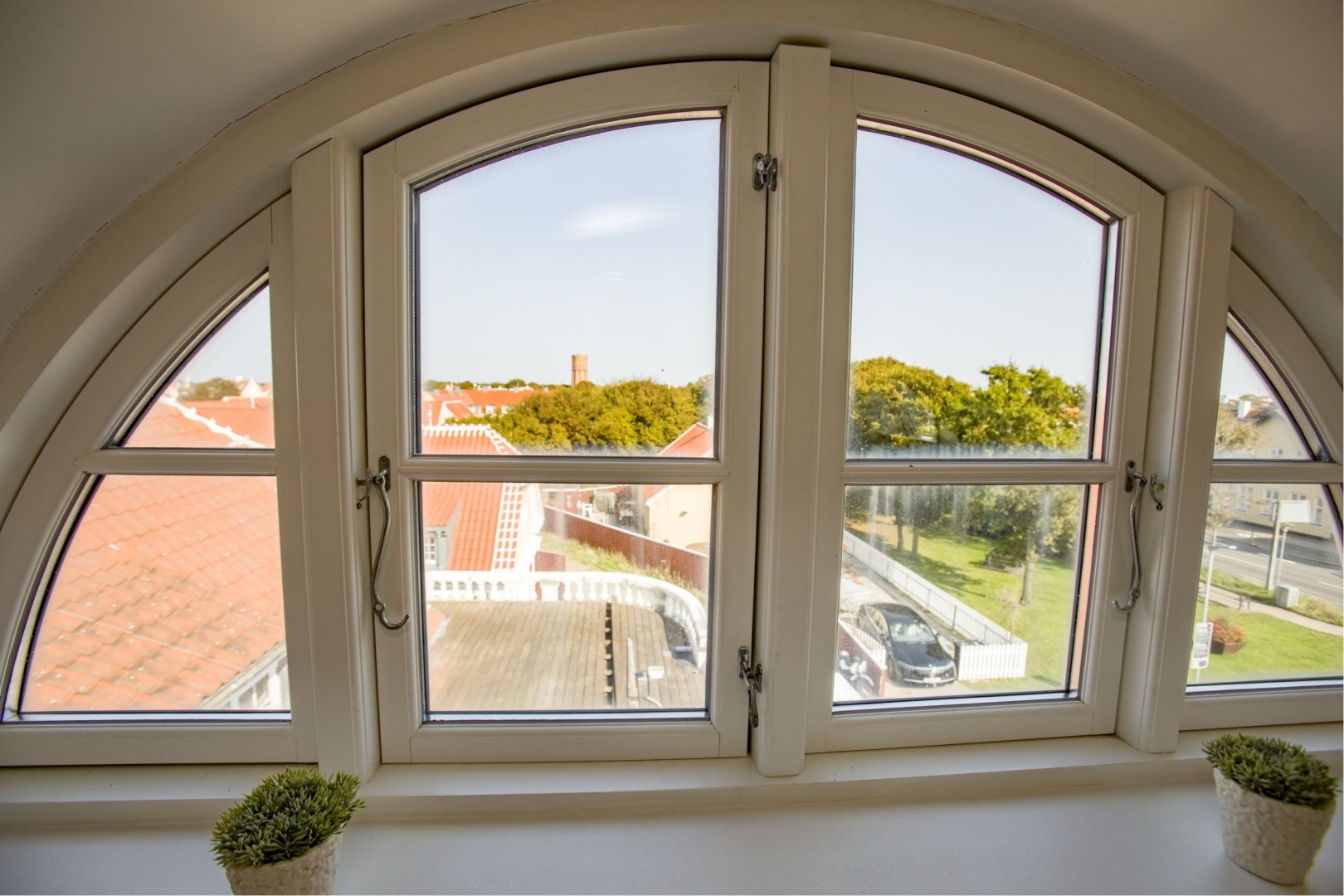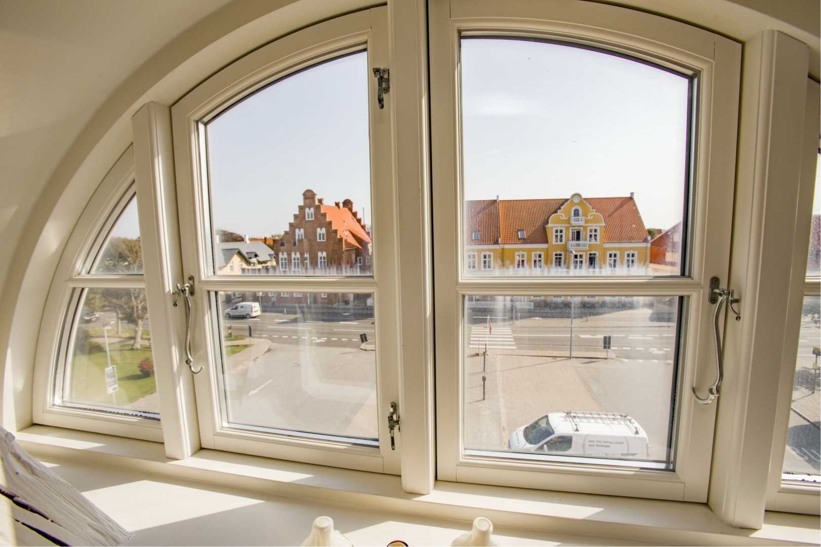 På anden sal finder du en rummelig stue med smukke synlige bjælker, trægulv og karakteristiske rundbuede vinduer, der indrammer en spektakulær udsigt over Skagen. Her kan du beundre ikoniske vartegn som vandtårnet, kirketårnet, Det Grå Fyr og den smukke horisont. Lejligheden byder også på udsigt til kulturhuset Kappelborg, Skagen Hotel og Nordjyske Bank.
