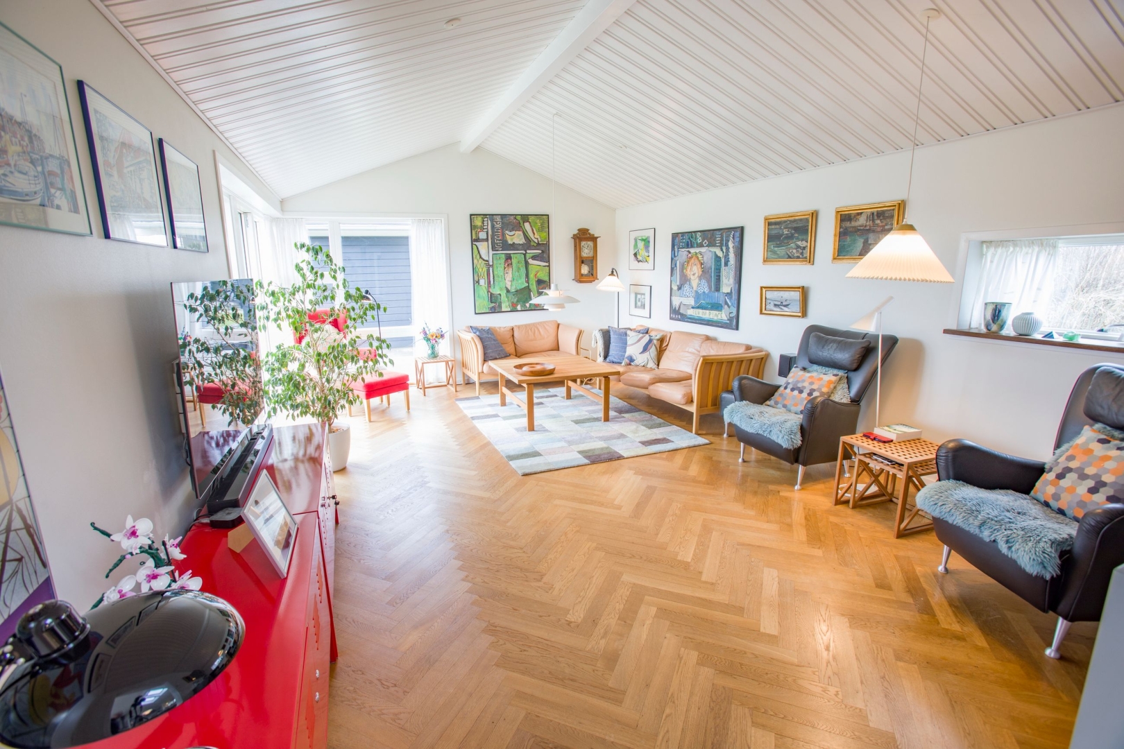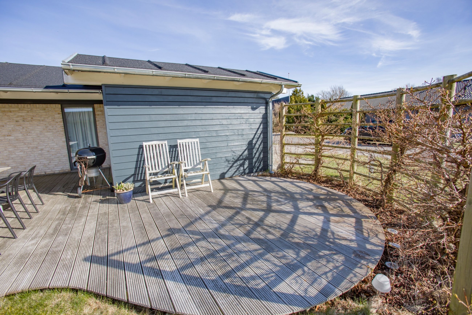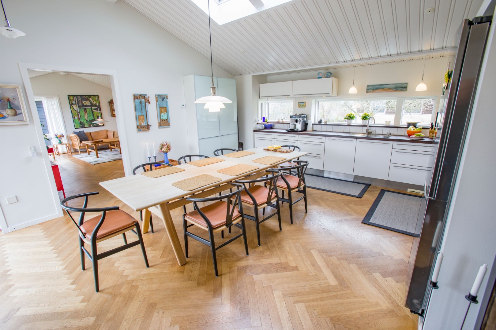 Indretning: Entre, Soveværelse med skydedørsskabe og udgang, 2 gode værelser med udgange. Den lyse stue med sildebensparket åbner op til et stilfuldt køkken, hvor du kan nyde både madlavning og samvær. Her er også brændeovn, spiseplads, ovenlysvinduer og direkte udgang til den sydvestvendte terrasse. Den anvendelige walk-in garderobe og de to moderne badeværelser giver villaen et luksuriøst præg, og et praktisk bryggers sikrer ekstra opbevaringsplads og funktionalitet.