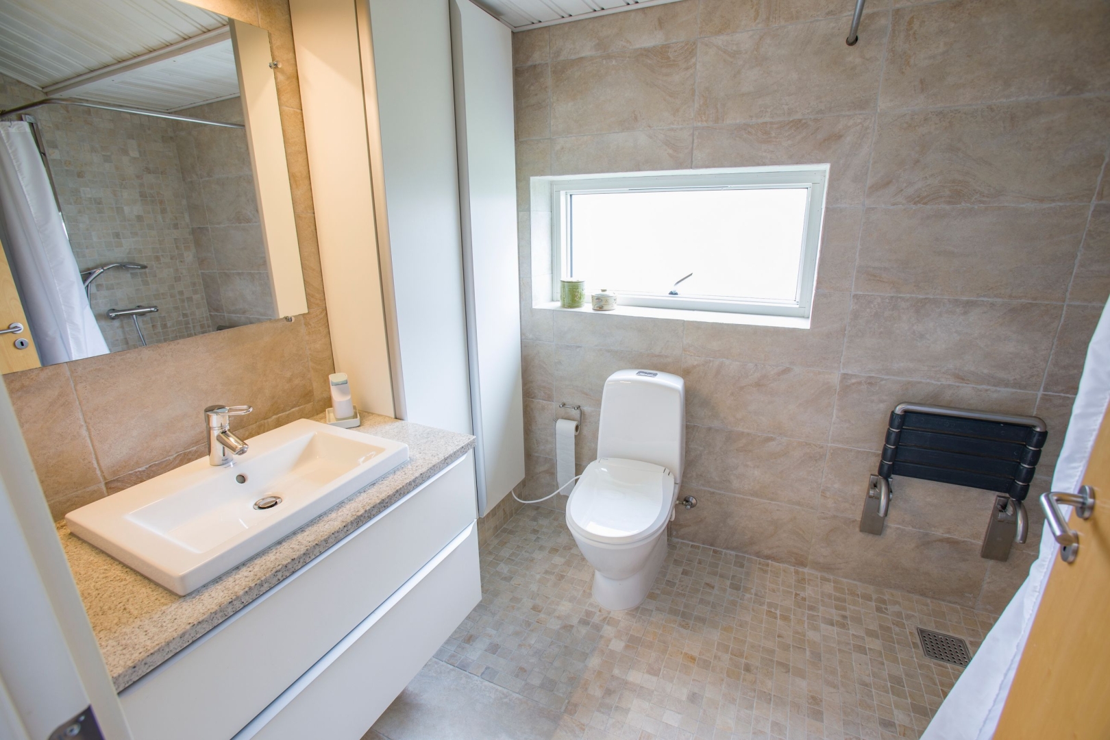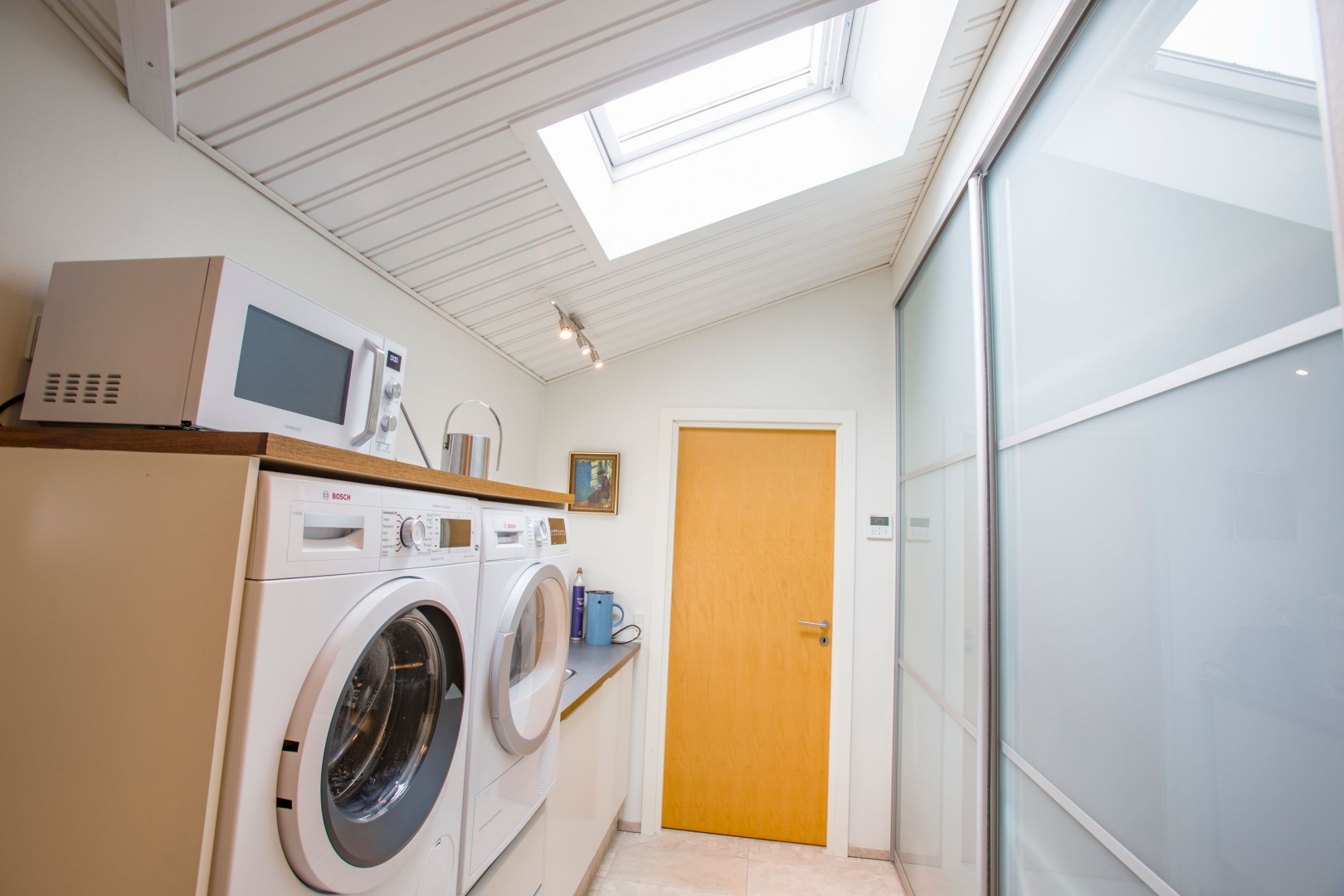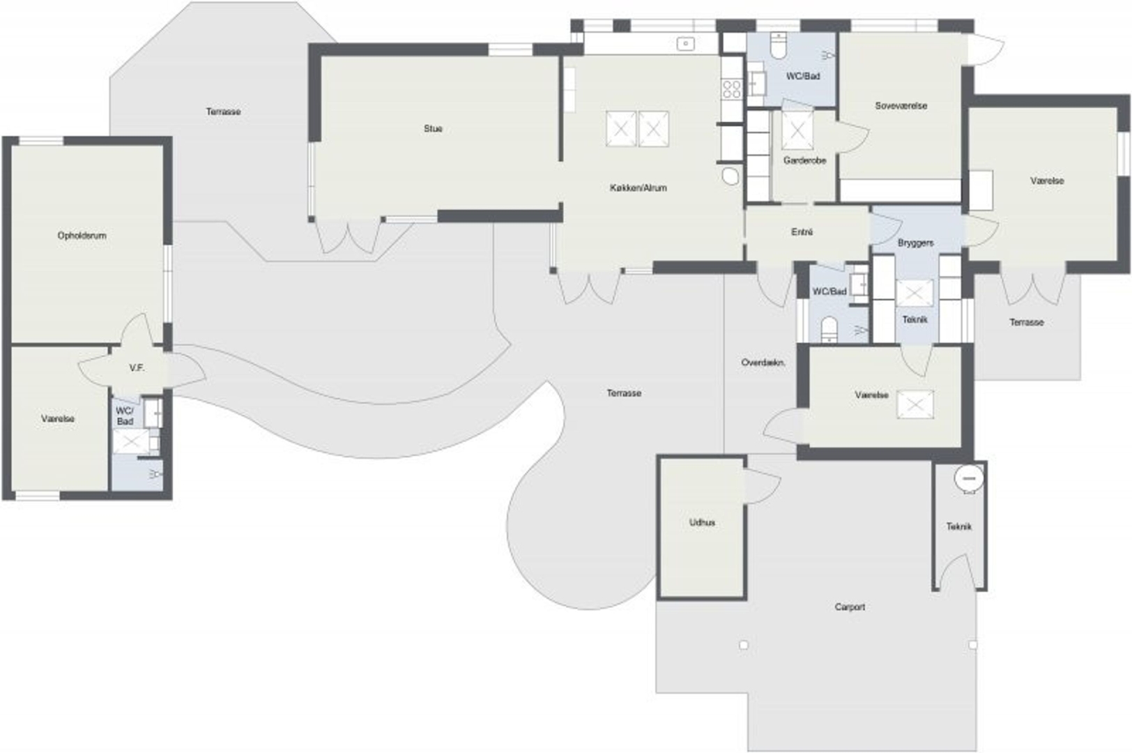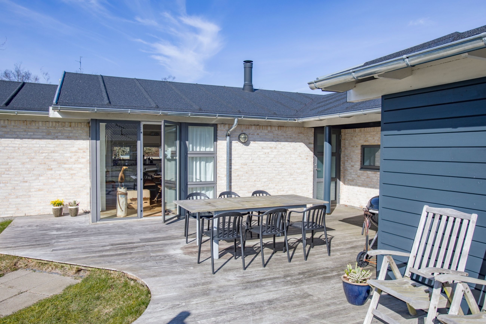 Indretning: Entre, Soveværelse med skydedørsskabe og udgang, 2 gode værelser med udgange. Den lyse stue med sildebensparket åbner op til et stilfuldt køkken, hvor du kan nyde både madlavning og samvær. Her er også brændeovn, spiseplads, ovenlysvinduer og direkte udgang til den sydvestvendte terrasse. Den anvendelige walk-in garderobe og de to moderne badeværelser giver villaen et luksuriøst præg, og et praktisk bryggers sikrer ekstra opbevaringsplads og funktionalitet.