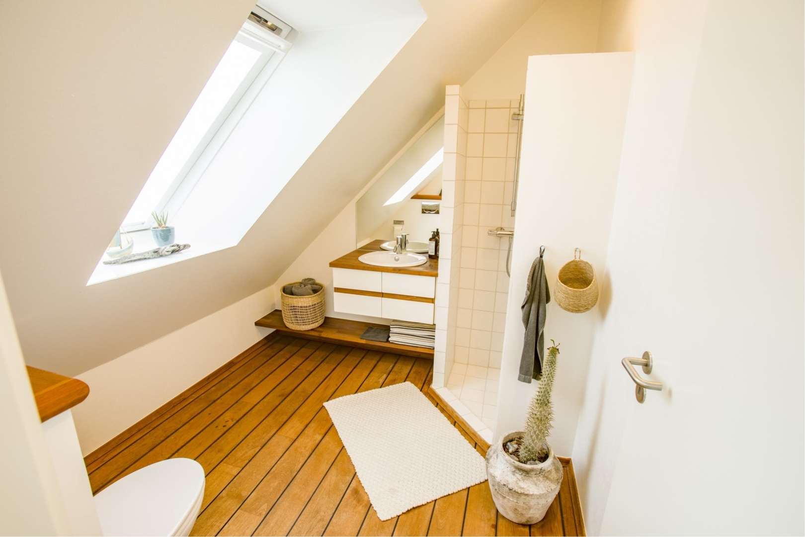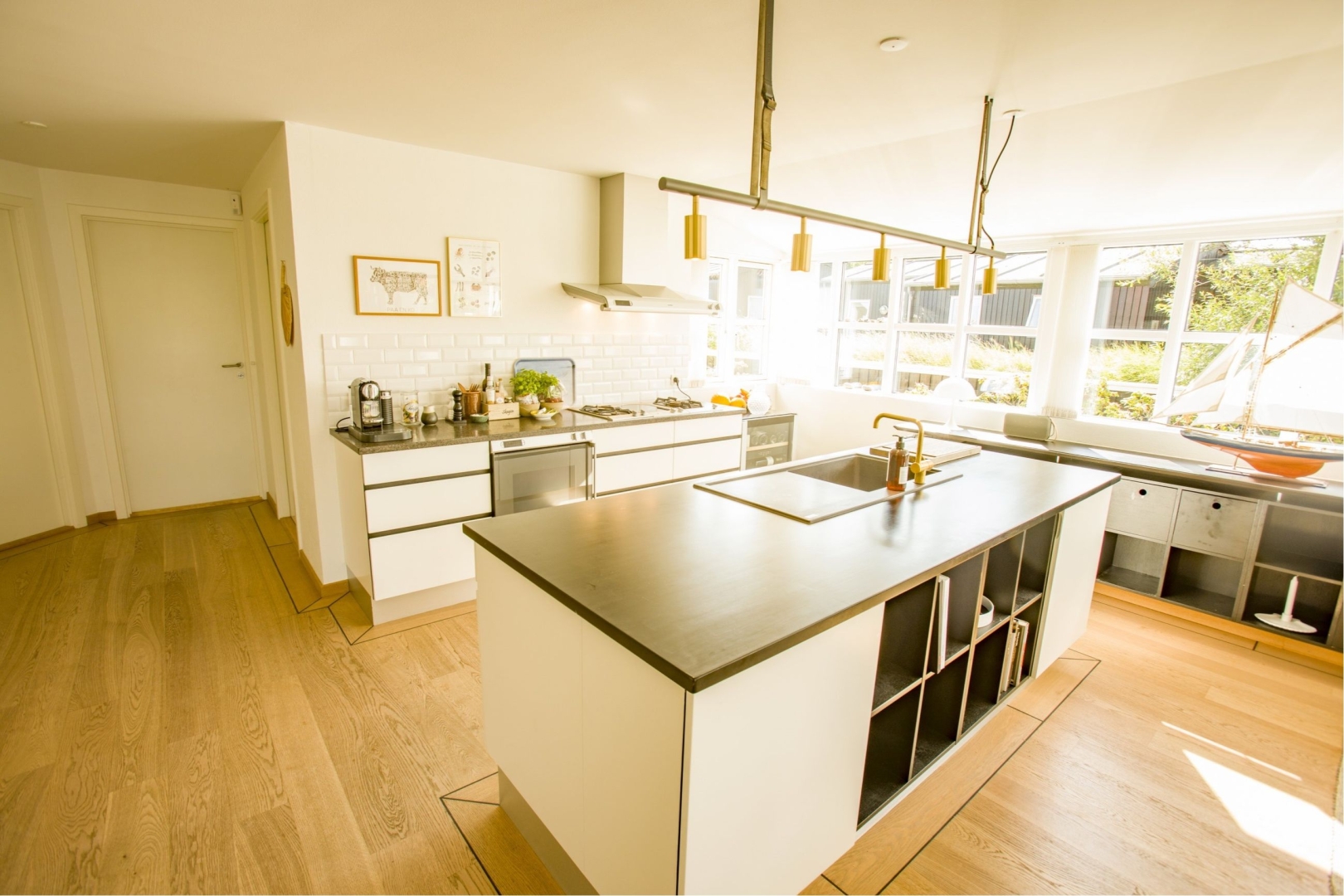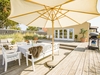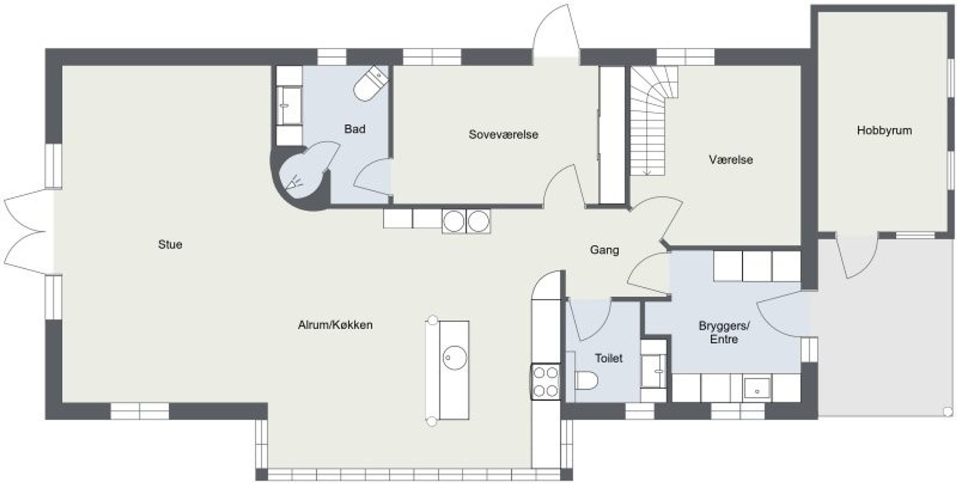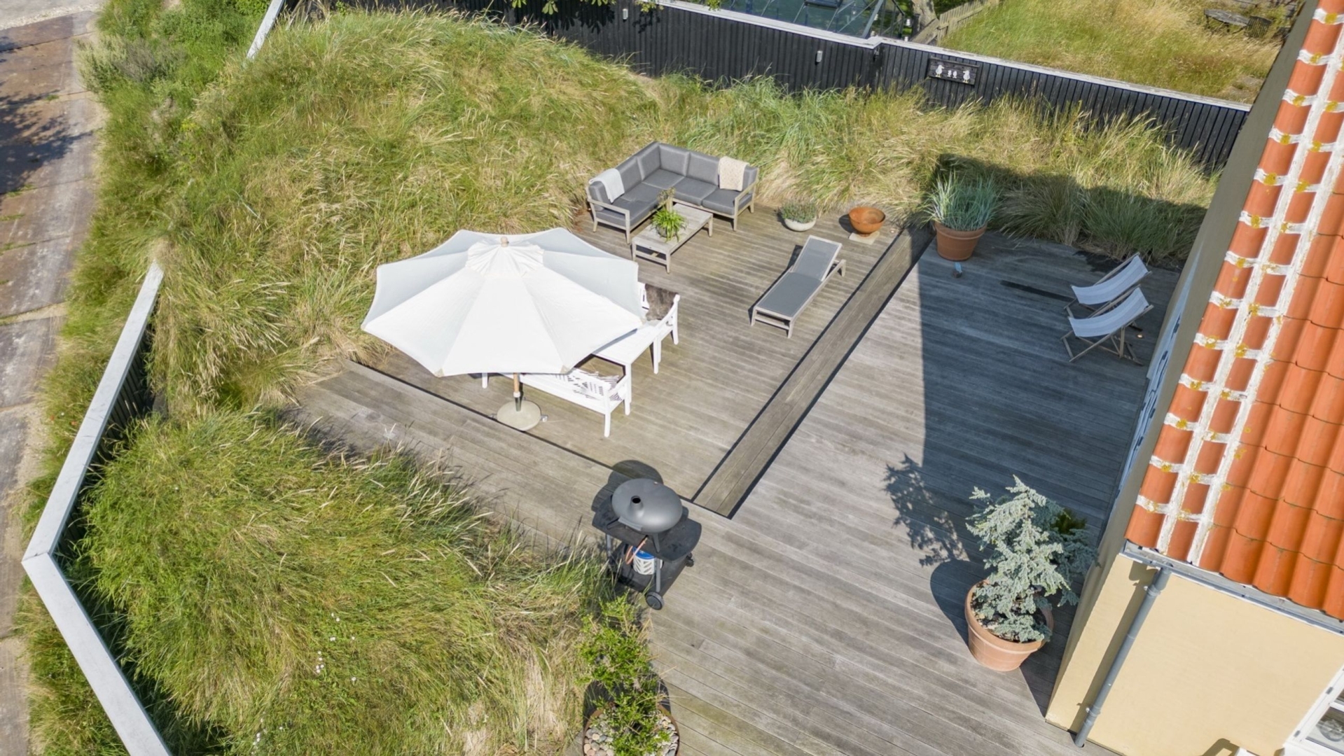 I stueplan bydes du velkommen af et praktisk bryggers, der fører videre til husets hjerte. Her finder du et smukt køkken badet i sollys fra den store syd karnap, hvor solens stråler danser på overfladerne. Køkkenet åbner op til en spiseplads og videre ind i en charmerende stue med store vinduespartier mod vest. Fra stuen er der direkte adgang til husets juvel: en stor træterrasse delvist nedsænket i en naturskøn gryde med marehalm rundtom - et sandt fristed for afslapning og samvær.