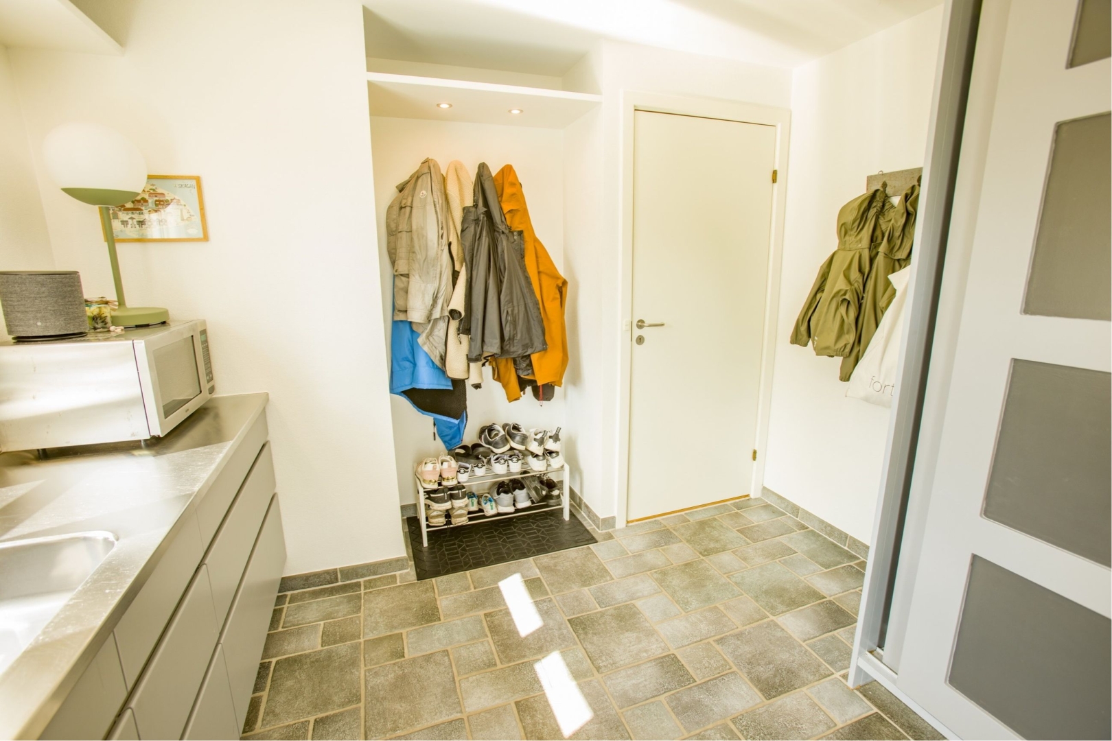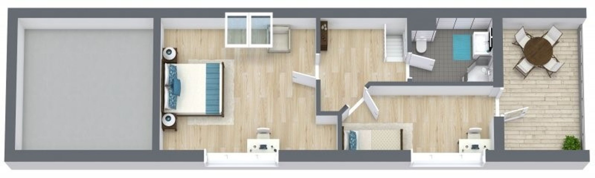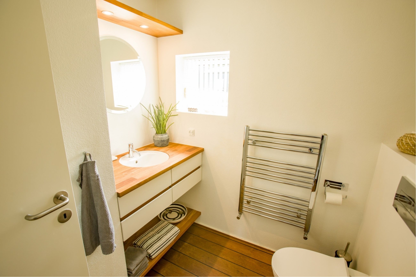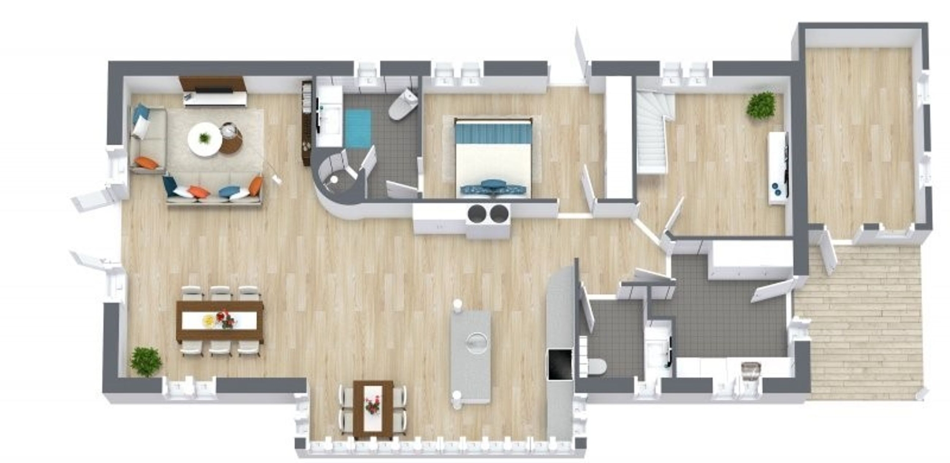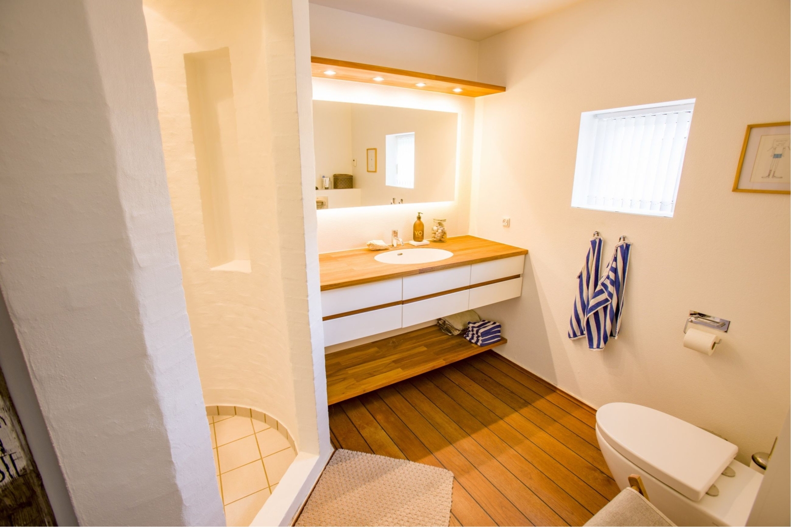 I stueplan bydes du velkommen af et praktisk bryggers, der fører videre til husets hjerte. Her finder du et smukt køkken badet i sollys fra den store syd karnap, hvor solens stråler danser på overfladerne. Køkkenet åbner op til en spiseplads og videre ind i en charmerende stue med store vinduespartier mod vest. Fra stuen er der direkte adgang til husets juvel: en stor træterrasse delvist nedsænket i en naturskøn gryde med marehalm rundtom - et sandt fristed for afslapning og samvær.