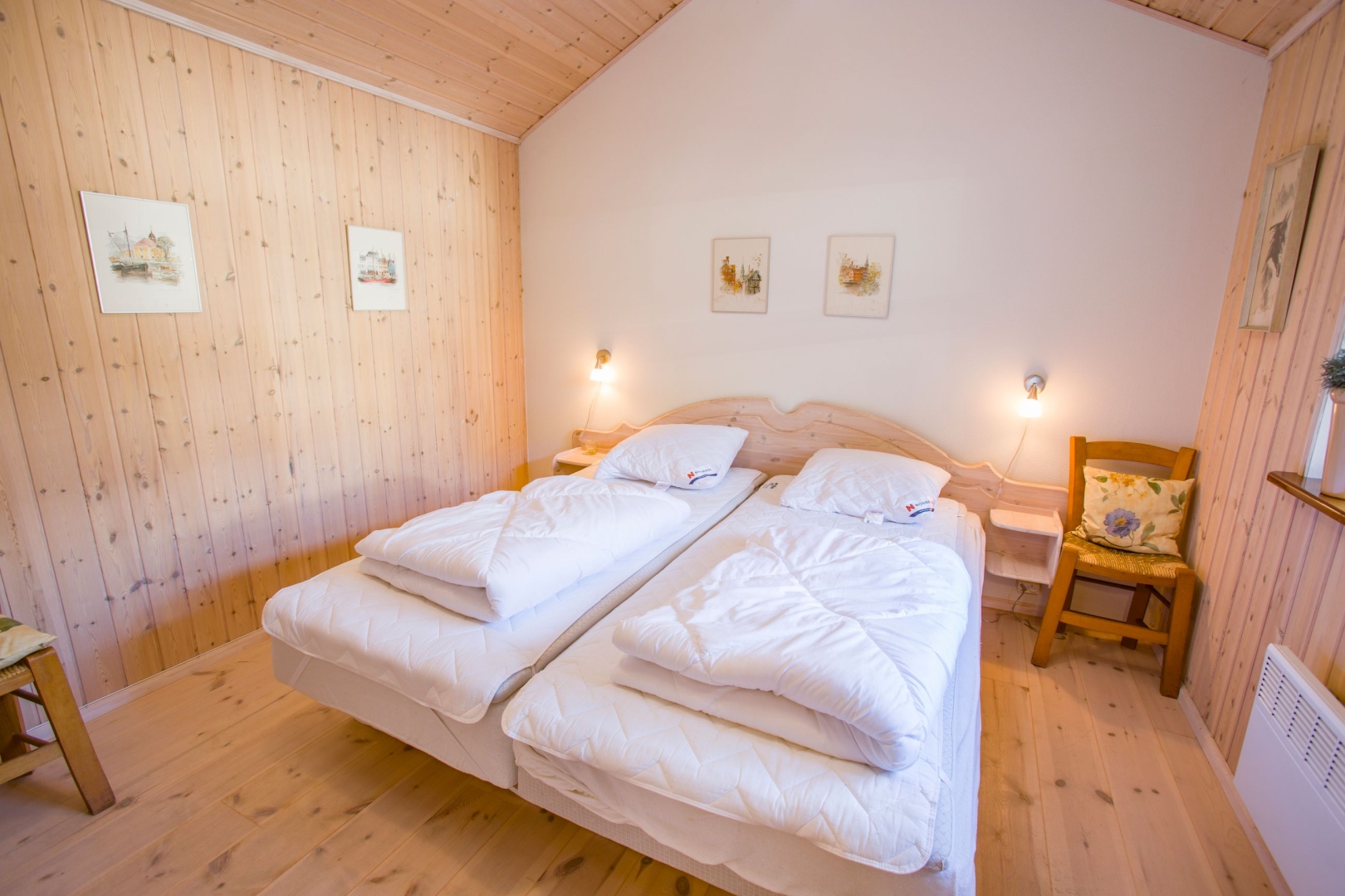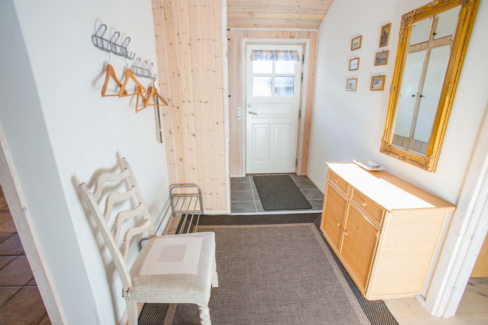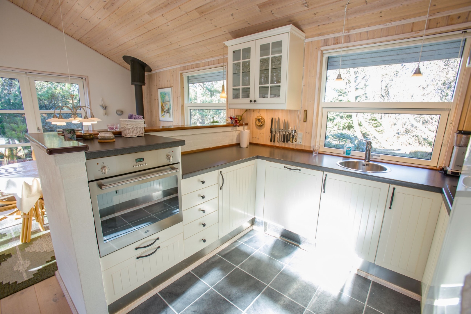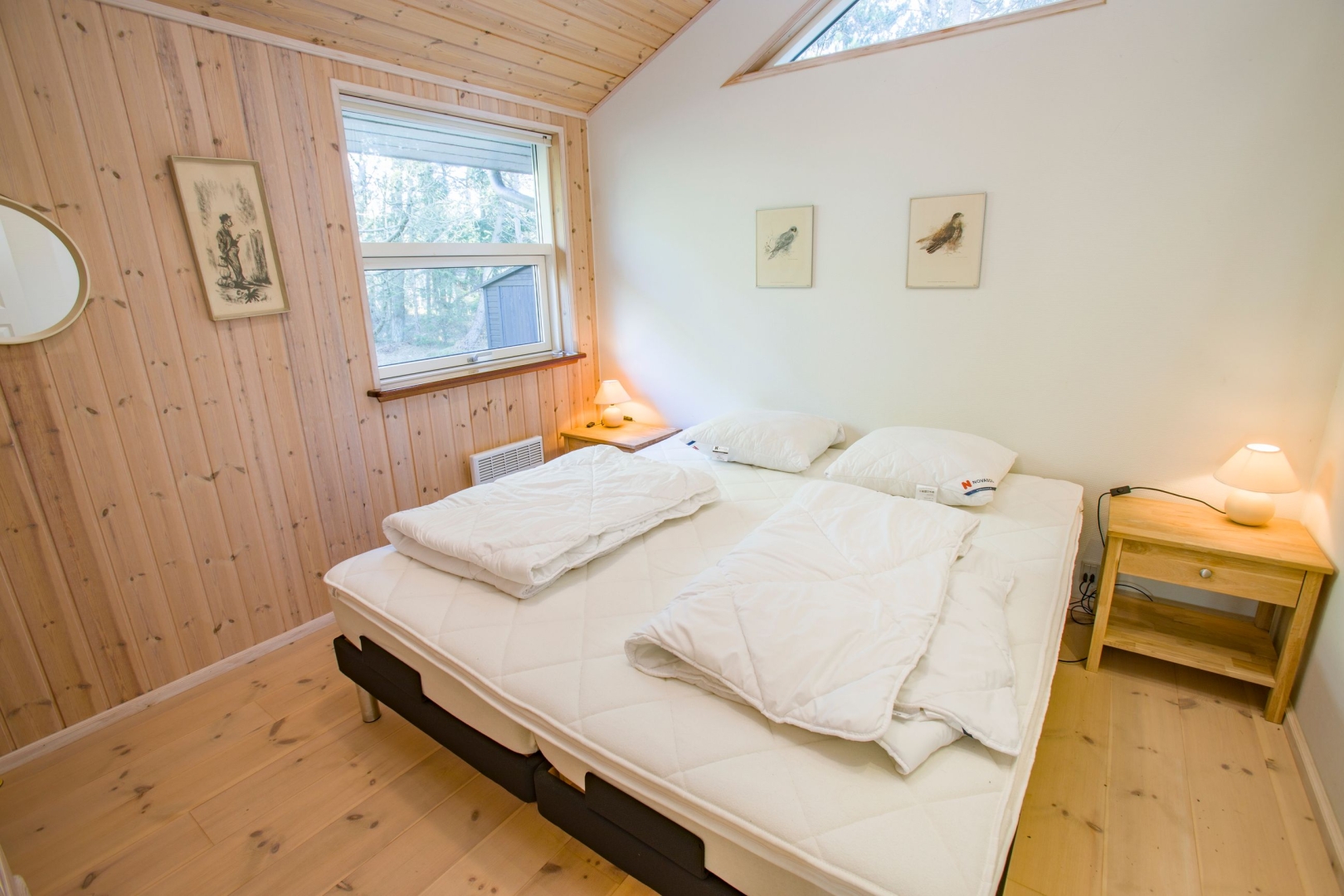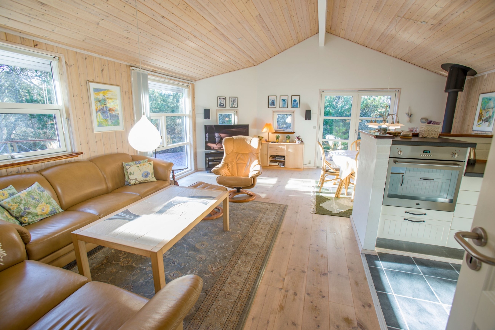Indenfor får du en funktionel og lys indretning, der består af: En indbydende entré med klinkegulv - Et hyggeligt værelse med to senge - Et rummeligt soveværelse med elevationsseng, skabe og loft til kip - Et moderne badeværelse med bruseniche, el-gulvvarme og hjørnespa perfekt til afslapning efter en lang dag - En dejlig stue og spiseplads i ét, med en varmepumpe og brændeovn, samt udgang til terrassen, der giver direkte adgang til den smukke natur - Et funktionelt køkken med alt hvad du behøver for at lave lækre måltider.
