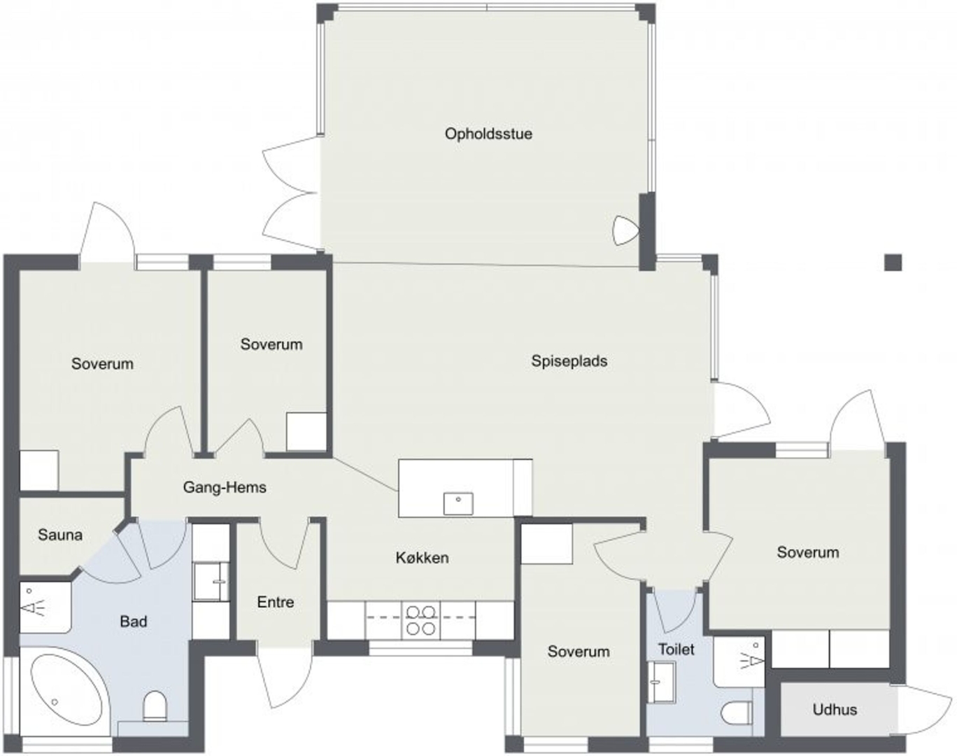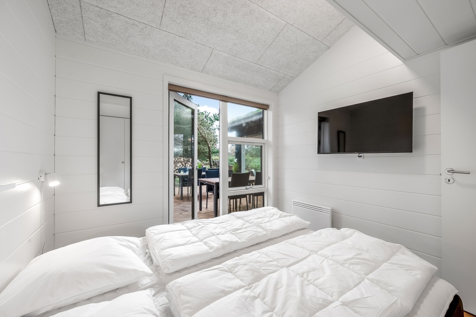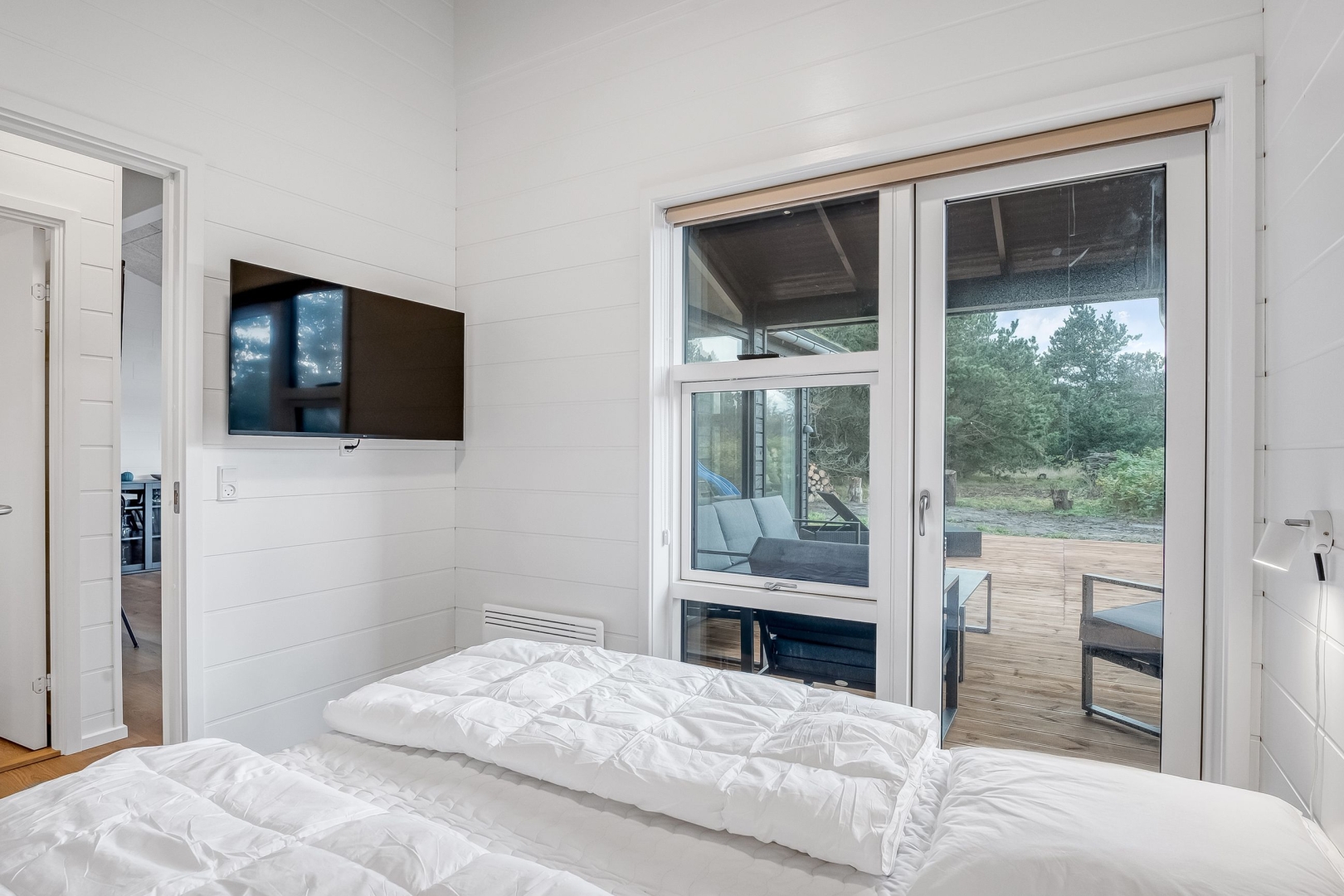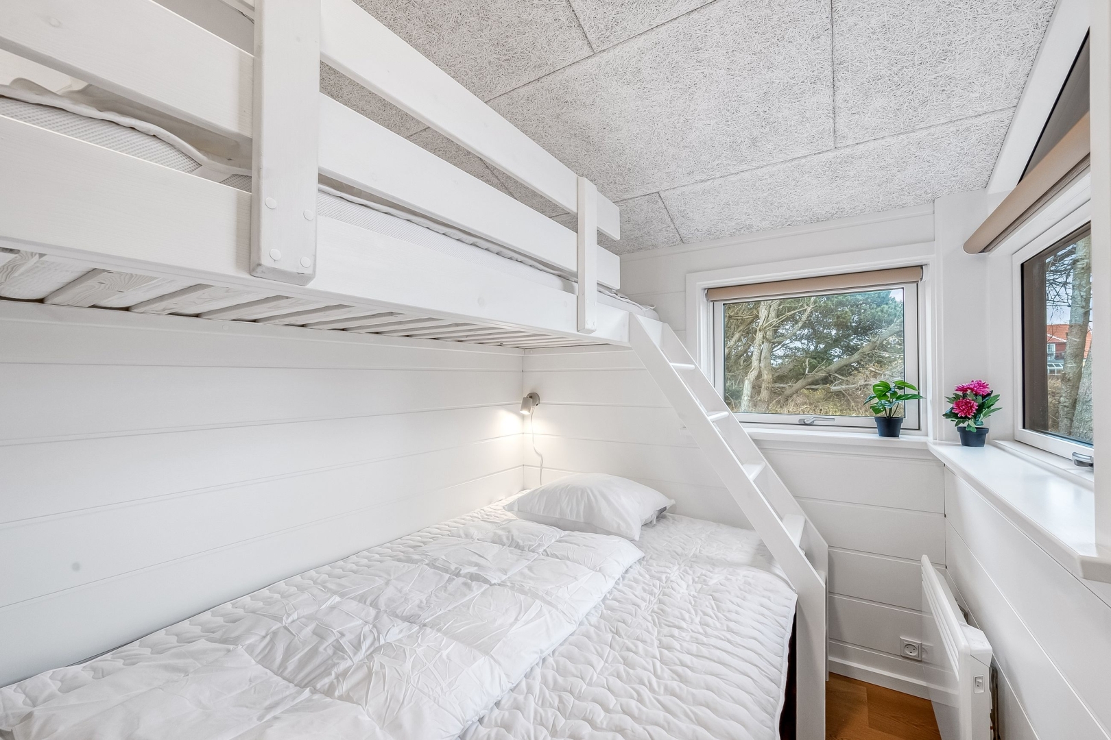 Et andet køjeværelse med 3/4 seng i bunden og skab giver ekstra sovepladser, og der er et gæstebadeværelse med bruseniche, el-gulvvarme og væghængt toilet. Endelig finder du et ekstra soveværelse med skabe og udgang til den overdækkede vestterrasse, som giver mulighed for at nyde de lyse sommeraftener.