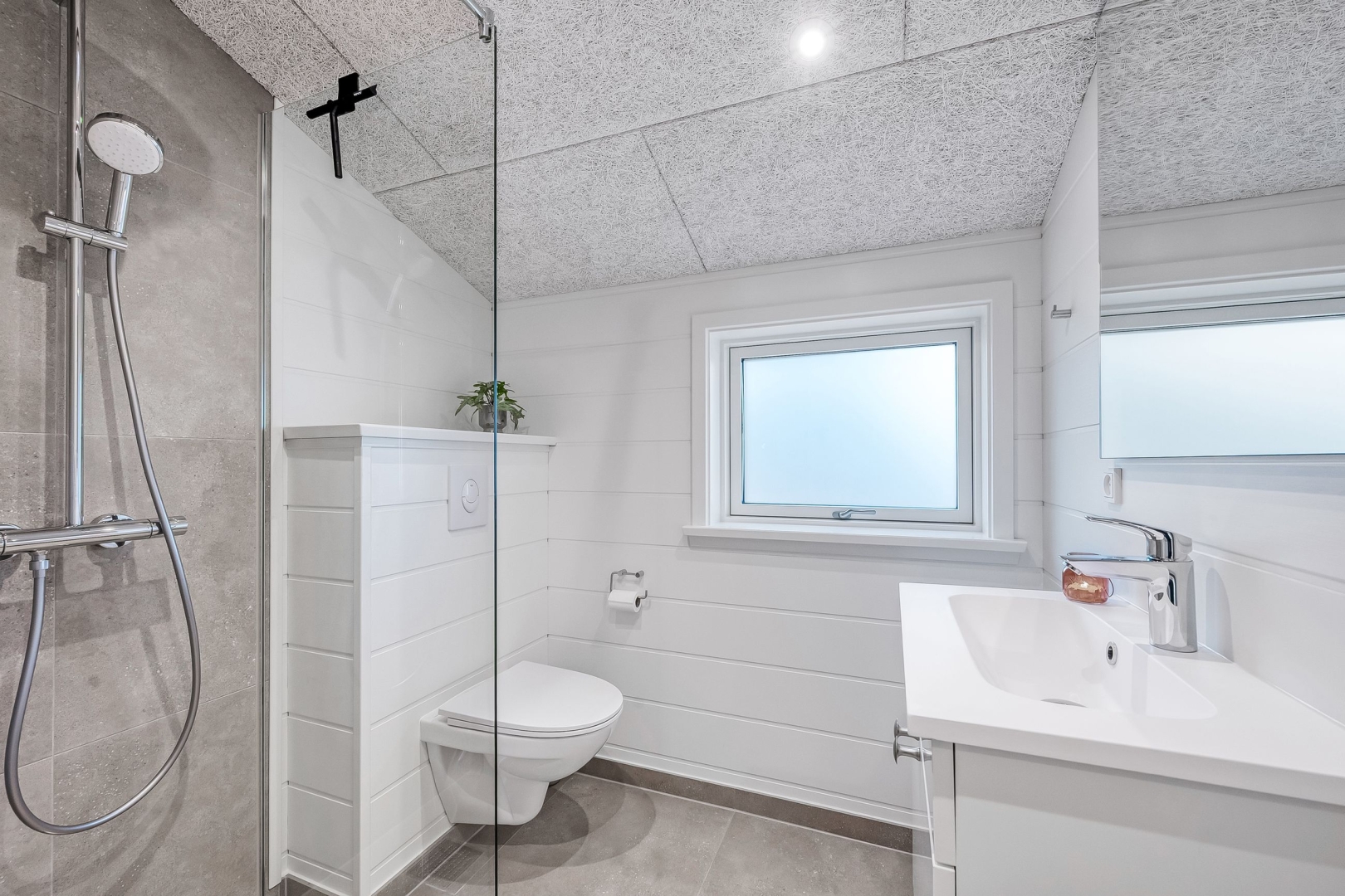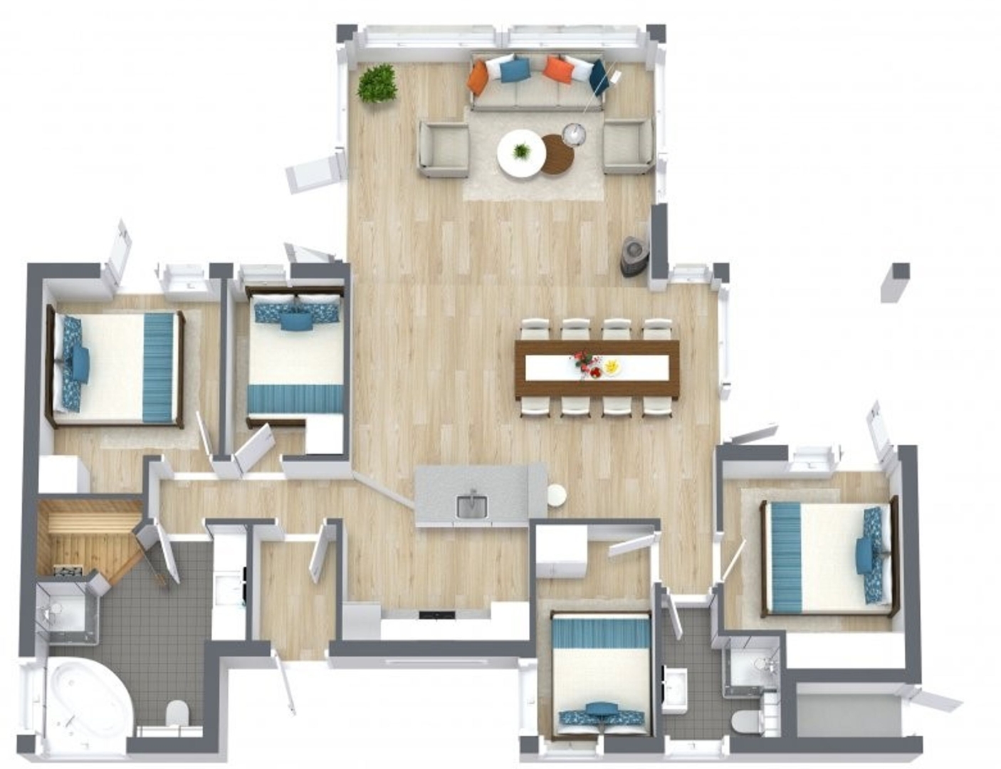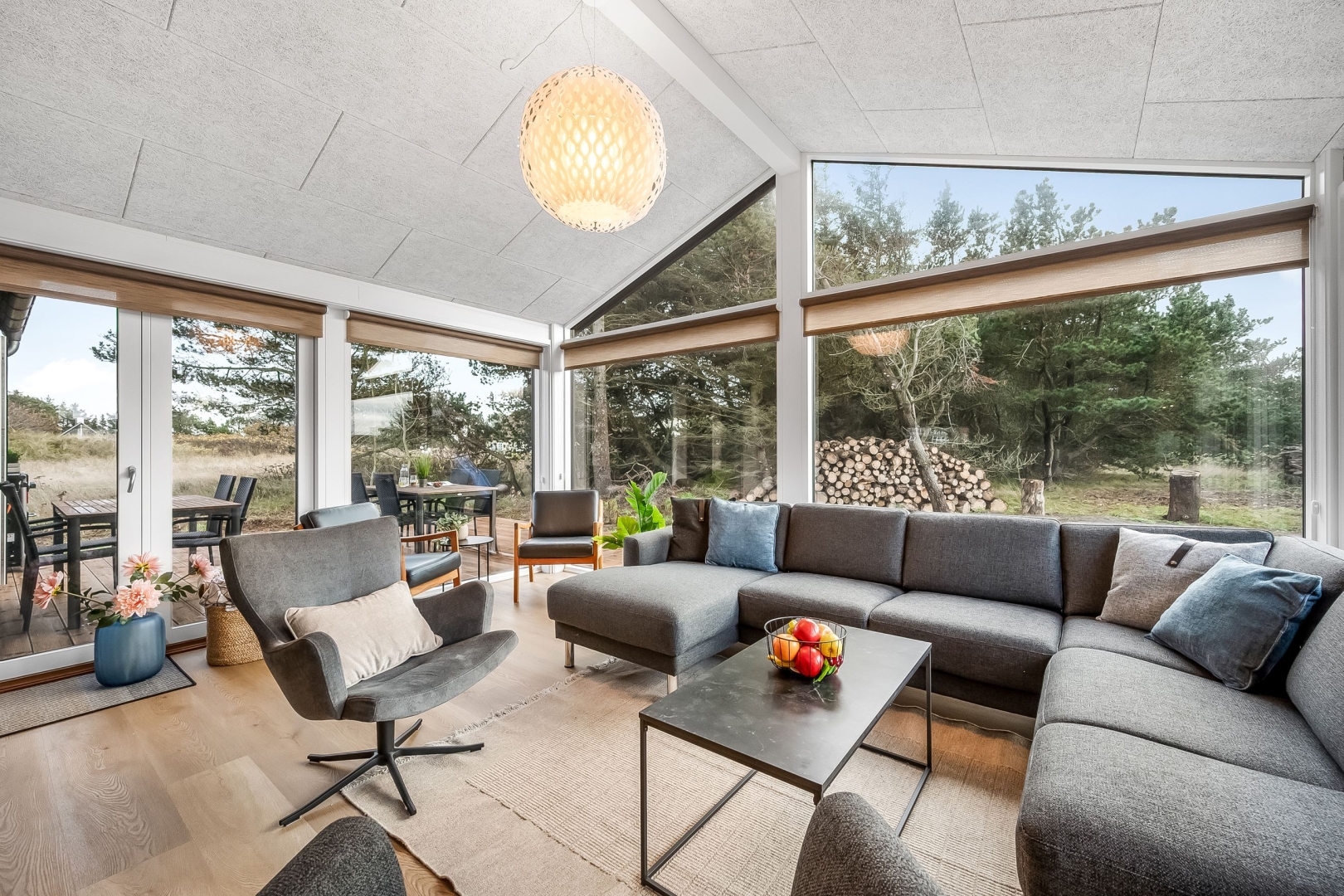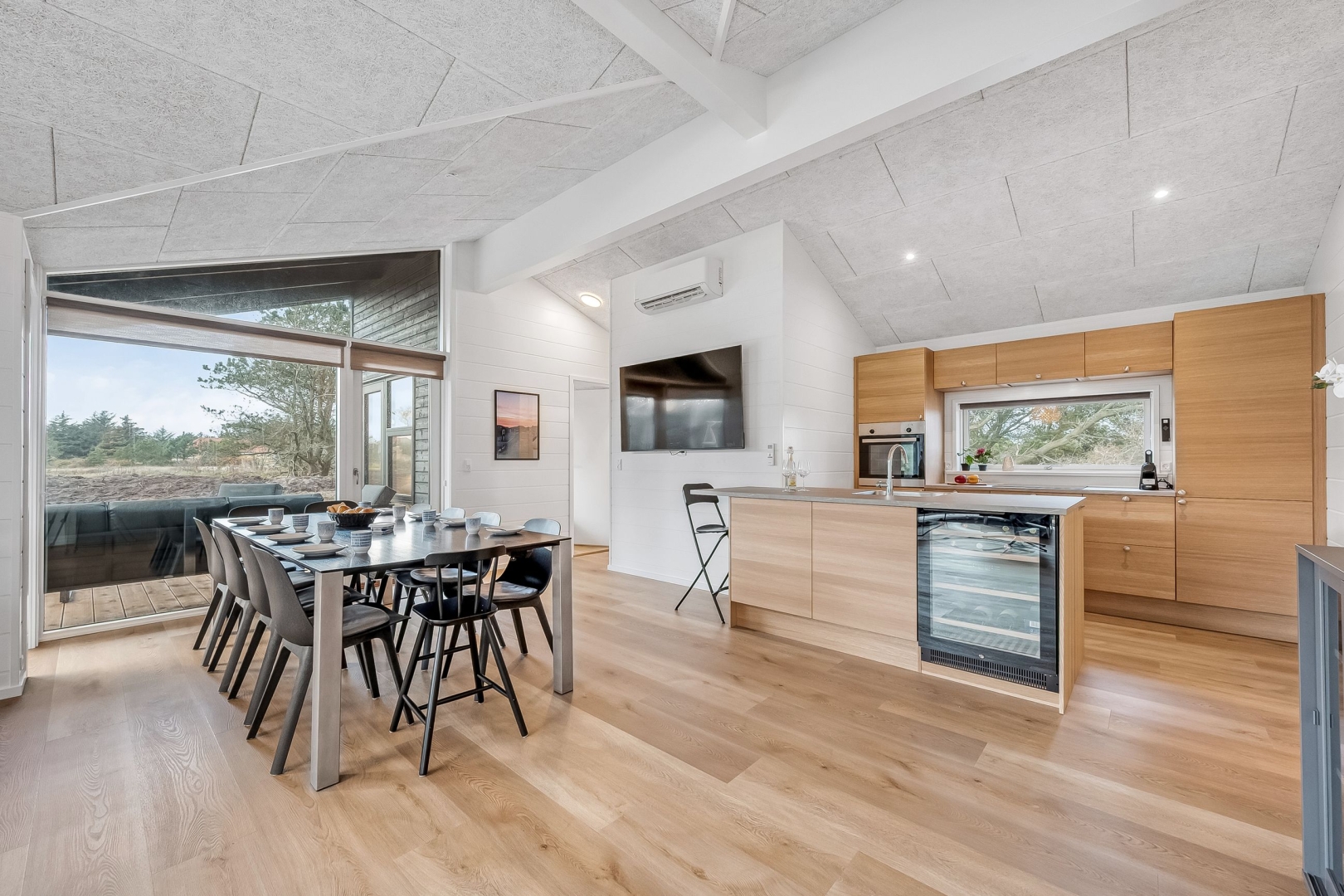 Et andet køjeværelse med 3/4 seng i bunden og skab giver ekstra sovepladser, og der er et gæstebadeværelse med bruseniche, el-gulvvarme og væghængt toilet. Endelig finder du et ekstra soveværelse med skabe og udgang til den overdækkede vestterrasse, som giver mulighed for at nyde de lyse sommeraftener.
