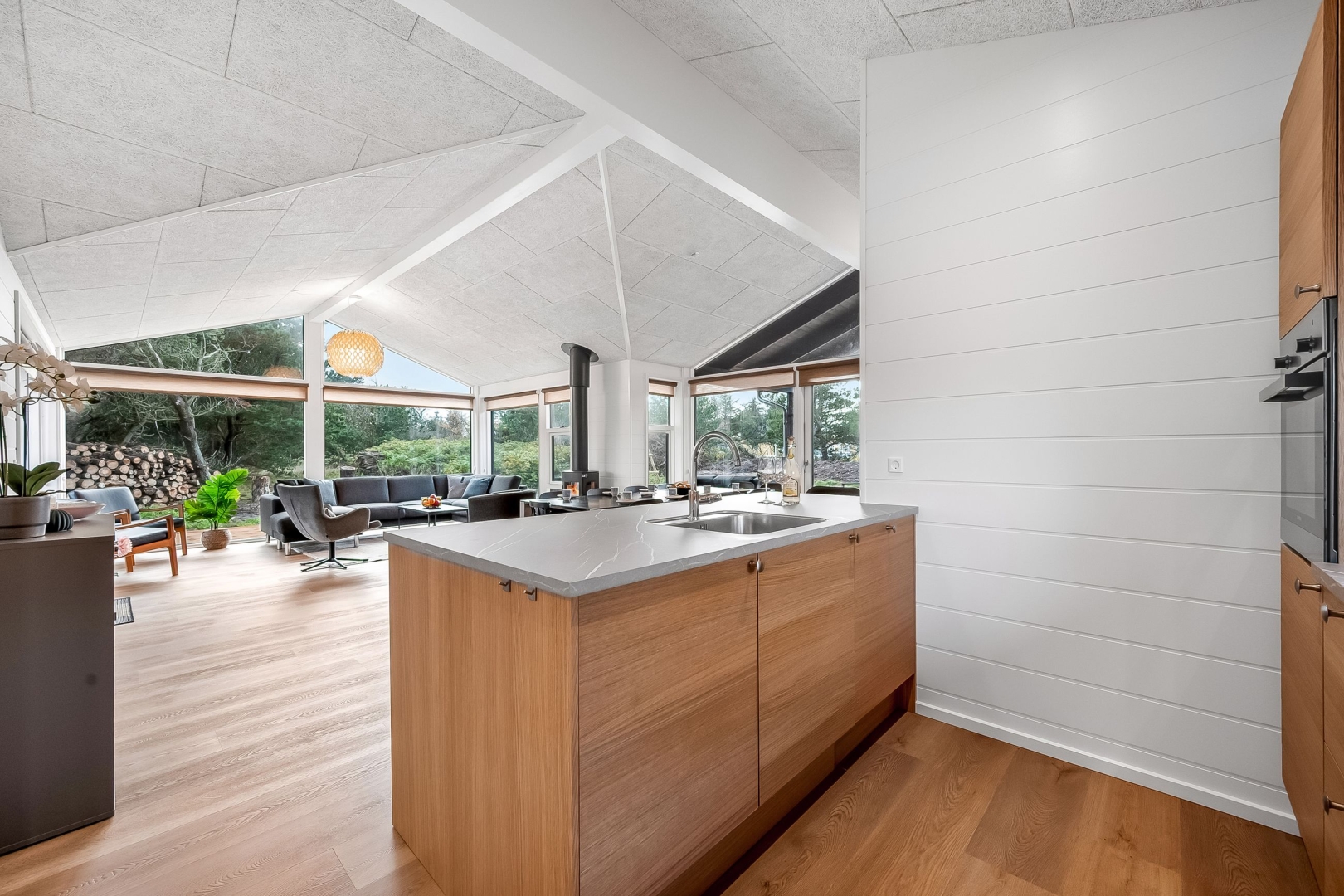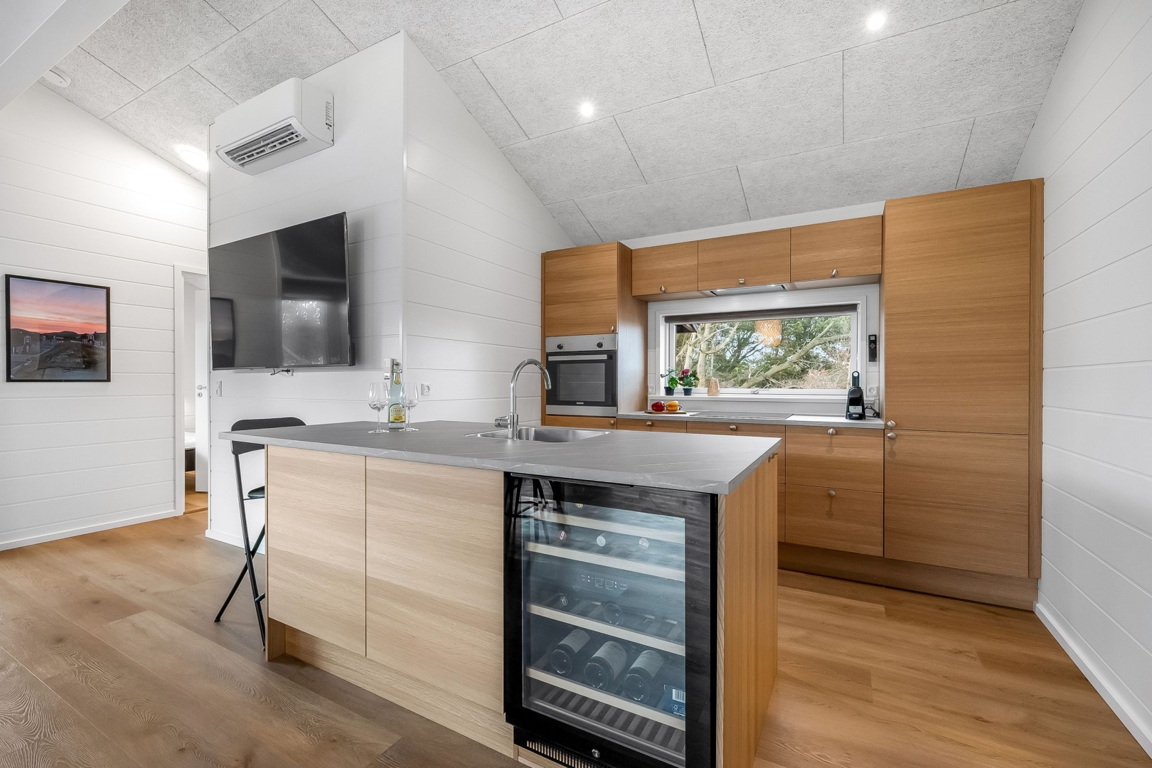 Husets soveværelse er indrettet med gode skabe og har direkte adgang til en solrig morgen terrasse. Derudover finder du et hyggeligt køjeværelse med en 3/4 seng i bunden og et skab. Det veludstyrede køkken er udført med smukke trælåger og et vinkøleskab, og åbner op til den store stue, der har et fantastisk lysindfald. Stuen byder på en brændeovn, god spiseplads og en varmepumpe, der sørger for komfort hele året. Fra stuen er der udgang til den sydvendte terrasse, samt en overdækket vestvendt terrasse, hvor du kan nyde solnedgangen.