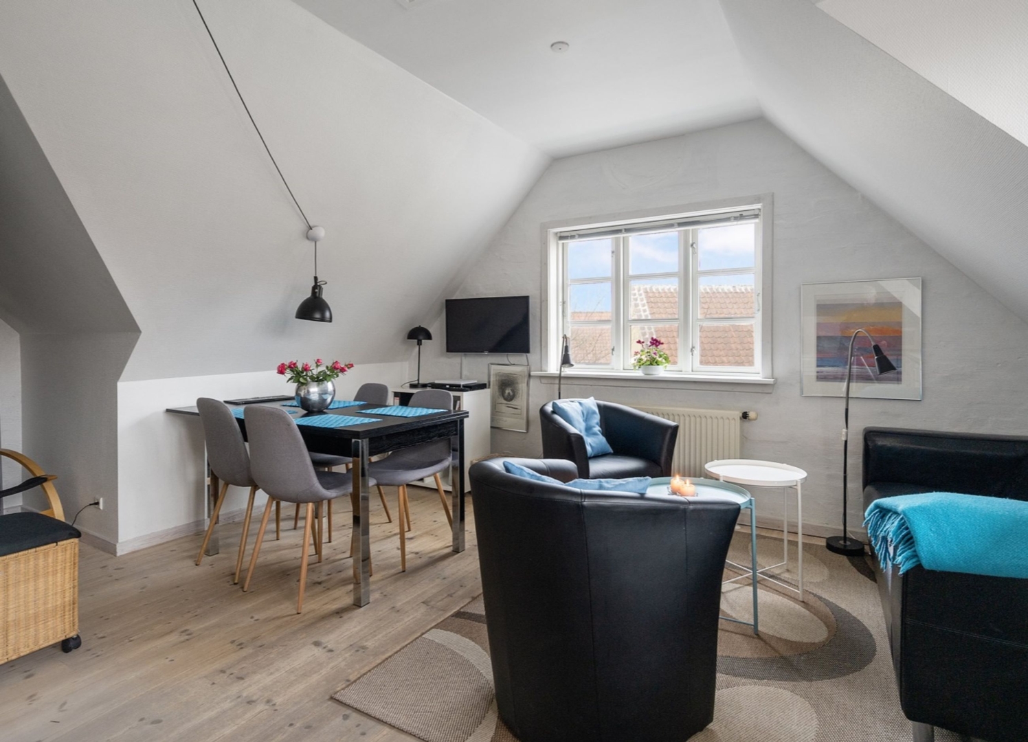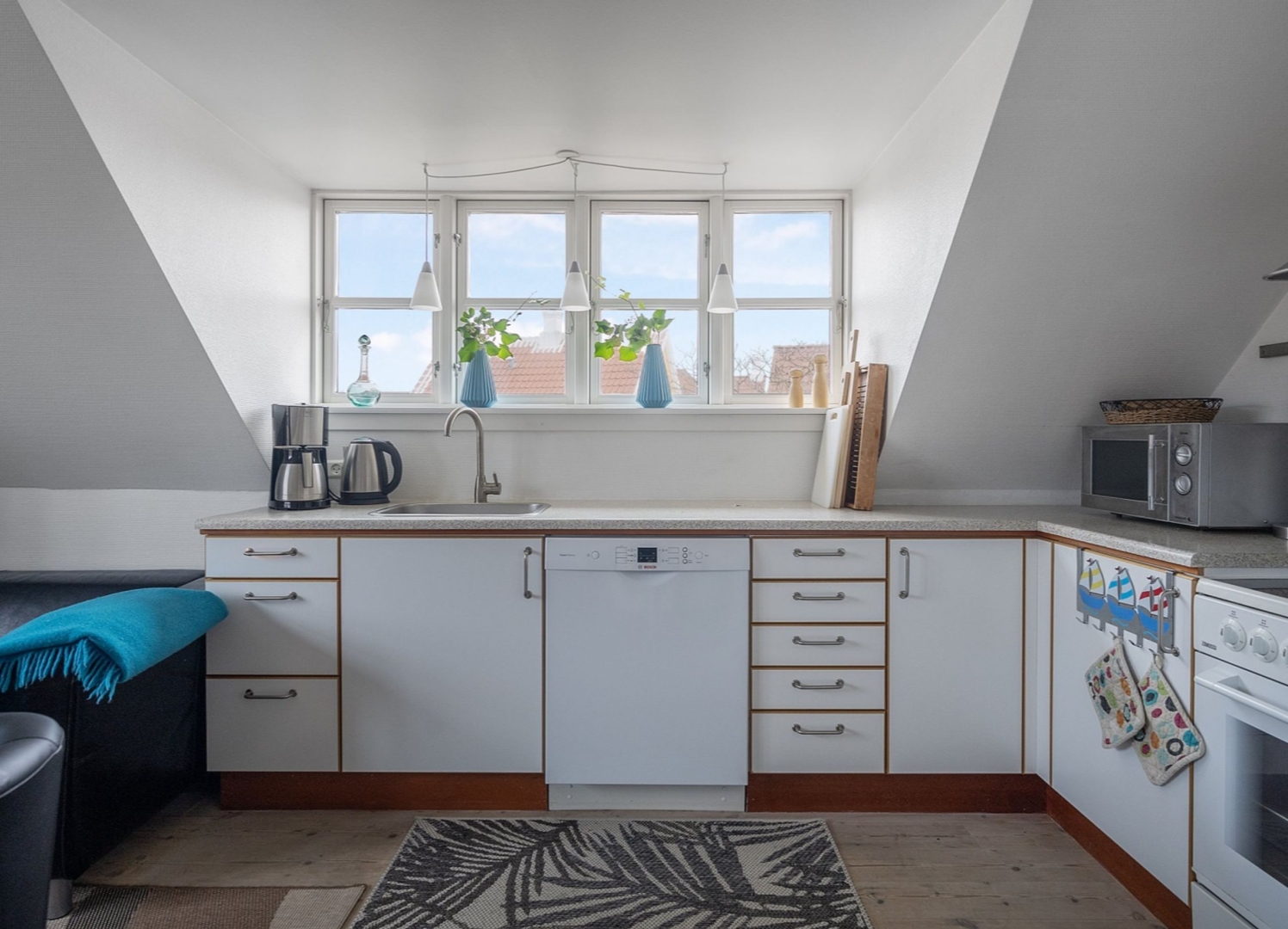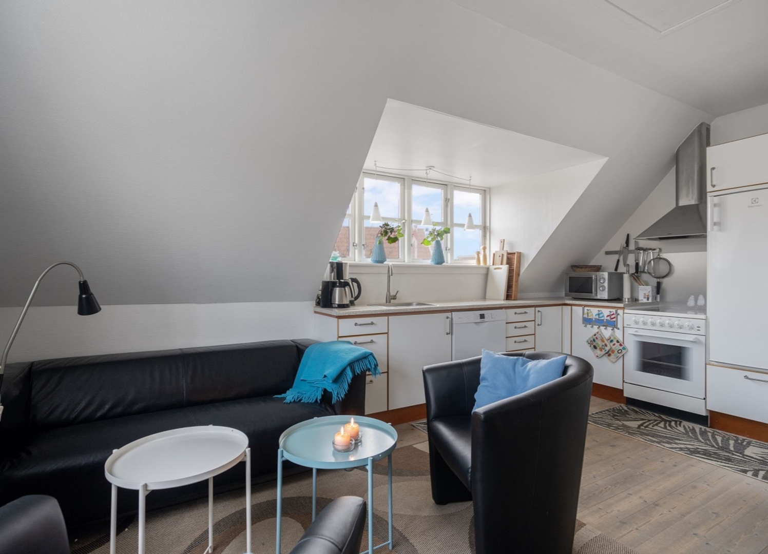 Køkken, stue og spiseplads er åbne og lyse med god plads til et spisebord til 4 personer, hvilket gør det til det perfekte samlingspunkt. Fra kvisten ud fra køkkenet får man et flot kig over byens tage, mens stuen med et gavlvindue giver et skønt udsyn ned til den livlige gågade.