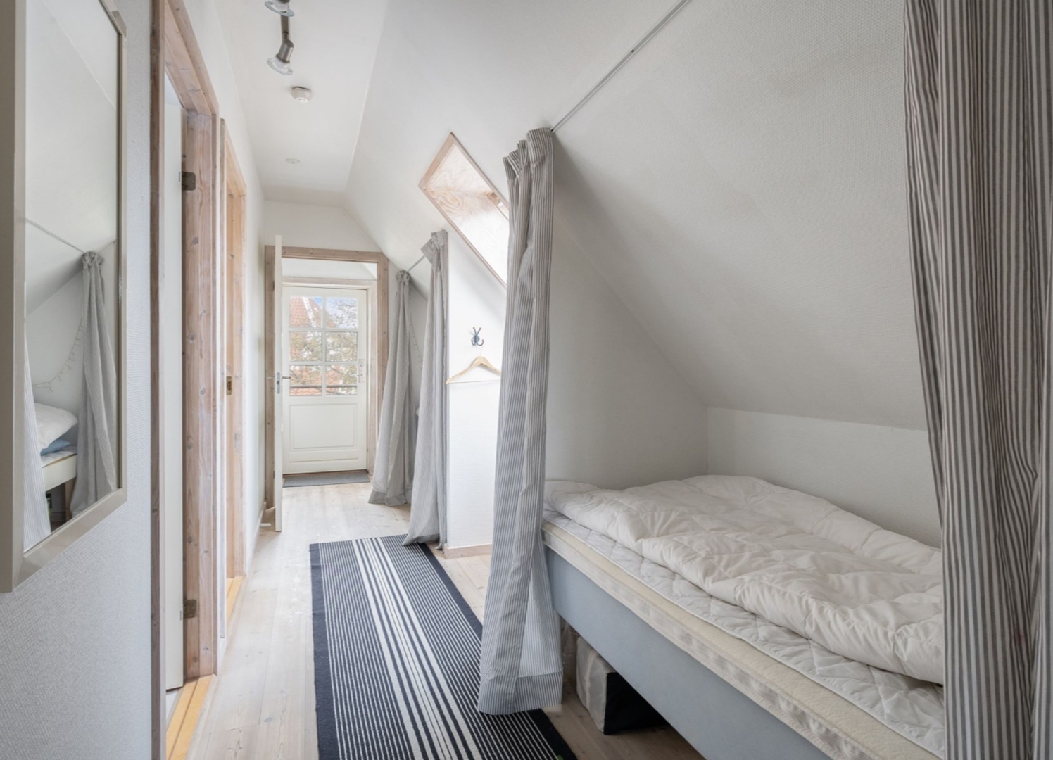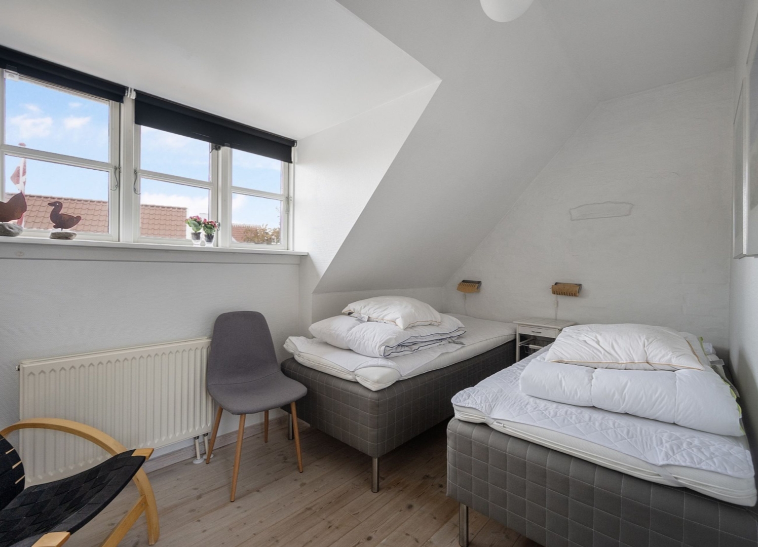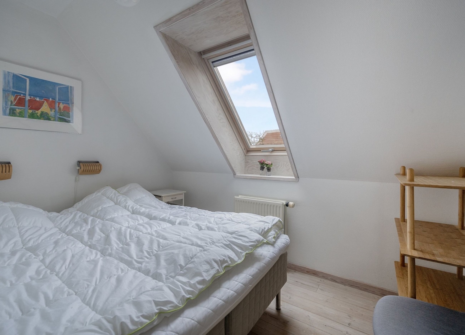Soveværelset har trægulv og Velux vindue, hvilket giver et dejligt lysindfald. Det ekstra værelse med kvist og trægulv kan anvendes til både kontor eller ekstra soveplads og giver et unikt kig til byens liv.