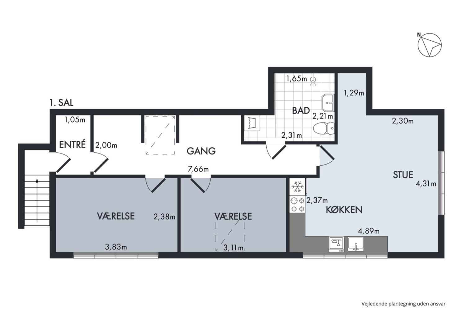 Indretning: Lejligheden byder på en rummelig entré med god plads og en bred gang med to alkover og trægulv. Badeværelset er funktionelt indrettet med bruseniche, toilet, vask og vaskemaskine, mens linoleum på gulv og væg i bruseniche sikrer et praktisk og letvedligeholdt rum.