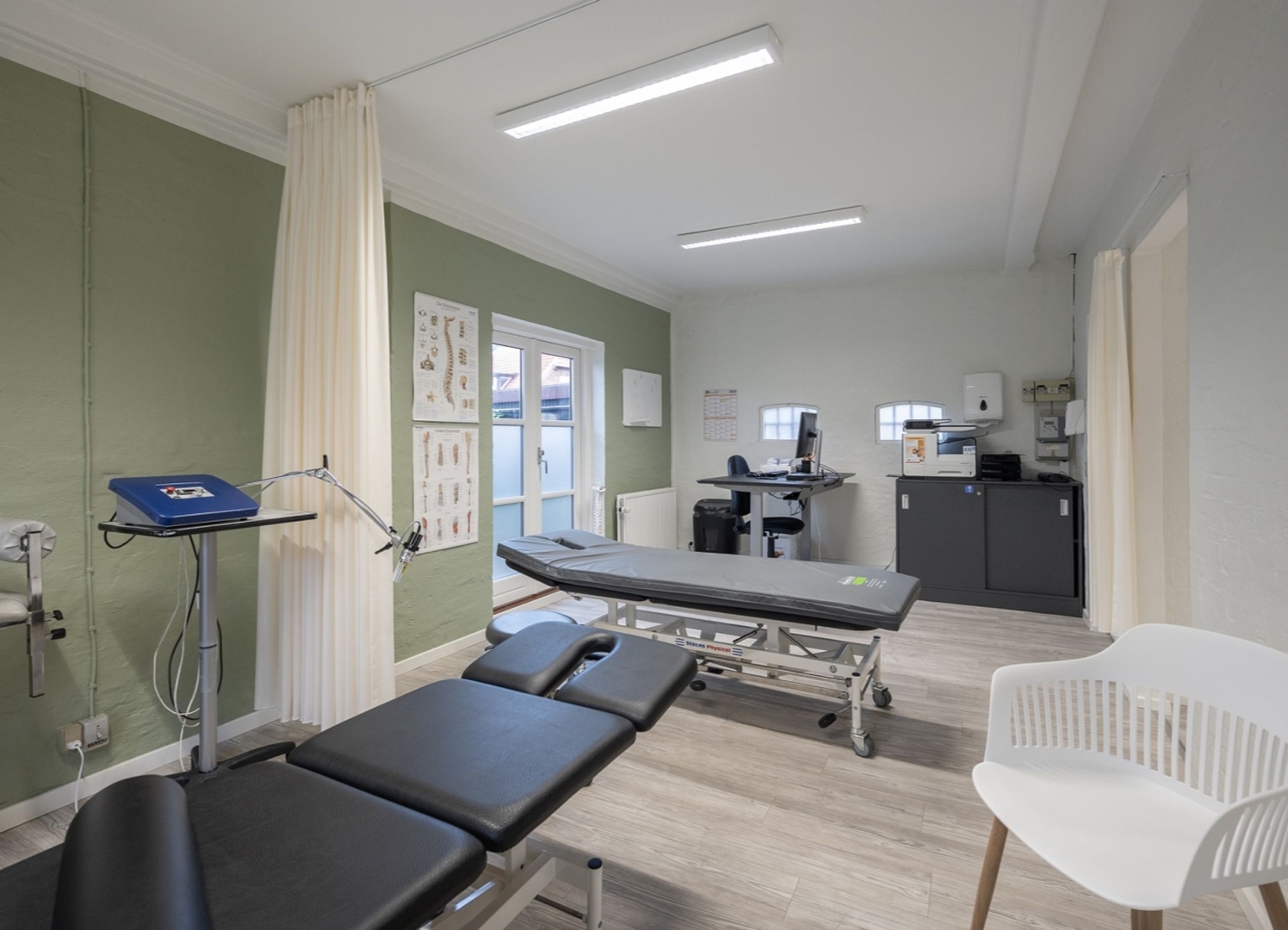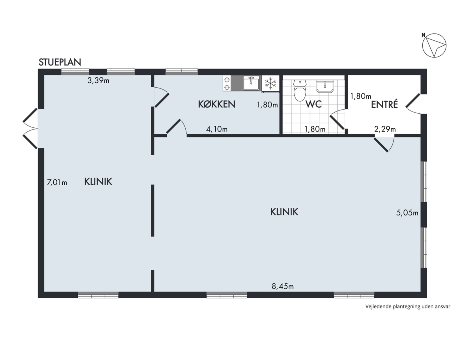 Lejligheden er i øjeblikket indrettet som klinik, hvilket giver en unik mulighed for køberen at tilpasse og indrette boligen præcis efter egne ønsker og behov. Boligen byder på følgende: