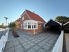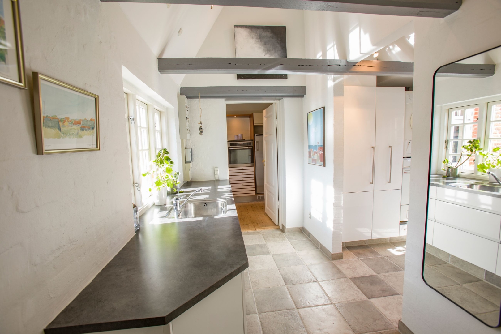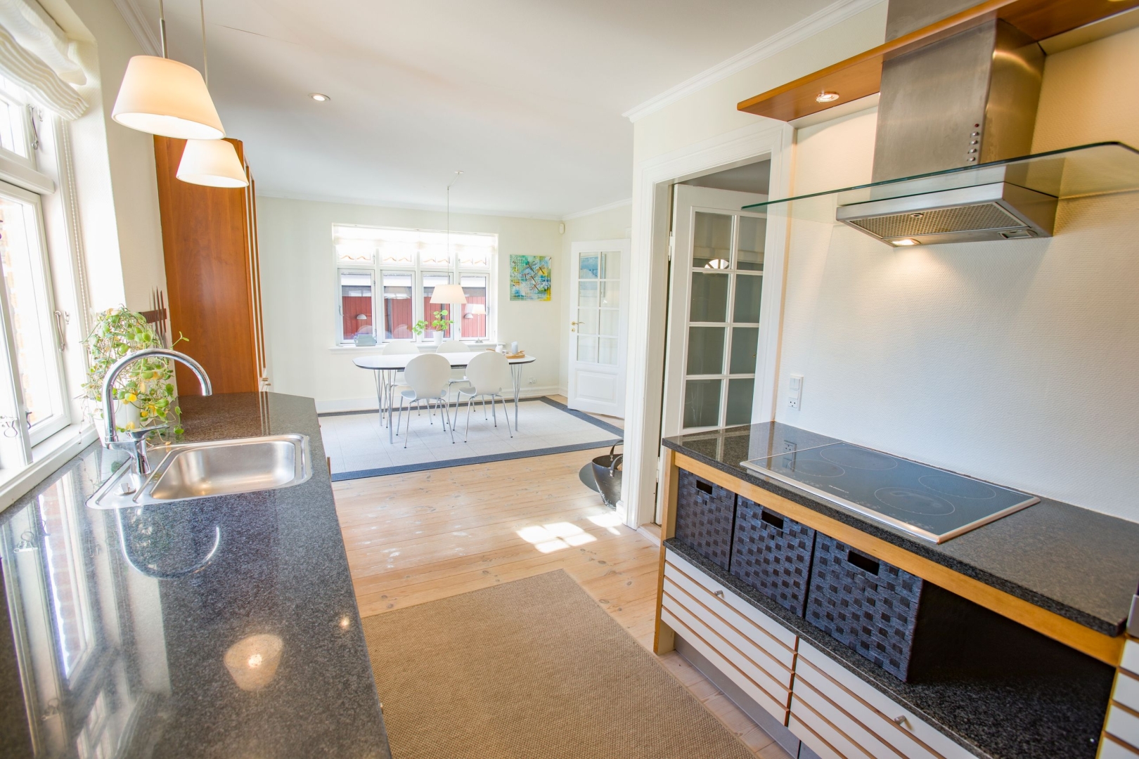 Villaens køkken er lyst og funktionelt med både spiseplads og udgang til gårdhaven. Det er udstyret med De Dietrich keramiske kogeplader, Blomberg emhætte, Voss ovn, Gorenje fryser og køleskab samt Asko opvaskemaskine. Køkkenet er også udstyret med en varmepumpe og brændeovn, som skaber en hyggelig stemning.