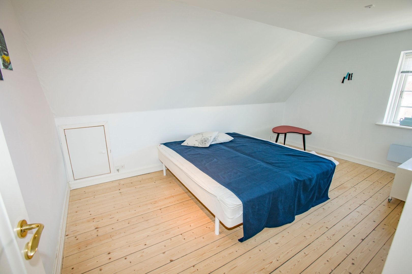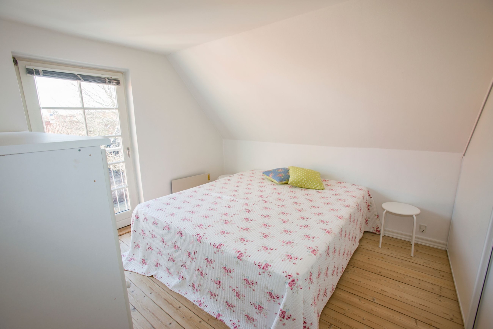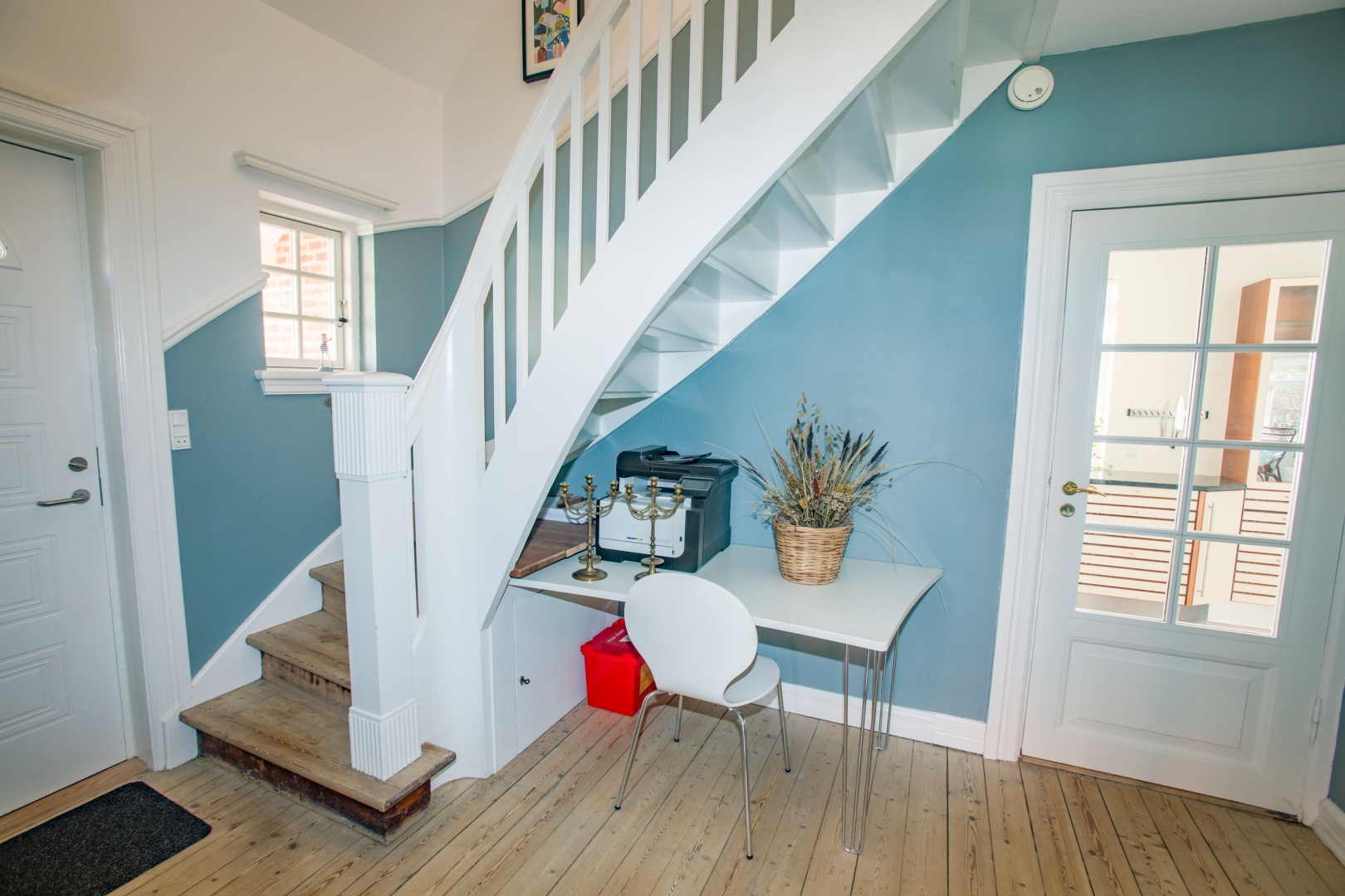 Ved indgangen finder du en flot hall med trægulv og en smuk trappe, der fører op til første sal. I stueplan ligger det rummelige soveværelse, som er ideelt til dem, der ønsker nem adgang til en rolig nattesøvn.