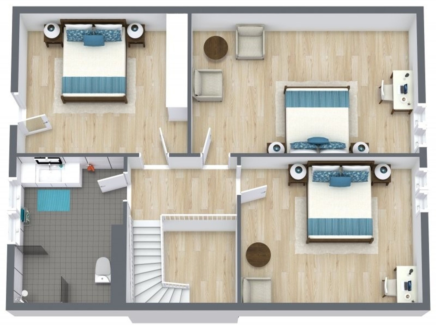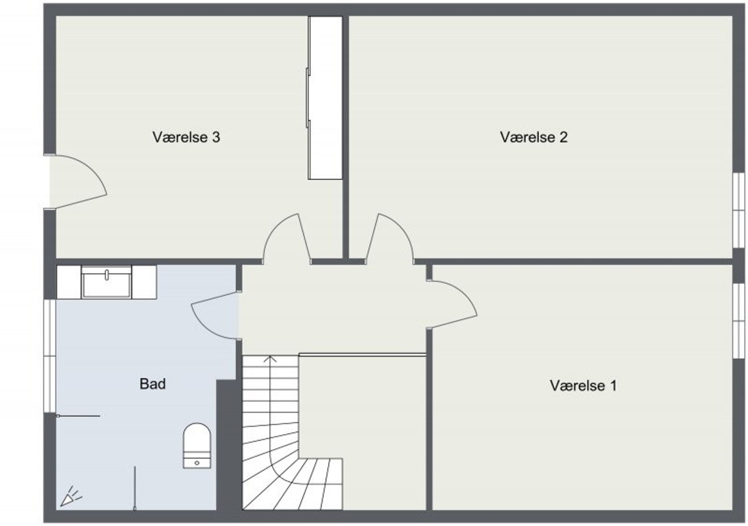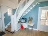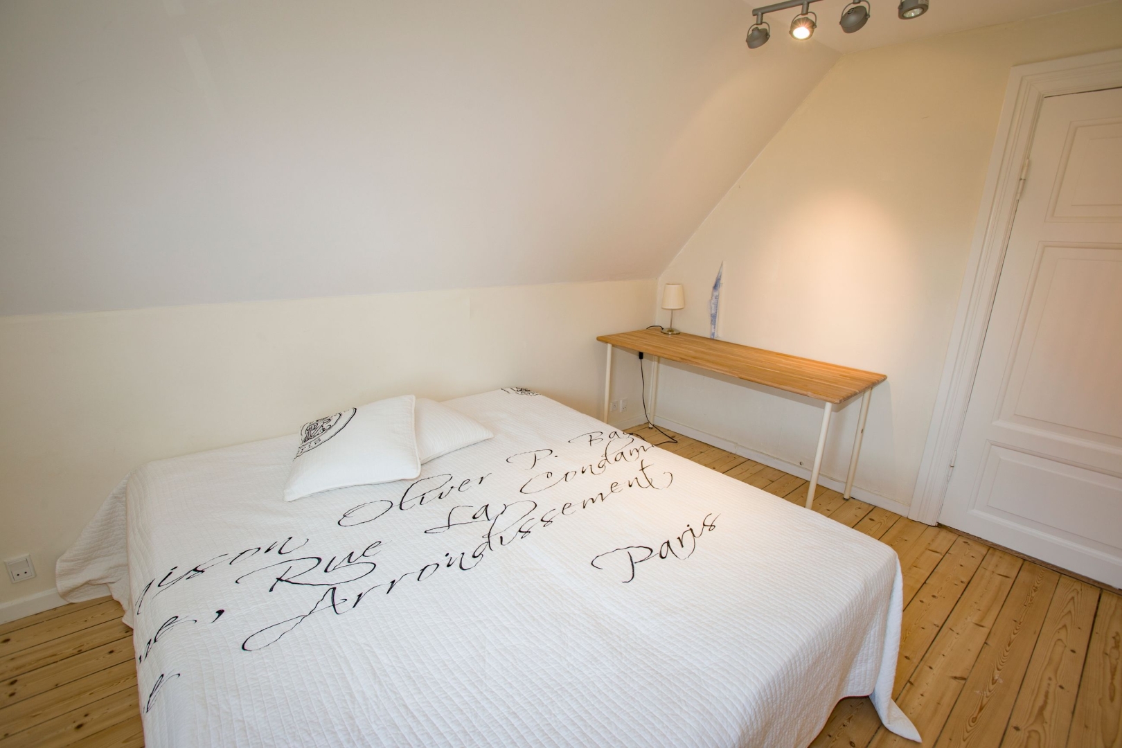 Ved indgangen finder du en flot hall med trægulv og en smuk trappe, der fører op til første sal. I stueplan ligger det rummelige soveværelse, som er ideelt til dem, der ønsker nem adgang til en rolig nattesøvn.