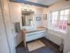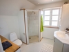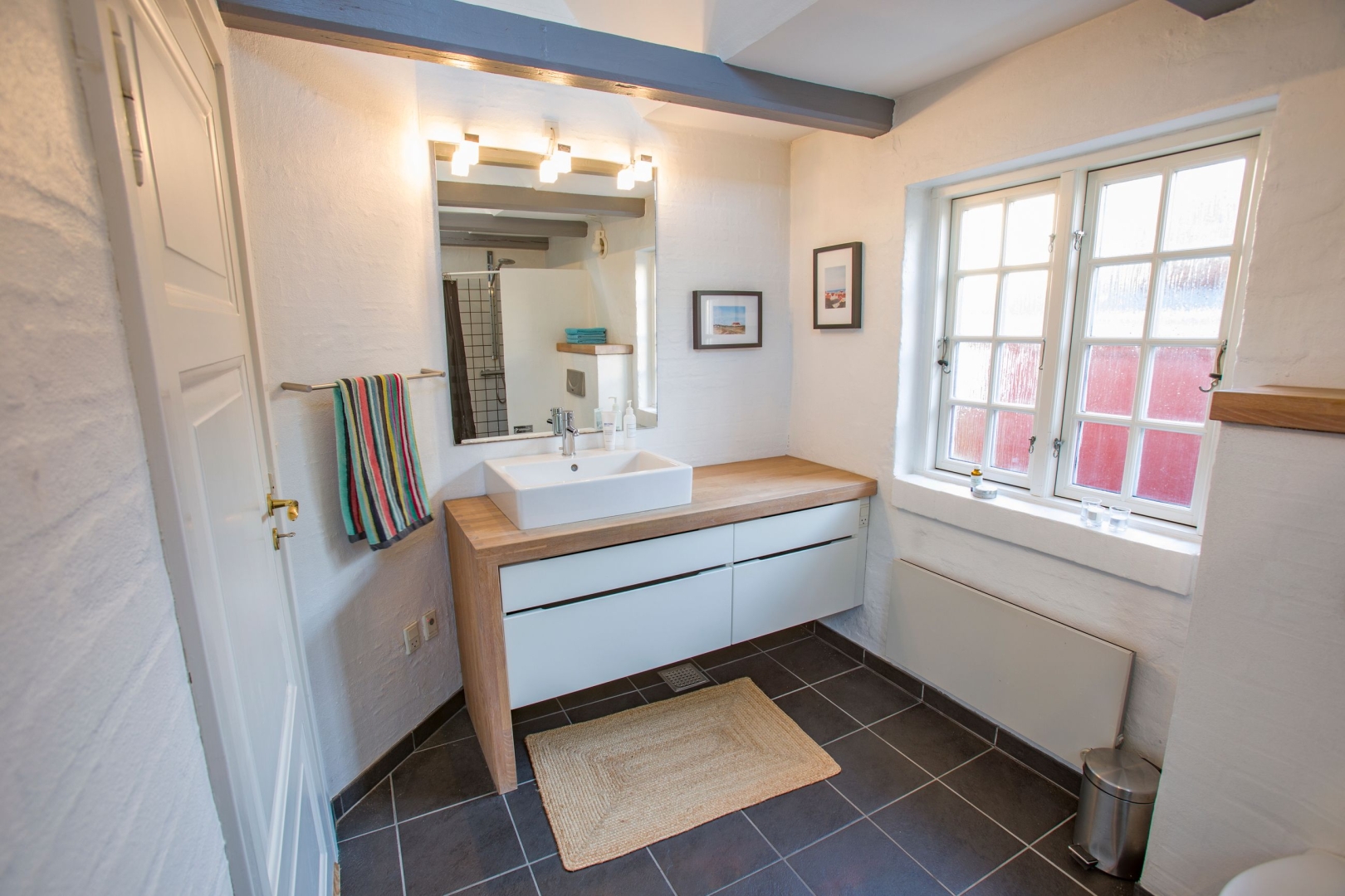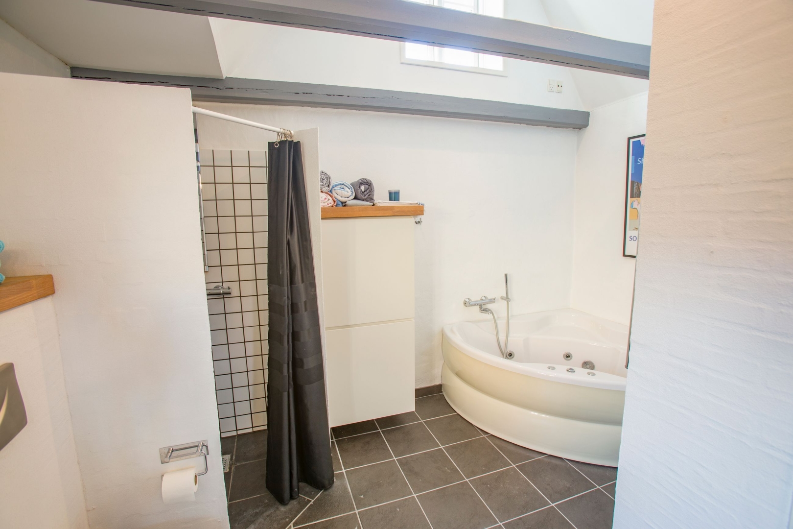 På første sal finder du to værelser samt et soveværelse med fransk altan og et smukt kig ned i haven. Der er også et ekstra badeværelse med bruseniche og spotlys, hvilket giver rummet en luksuriøs og funktionel oplevelse.