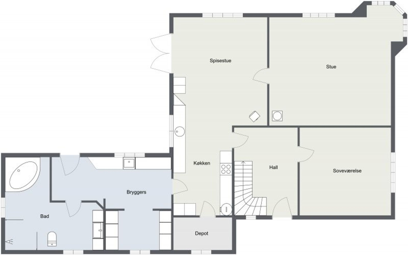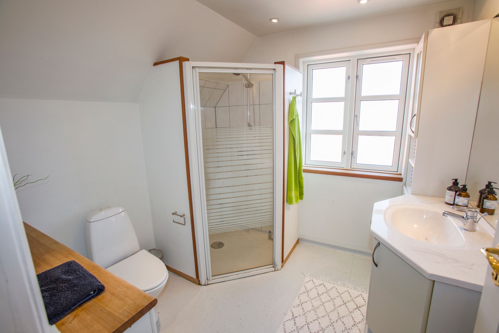 Den åbne stue, som ligger tæt på køkkenet, byder på trægulve og en flot Morsø-brændeovn, som skaber en varm og indbydende atmosfære. Der er også et praktisk badeværelse i stueplan med hjørnespa, loft til kip og bruseniche samt el-gulvvarme.