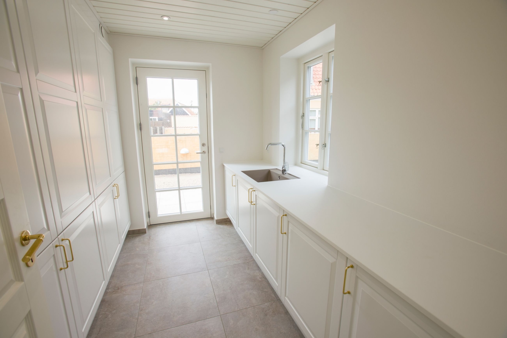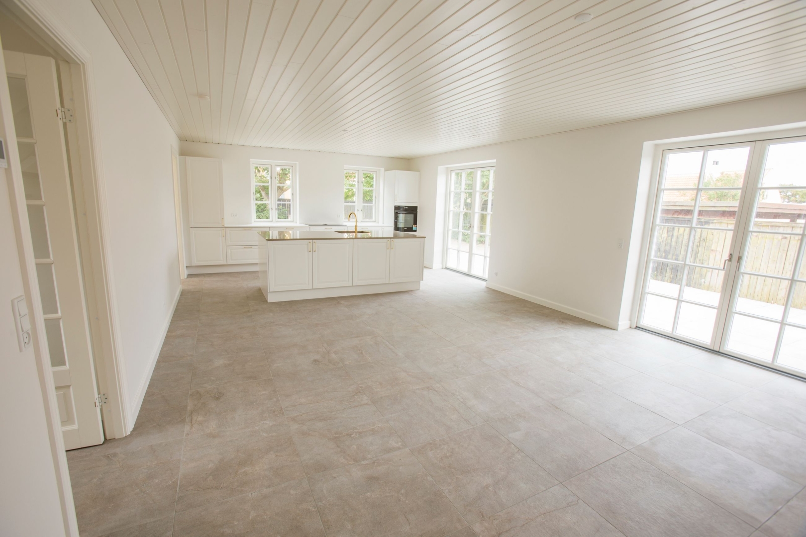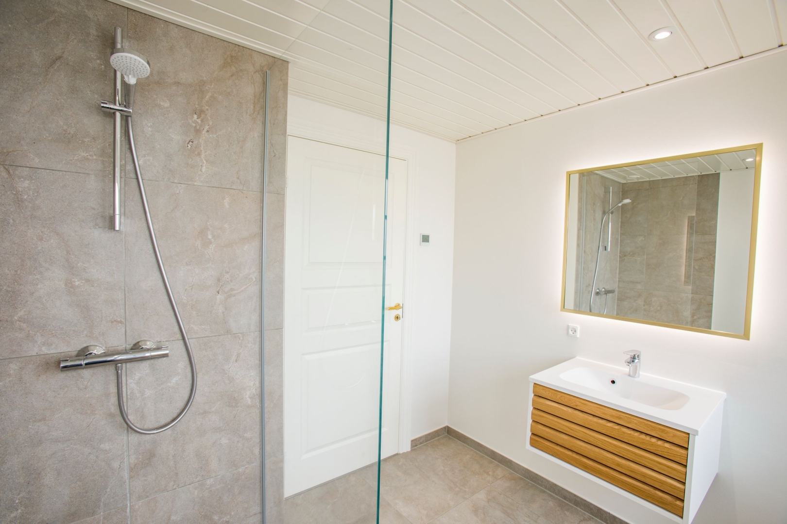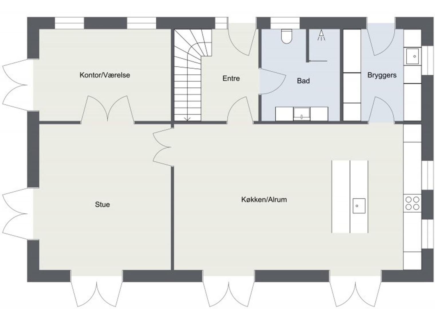 Med sine 181 m² fordelt på 119 m² i stueplan og 62 m² på førstesalen får du en moderne bolig med masser af lys, luft og veludnyttet plads. I stueetagen finder du en praktisk baggang med vask, bordplads og vaskesøjle samt en skabsvæg med teknik. Det store køkken og alrum er husets hjerte og byder på en elegant arbejdsø med vask og udgang til en sydvendt terrasse, der indbyder til hyggelige stunder. Herfra er der åben forbindelse til en lys stue med direkte udgang til terrassen samt adgang til et skønt kontor med dobbelt fransk dør og endnu en udgang. Fra hallen fører trappen op til førstesalen, og et lækkert badeværelse med bruseniche fuldender etagen.