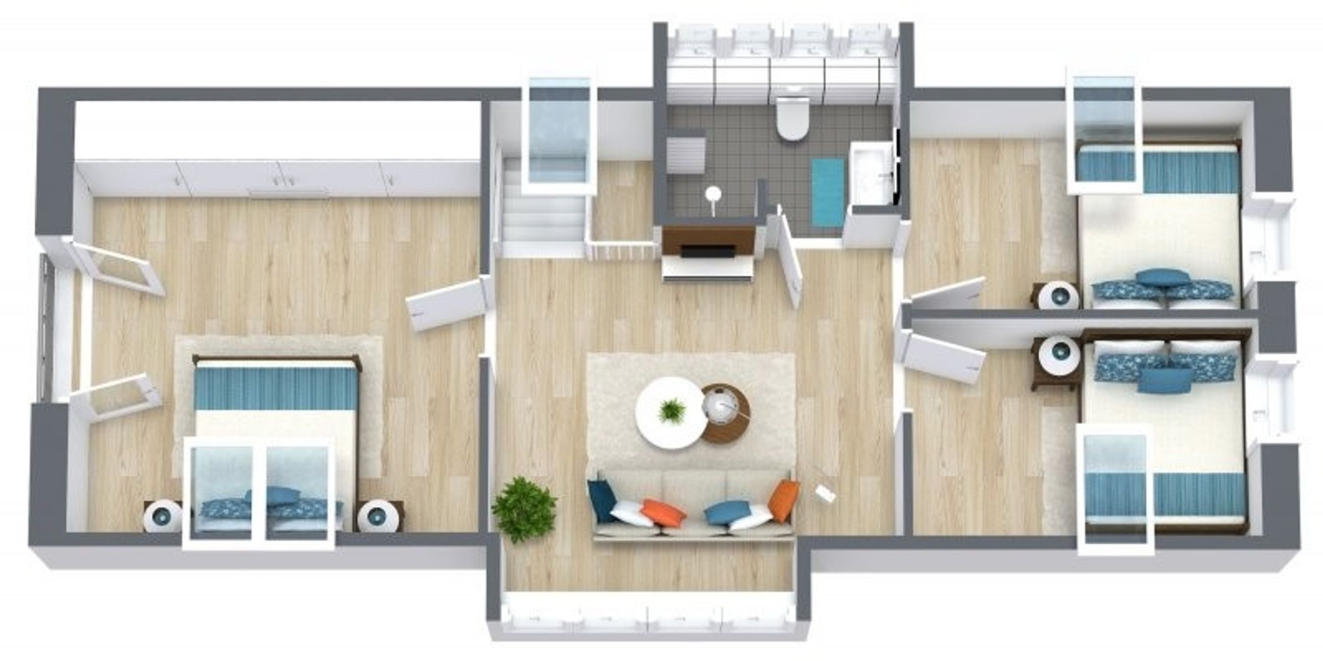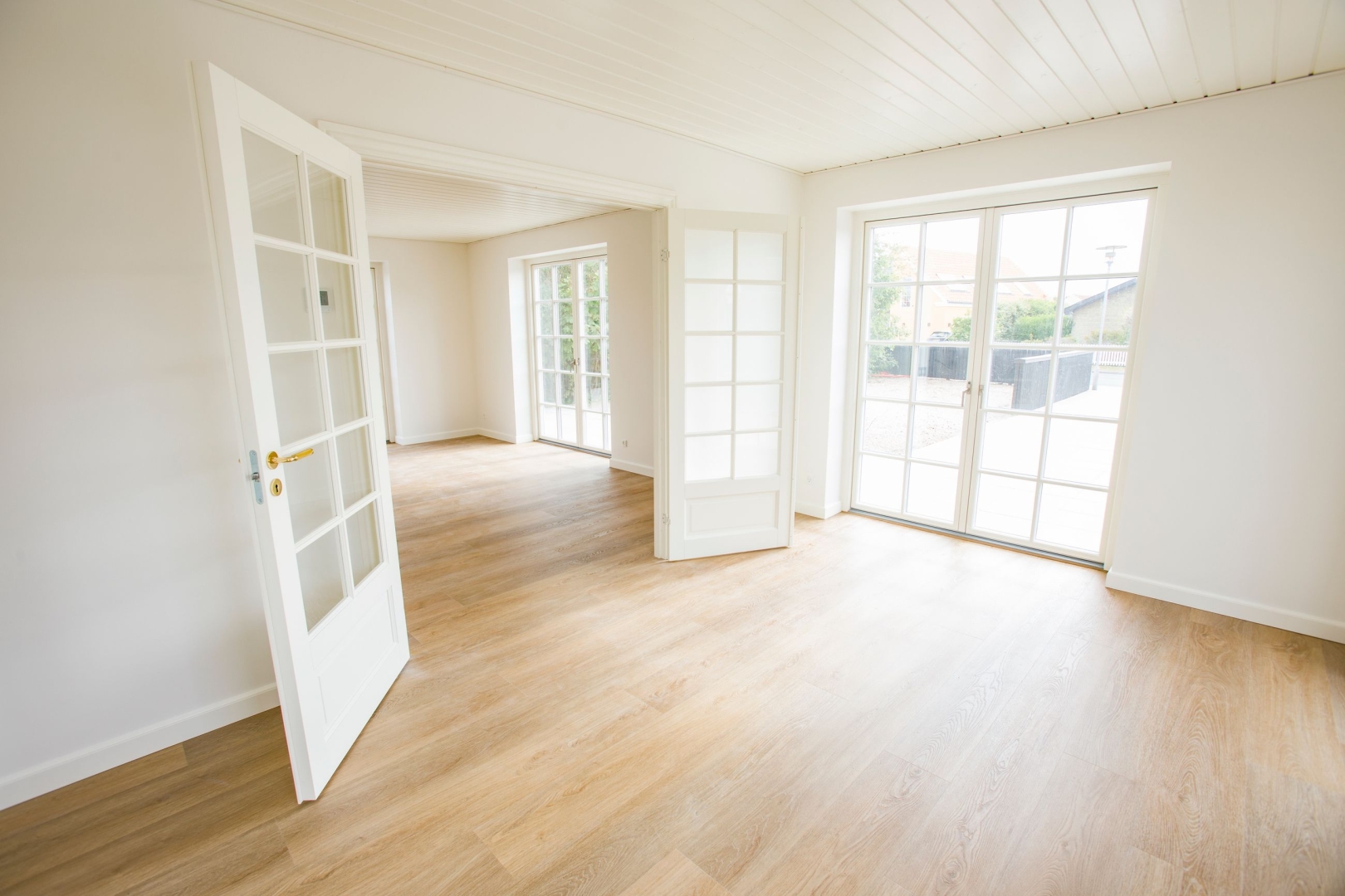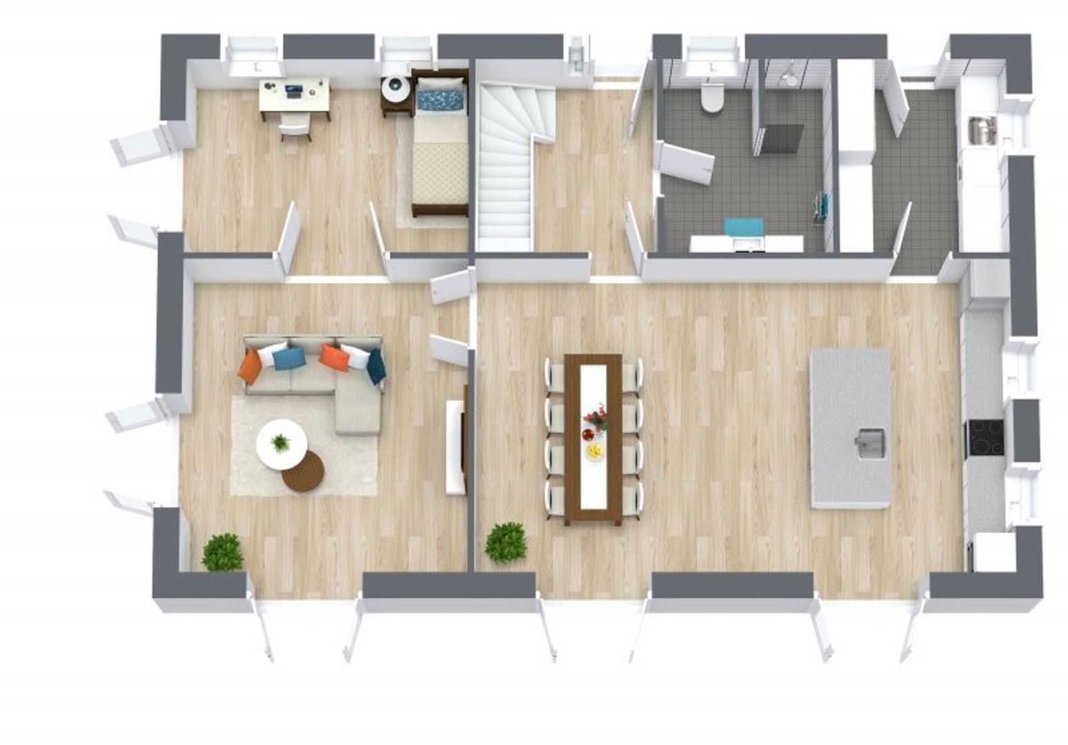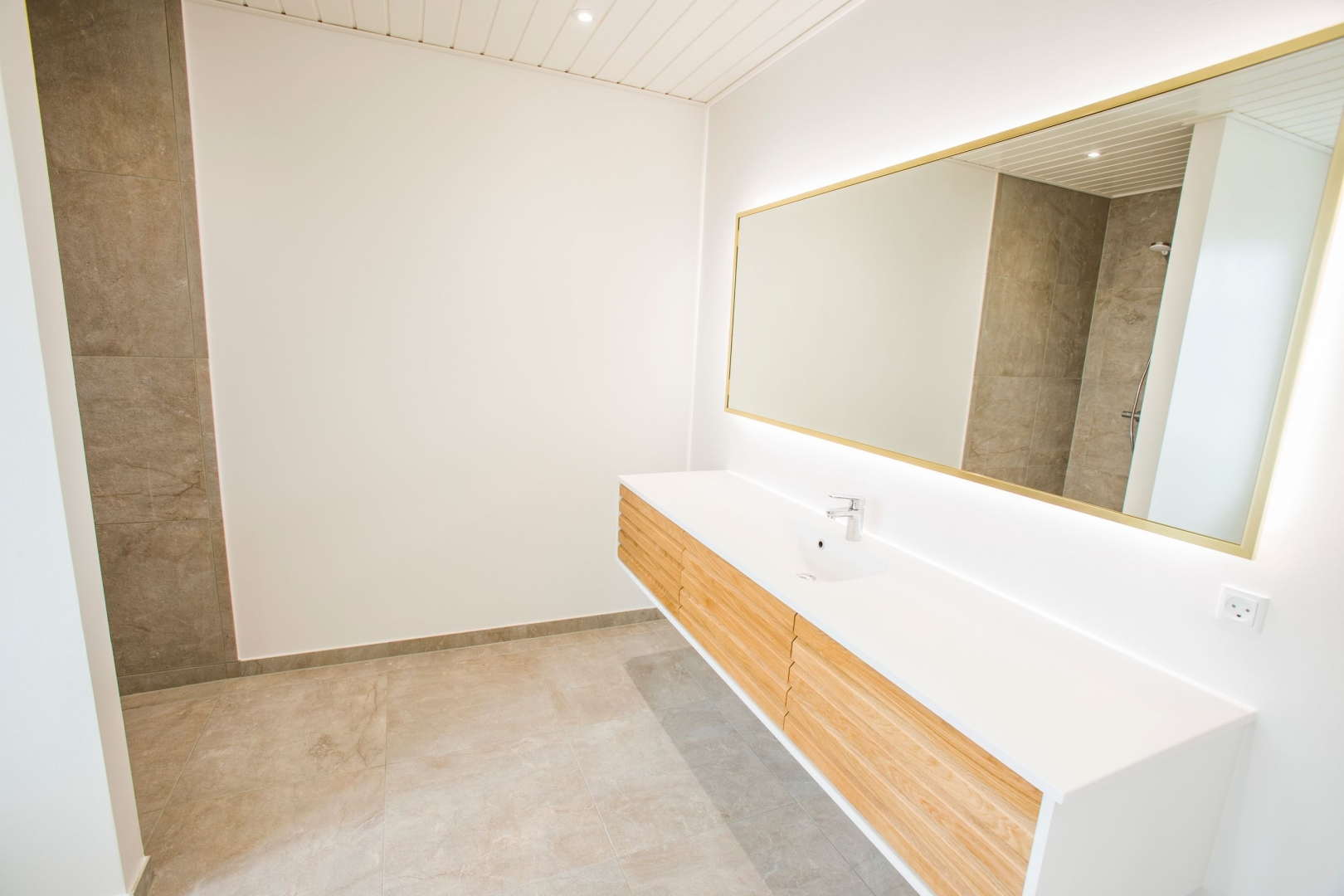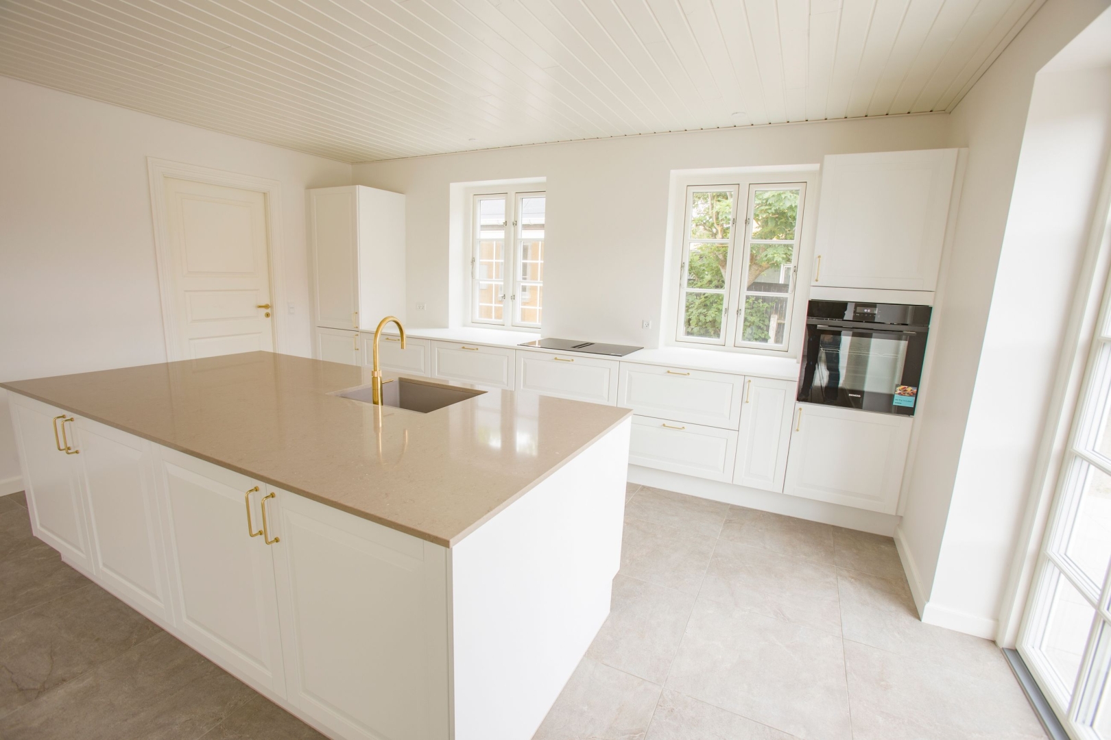 Med sine 181 m² fordelt på 119 m² i stueplan og 62 m² på førstesalen får du en moderne bolig med masser af lys, luft og veludnyttet plads. I stueetagen finder du en praktisk baggang med vask, bordplads og vaskesøjle samt en skabsvæg med teknik. Det store køkken og alrum er husets hjerte og byder på en elegant arbejdsø med vask og udgang til en sydvendt terrasse, der indbyder til hyggelige stunder. Herfra er der åben forbindelse til en lys stue med direkte udgang til terrassen samt adgang til et skønt kontor med dobbelt fransk dør og endnu en udgang. Fra hallen fører trappen op til førstesalen, og et lækkert badeværelse med bruseniche fuldender etagen.