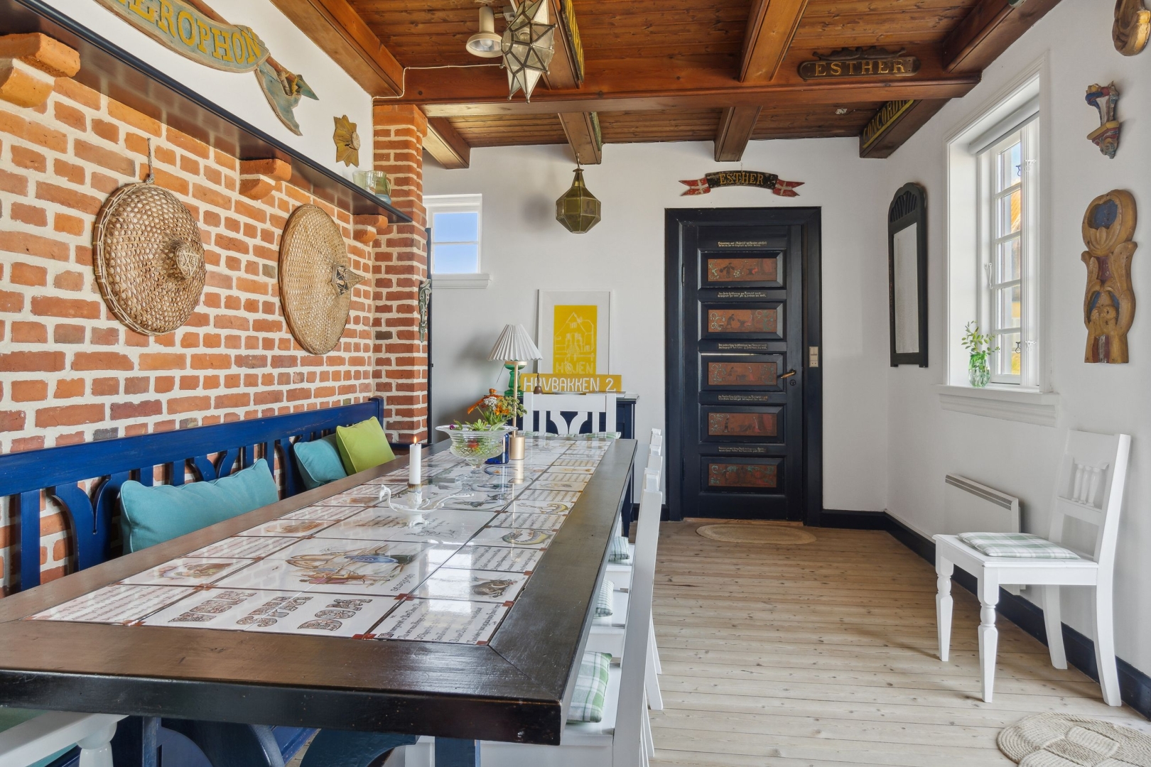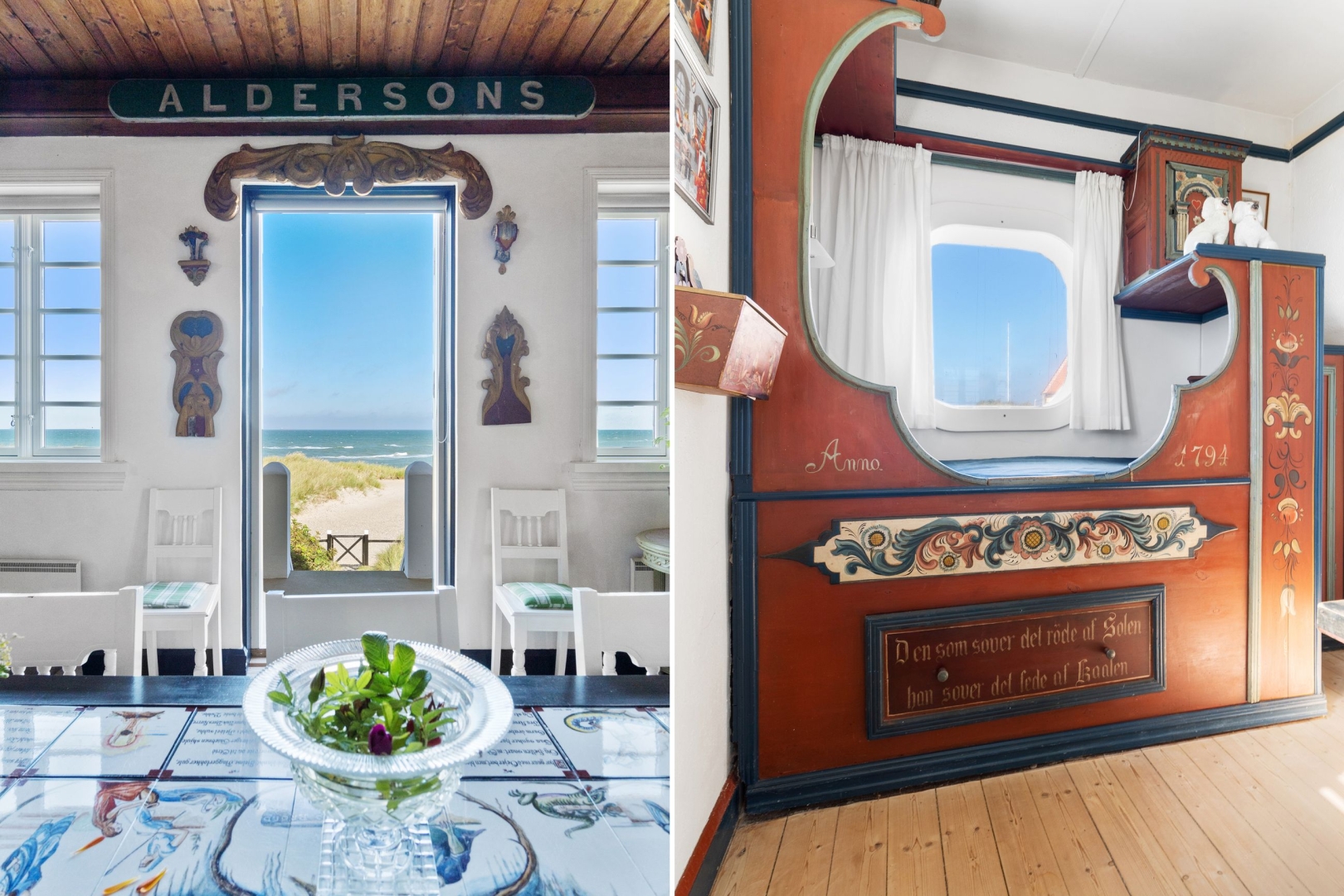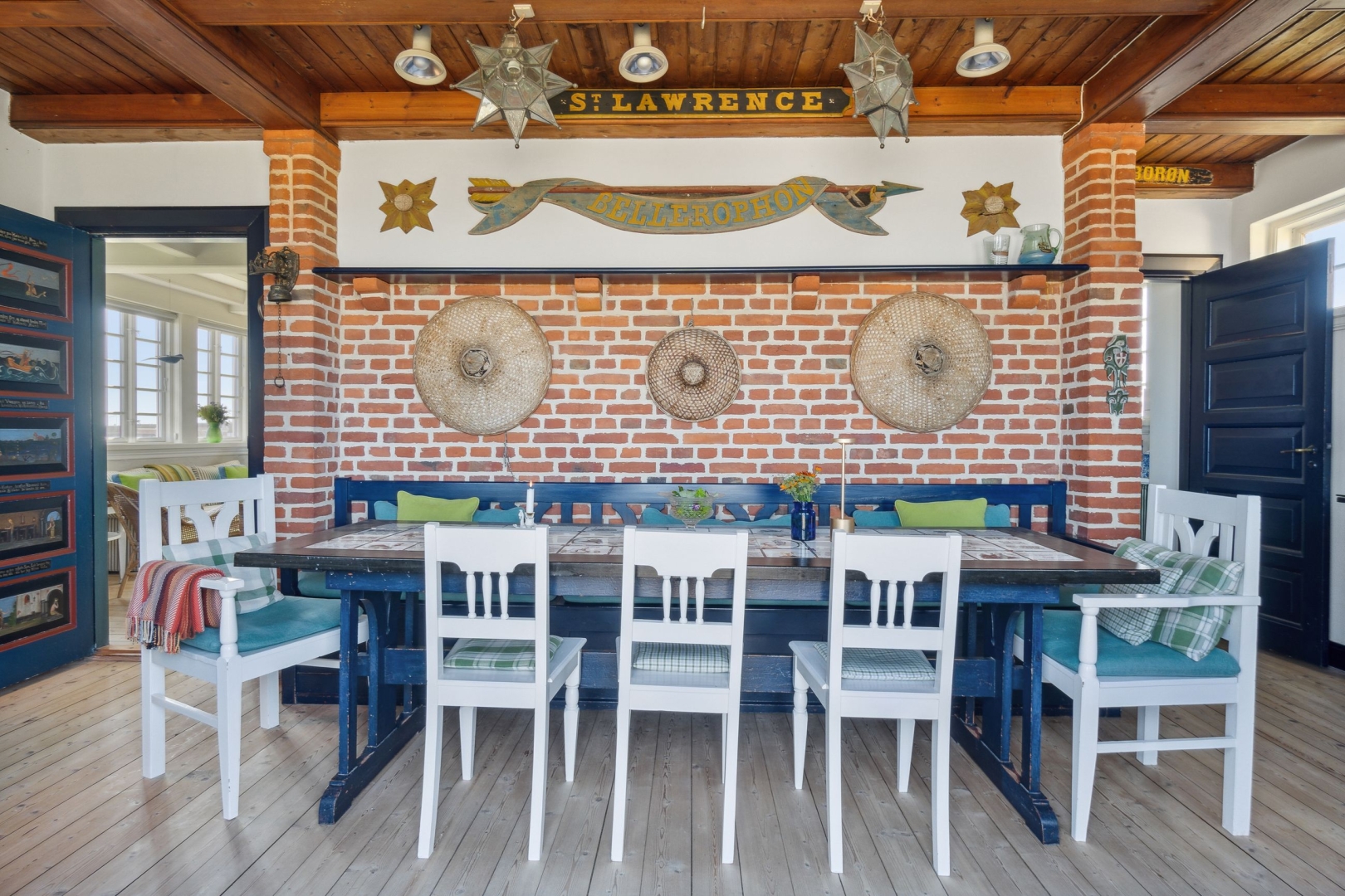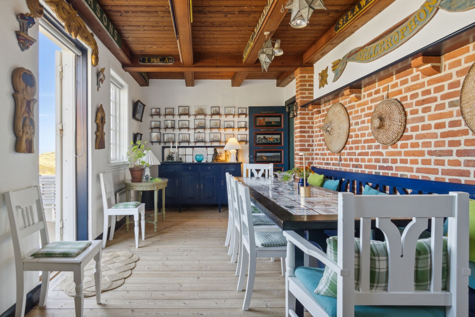 Man træder ind enten gennem den lille entré eller direkte via terrassen, hvor en glasdør åbner op til husets hjerte: spisestuen. Her mærker man straks fornemmelsen af, at tiden har stået stille. Indretningen emmer af historie med udskårne detaljer, blåmalet skænk, et kakkelbord med nordiske mytologier alt sammen indhyllet i en autentisk almue-stemning. Rummet har en god størrelse og er som skabt til afslappede sommeraftener med skaldyr og latter, mens murstensvæggen understøtter den rå og rustikke atmosfære, hvor strandsand på gulvet snarere er en charme end en gene.