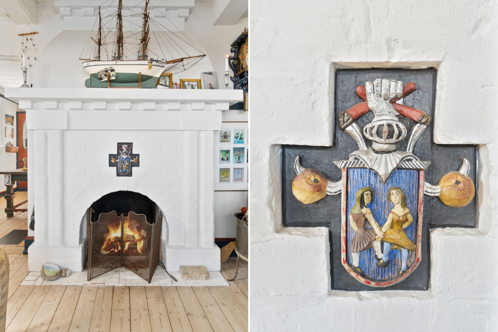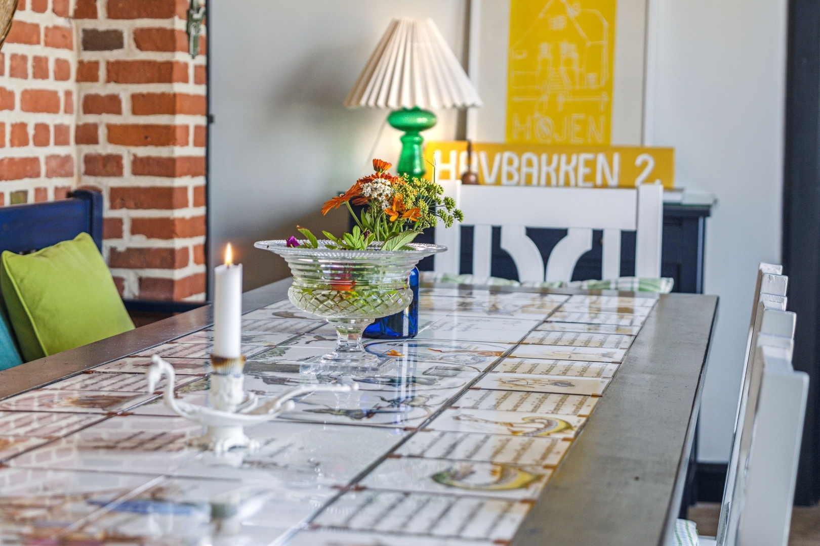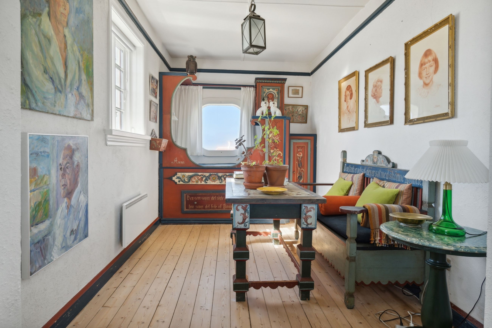 Man træder ind enten gennem den lille entré eller direkte via terrassen, hvor en glasdør åbner op til husets hjerte: spisestuen. Her mærker man straks fornemmelsen af, at tiden har stået stille. Indretningen emmer af historie med udskårne detaljer, blåmalet skænk, et kakkelbord med nordiske mytologier alt sammen indhyllet i en autentisk almue-stemning. Rummet har en god størrelse og er som skabt til afslappede sommeraftener med skaldyr og latter, mens murstensvæggen understøtter den rå og rustikke atmosfære, hvor strandsand på gulvet snarere er en charme end en gene.