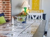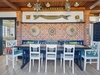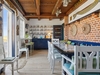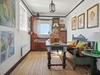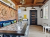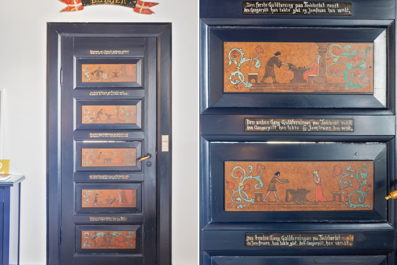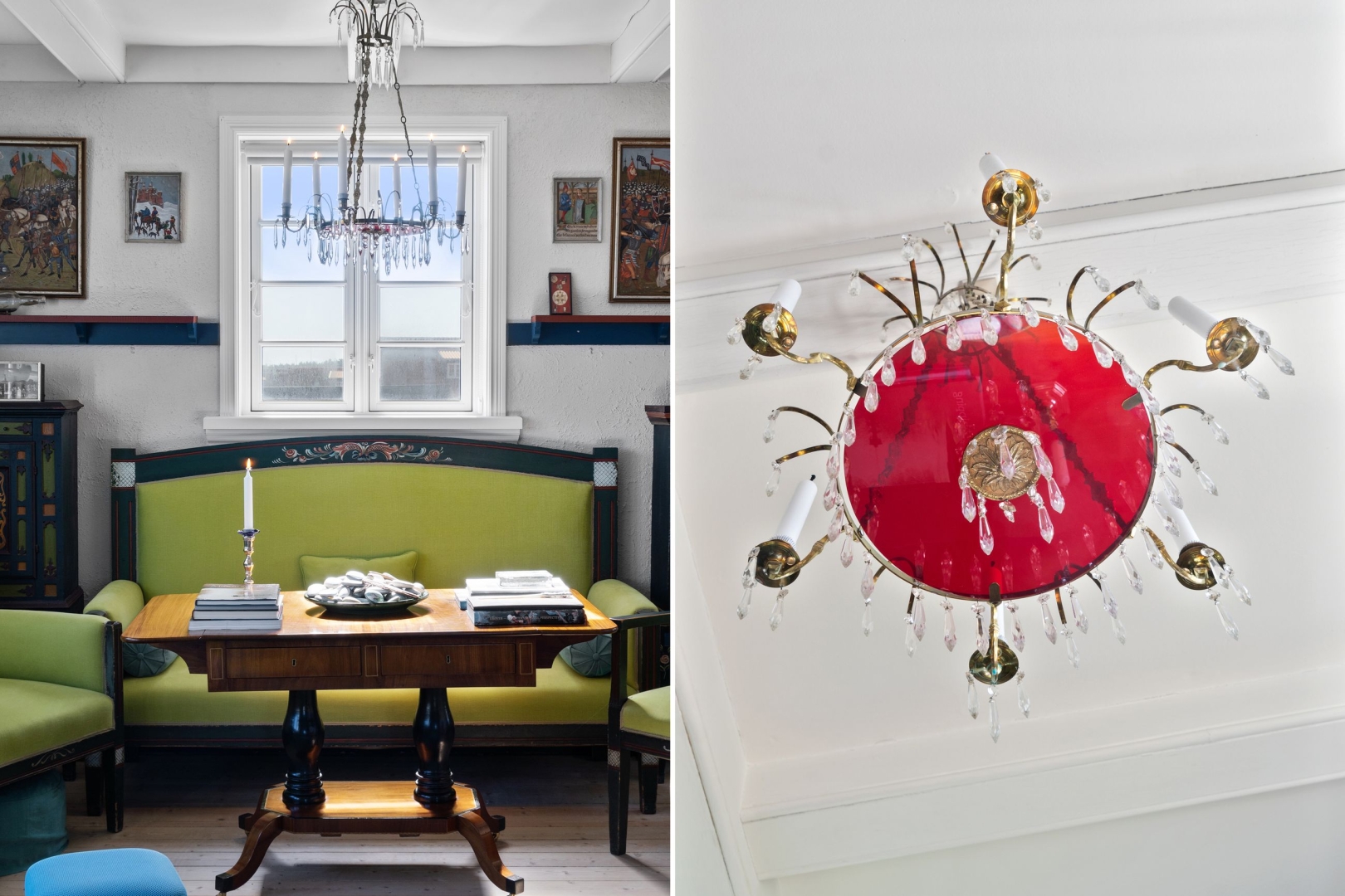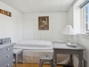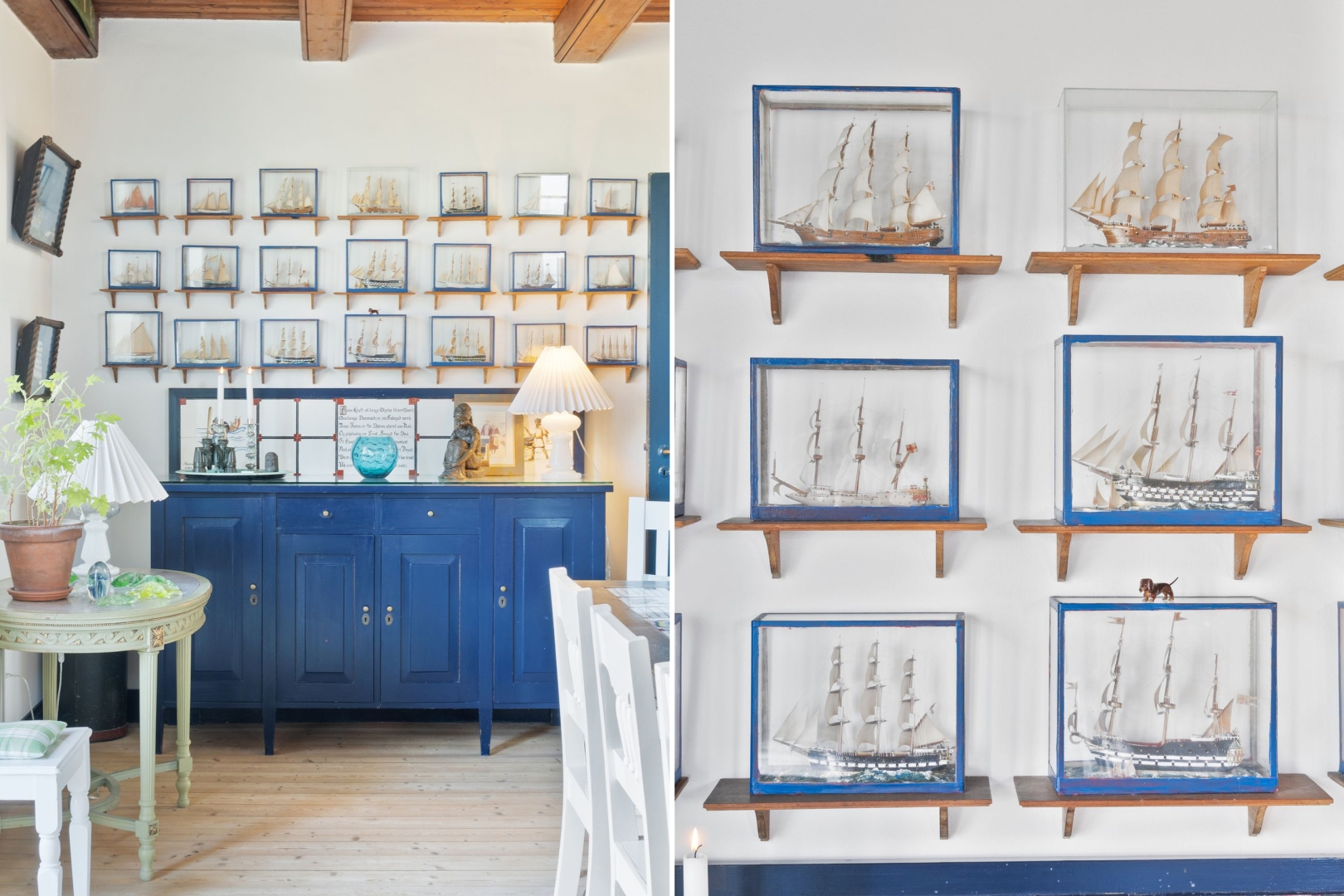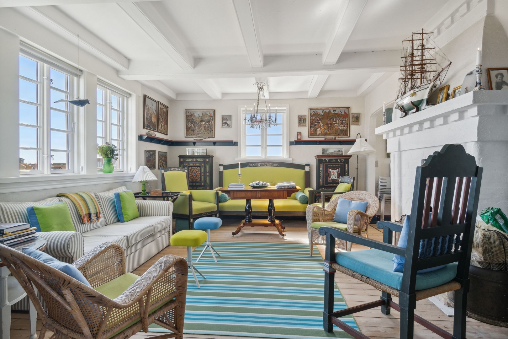 Man træder ind enten gennem den lille entré eller direkte via terrassen, hvor en glasdør åbner op til husets hjerte: spisestuen. Her mærker man straks fornemmelsen af, at tiden har stået stille. Indretningen emmer af historie med udskårne detaljer, blåmalet skænk, et kakkelbord med nordiske mytologier alt sammen indhyllet i en autentisk almue-stemning. Rummet har en god størrelse og er som skabt til afslappede sommeraftener med skaldyr og latter, mens murstensvæggen understøtter den rå og rustikke atmosfære, hvor strandsand på gulvet snarere er en charme end en gene.