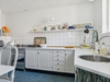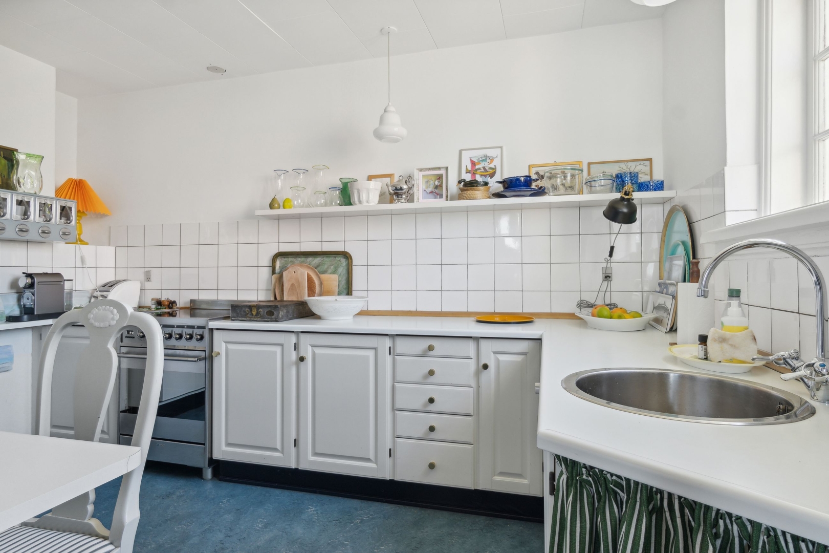 Køkkenet er velholdt med originale fyldningslåger, god bordplads, opvaskemaskine og klassiske hvide kakler. Krydderihylden med små navneskilte er en fin detalje, der understreger husets historie og charme.