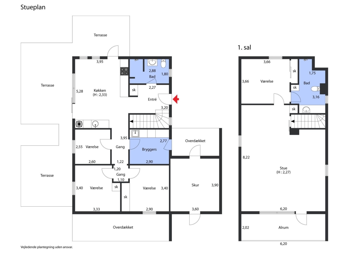 IndretningBoligen byder på hele 160 m² veludnyttet bolig fordelt over to etager: Indenfor mødes du af en indbydende entré med god skabsplads og trappe til første sal. Stueplan byder desuden på et pænt badeværelse med bruseniche og gulvvarme, et praktisk bryggers med vaskemaskine og skydedørsskabe samt varmepumpenhed, og et lyst, velindrettet køkken med god spiseplads. Herfra er der direkte udgang til den sydvendte terrasse og den hyggelige have. I køkken-alrummet skaber en flot Rais pejseindsats både hygge og varme. Videre i stueplan finder du en fordelingsgang, et soveværelse med indbyggede skabe samt to yderligere værelser, hvoraf det ene også har skab.