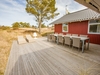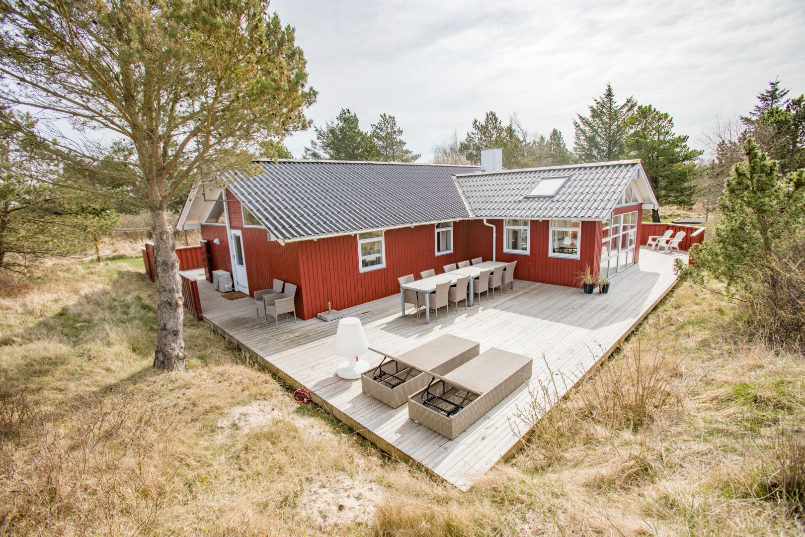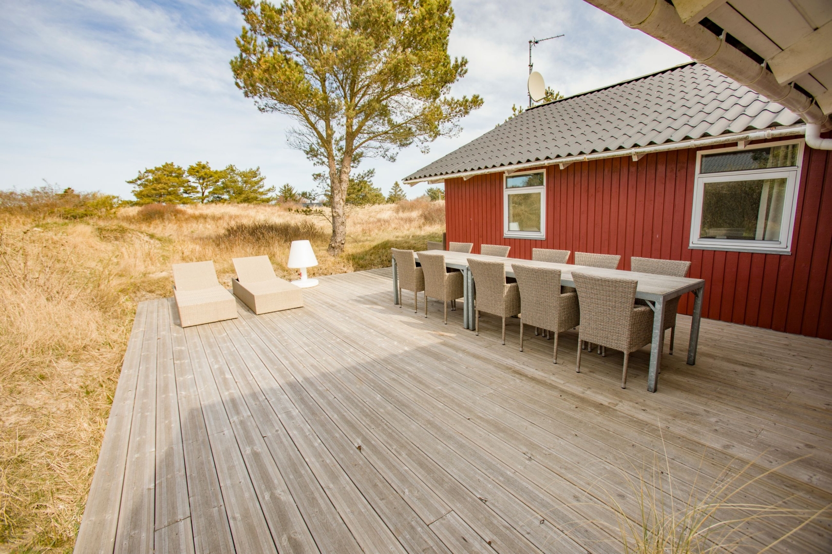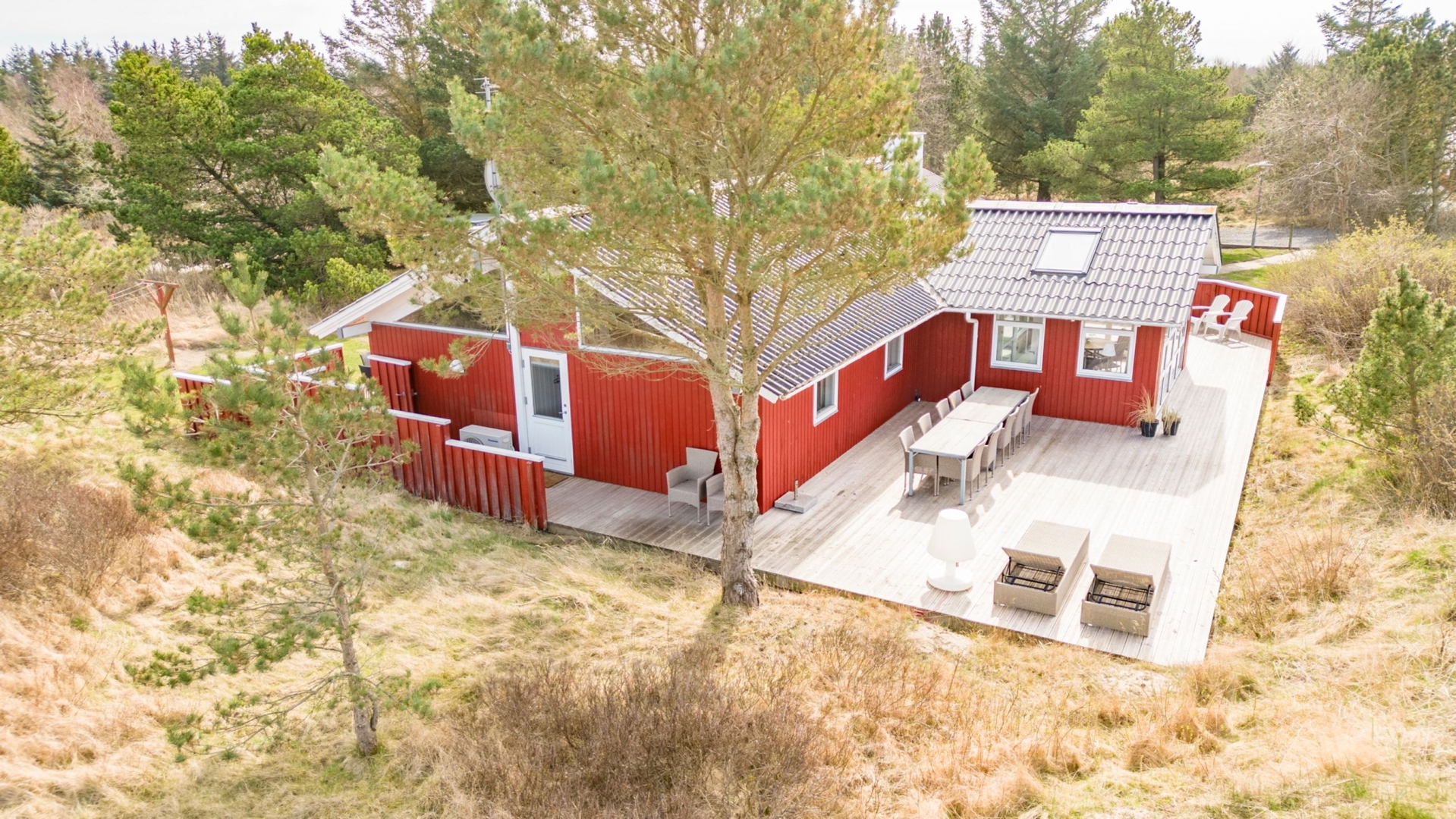 Sommerhuset fremstår lyst og venligt med klassiske røde træfacader, hvide vinduer, eternittag og hårdttræsterrasser hele vejen rundt, så man kan følge solen fra morgen til aften. En del af terrassen er overdækket og har spots i loftet et oplagt sted til morgenkaffen, selv når duggen stadig hænger i luften.