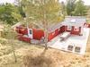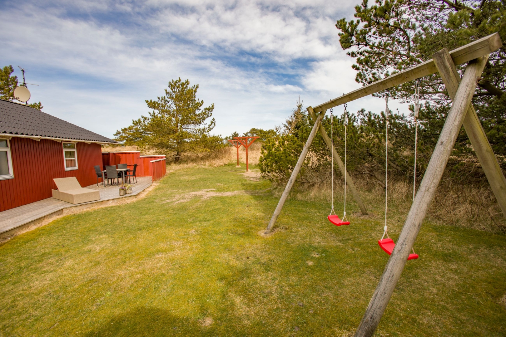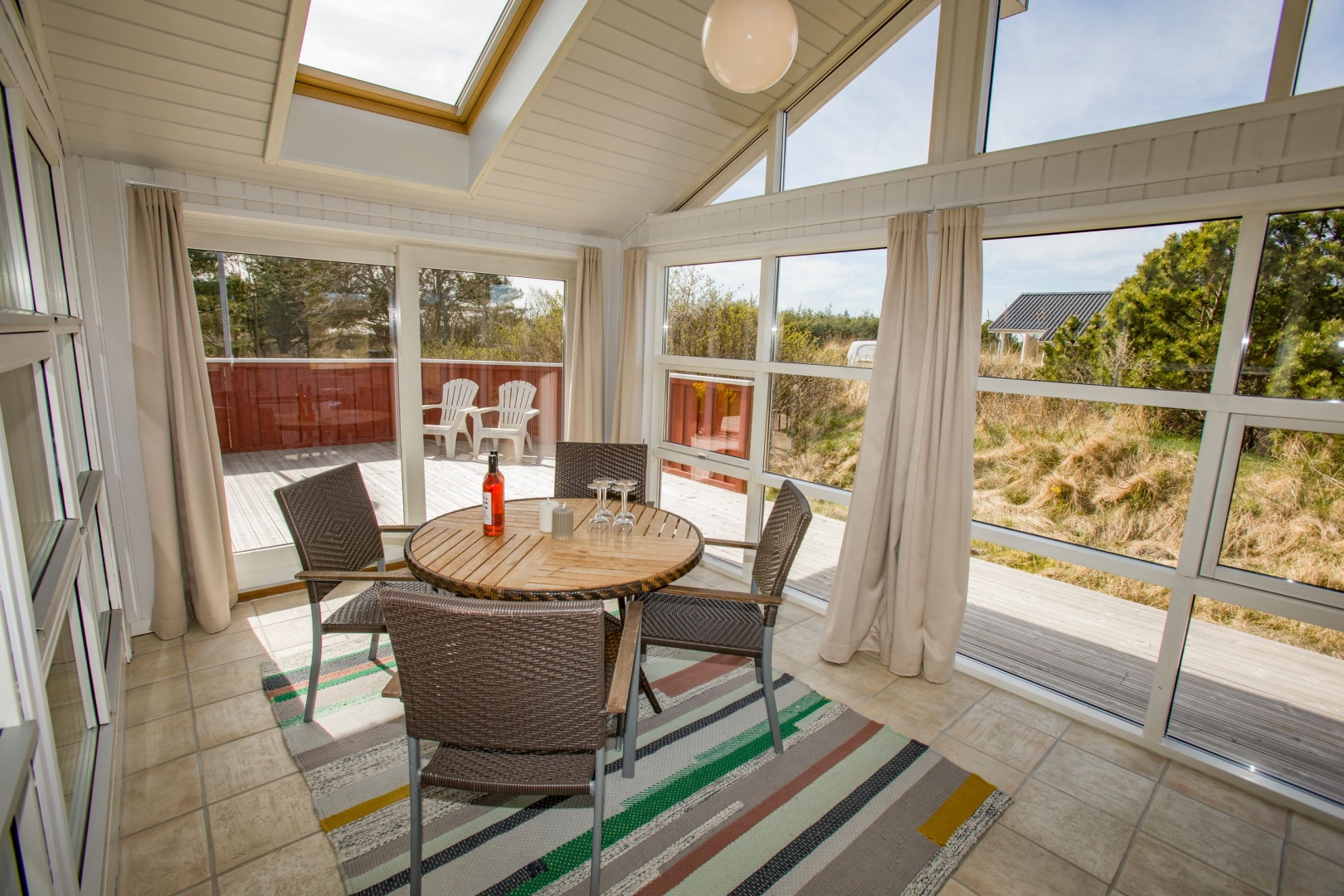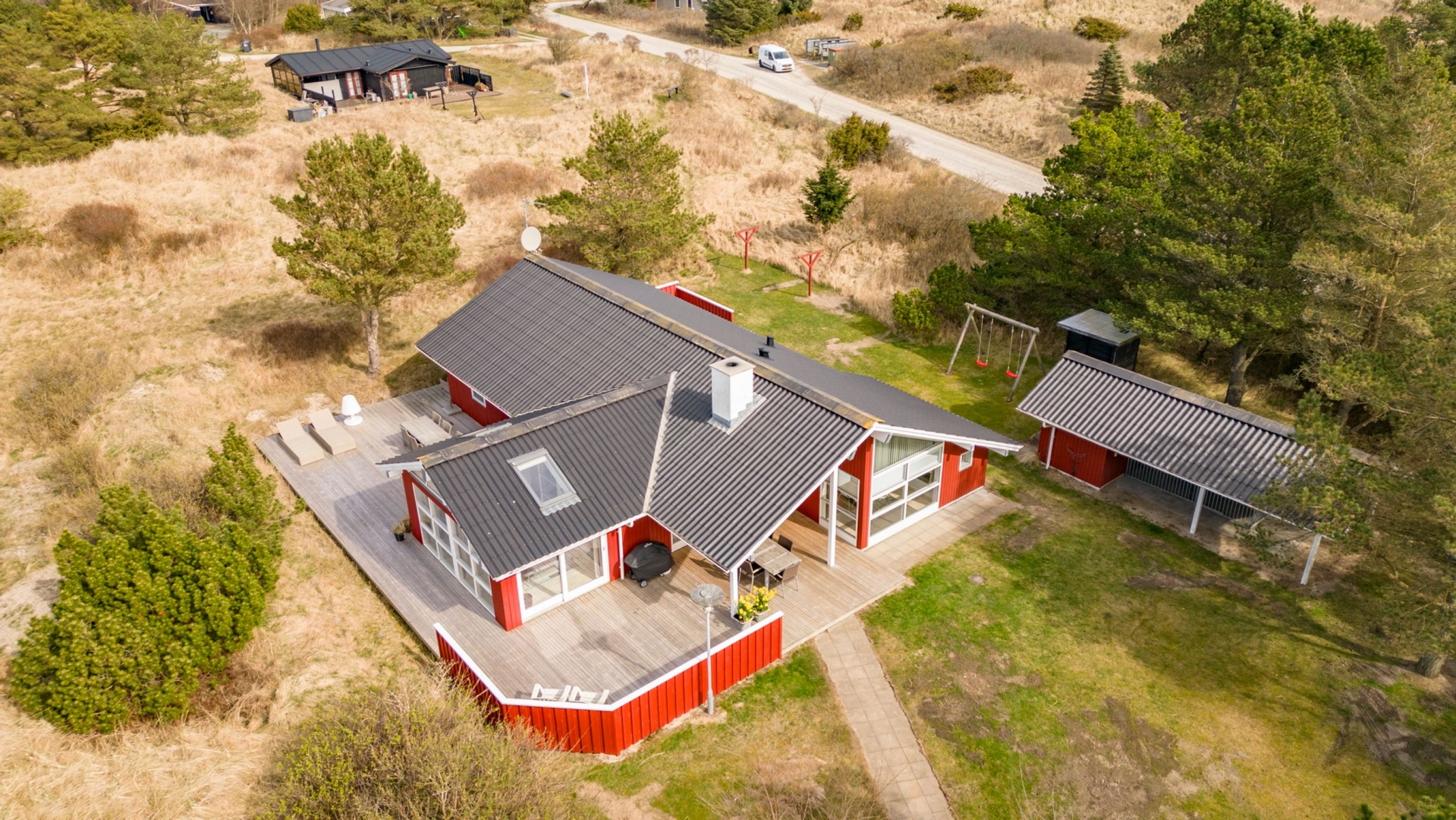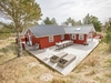 Sommerhuset fremstår lyst og venligt med klassiske røde træfacader, hvide vinduer, eternittag og hårdttræsterrasser hele vejen rundt, så man kan følge solen fra morgen til aften. En del af terrassen er overdækket og har spots i loftet et oplagt sted til morgenkaffen, selv når duggen stadig hænger i luften.