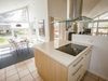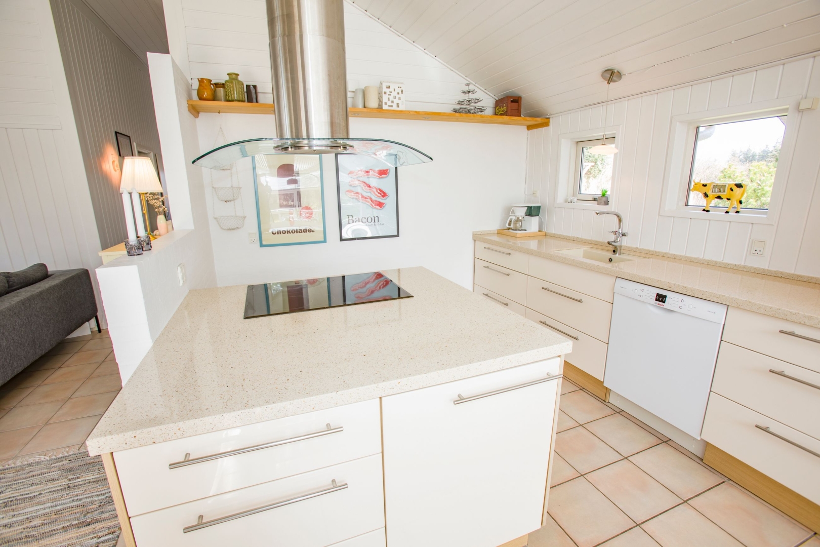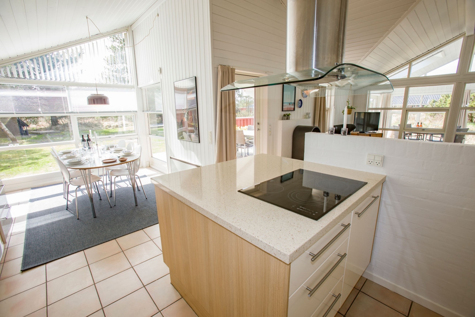 Indenfor træder man direkte ind i en lys og åben stue og køkkenalrum med klinkegulv og brændeovn. Stuen har udgang til en hyggelig udestue med ovenlys og videre udgang til terrassen. Køkkenet er funktionelt med kogeø og åben forbindelse til spisepladsen, der vender mod syd og har store vinduer, som lukker lyset ind. Ved spisepladsen er der desuden en hyggelig alkove perfekt til afslapning eller ekstra soveplads.