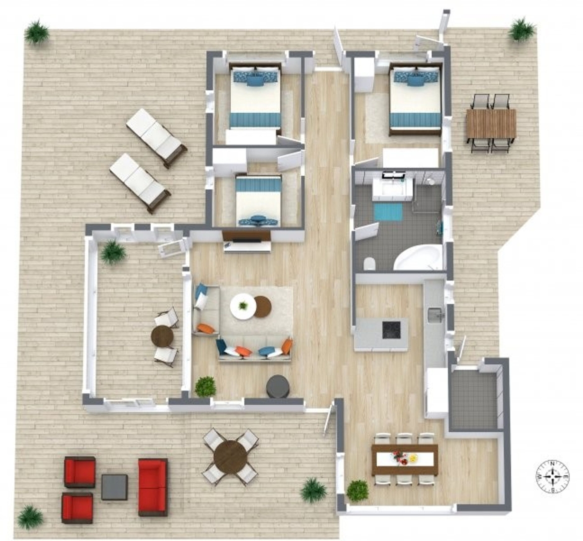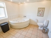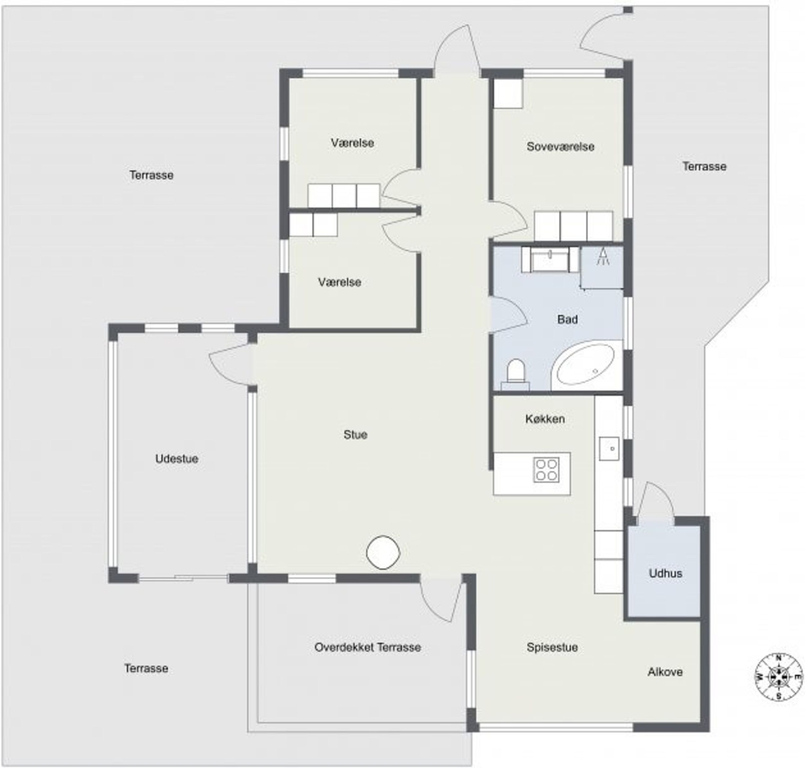 Sommerhuset har tre gode soveværelser, alle med indbyggede skabe. Badeværelset er rummeligt og byder på muret bruseniche og hjørnespa, mens gangen fører videre mod hemsen og ud til endnu en skøn terrasse mod vest. Huset er opvarmet med både brændeovn og varmepumpe, hvilket sikrer komfort hele året rundt.