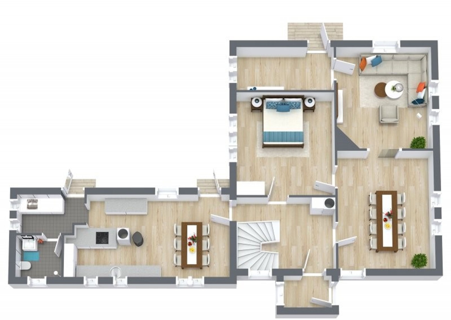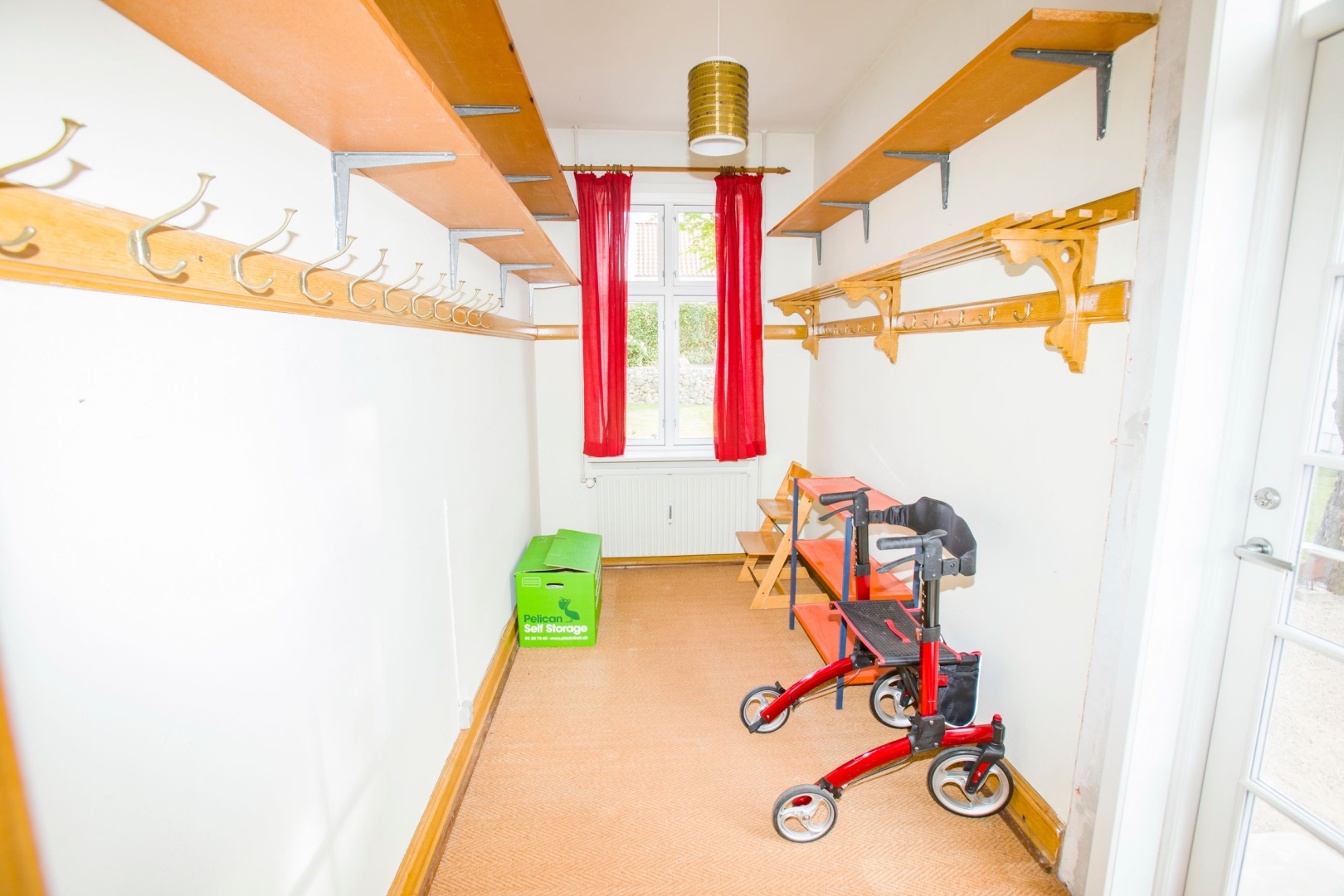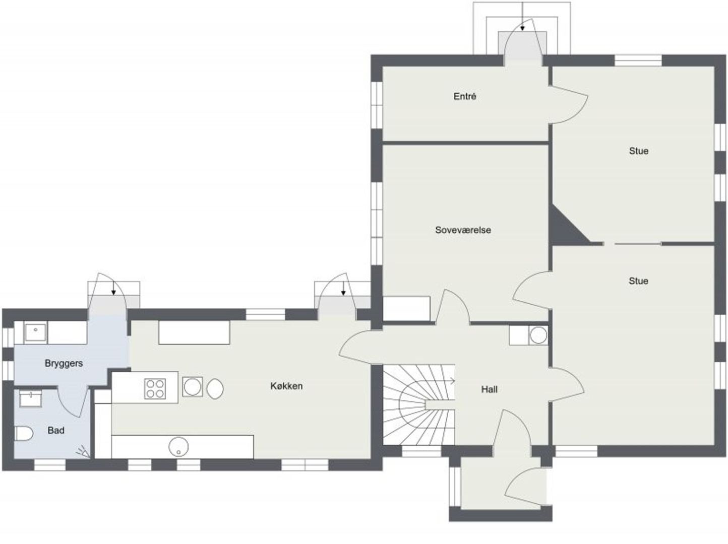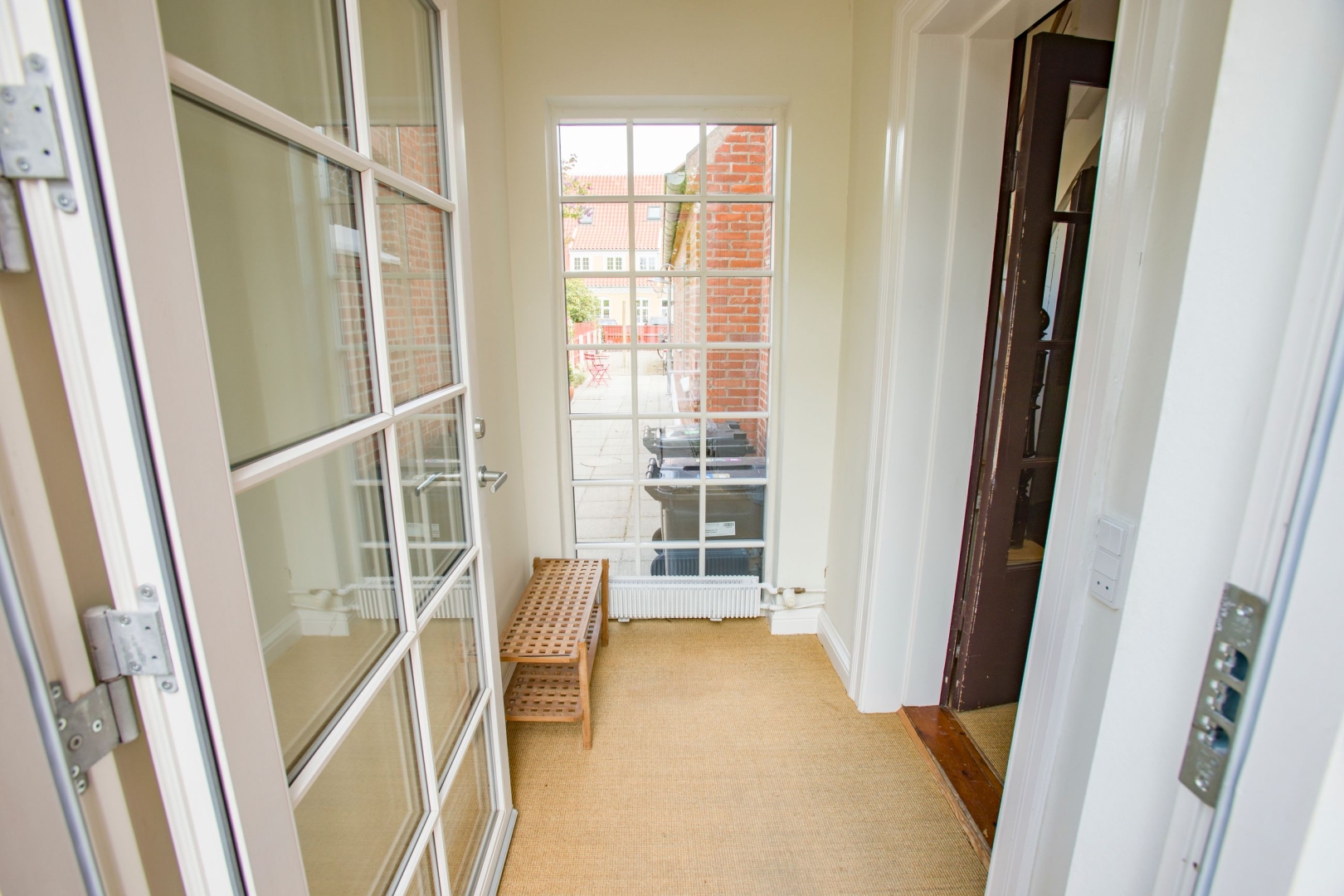 Indretning stueetage: Velkommen i den lyse og indbydende entré med kig gennem huset og ud i haven. Herfra er der adgang til en elegant stue med trægulve og stuklofter samt skydedør til endnu en stue i samme stil. En ekstra entré med garderobeplads giver adgang til haven og et praktisk p-område. Husets hjerte er det charmerende Børge Mogensen-køkken, der kombinerer murstensgulv, brændeovn og spiseplads med udgang til den solrige terrasse og den skønne have. Dertil kommer et stort soveværelse, badeværelse med bruser og toilet, samt en baggang med vaskefaciliteter og adgang til både loft og have.