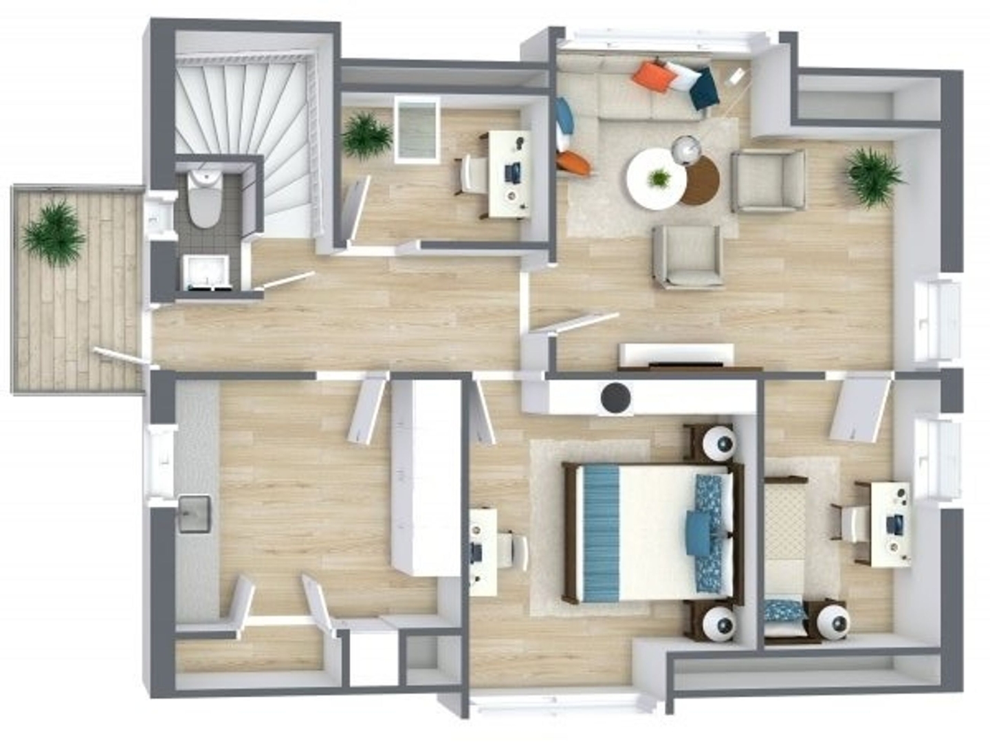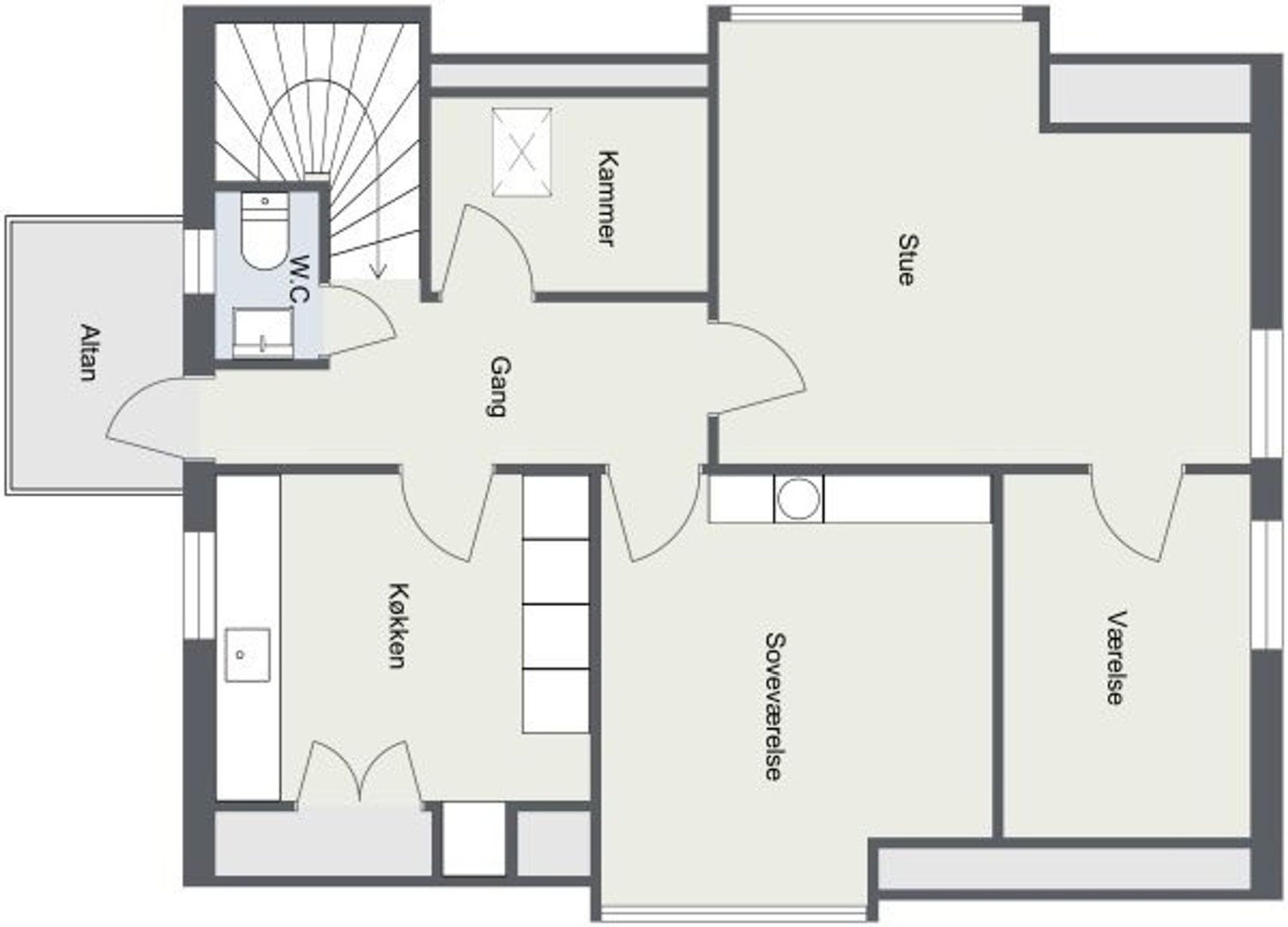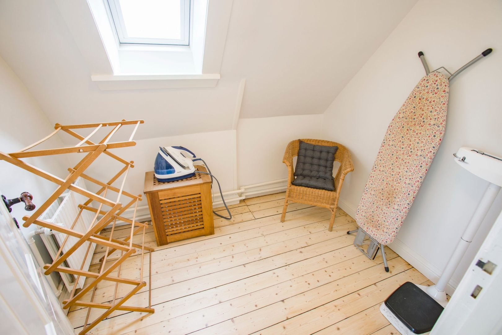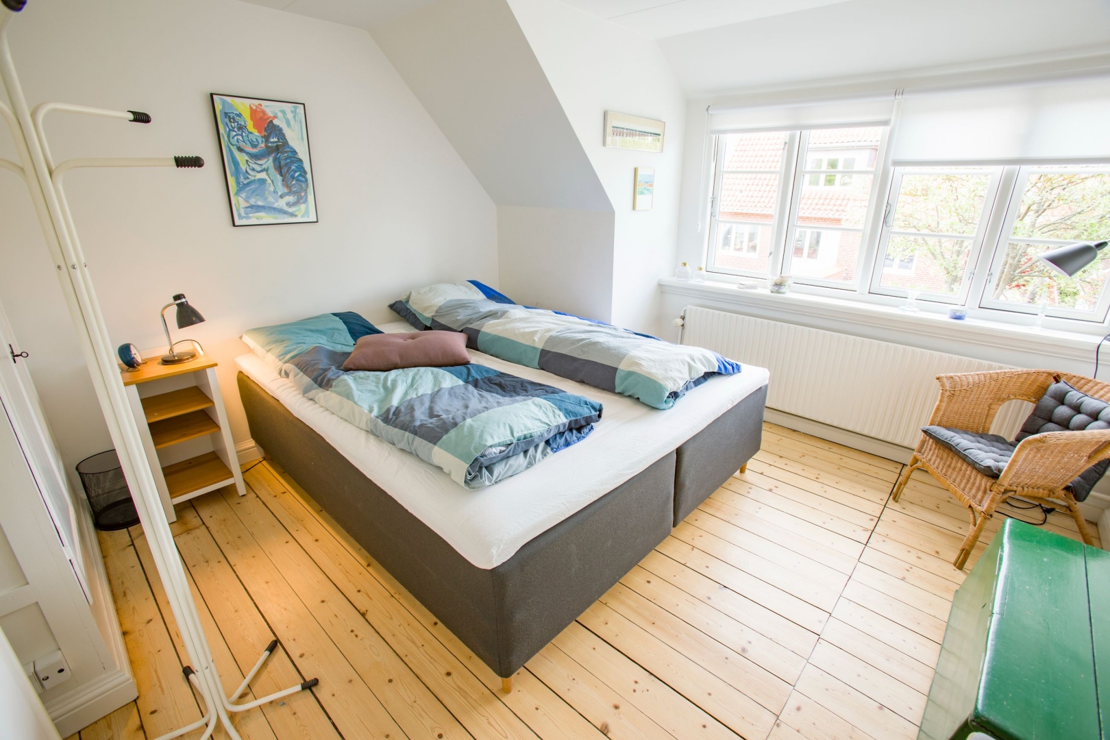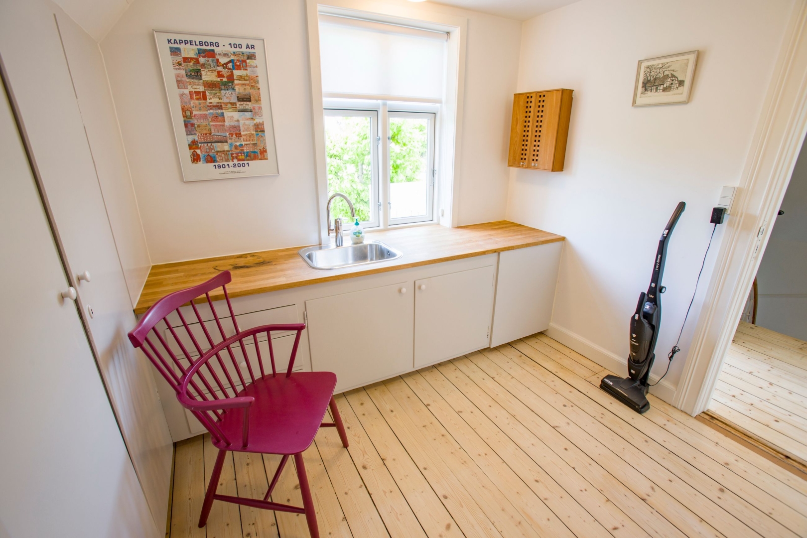 1. sal renoveret for 3 år siden: Her møder du afhøvlede gulve, nye lofter og elinstallationer samt et velholdt og lyst udtryk. Etagen rummer flere værelser herunder et stort soveværelse med kvist og skabe, stue med kvist og kig til haven, toilet med håndvask, et lille kammer med ovenlysvindue, værelse i vestgavl, værelse i øst gavl med bord med vask samt adgang til altan mod øst.