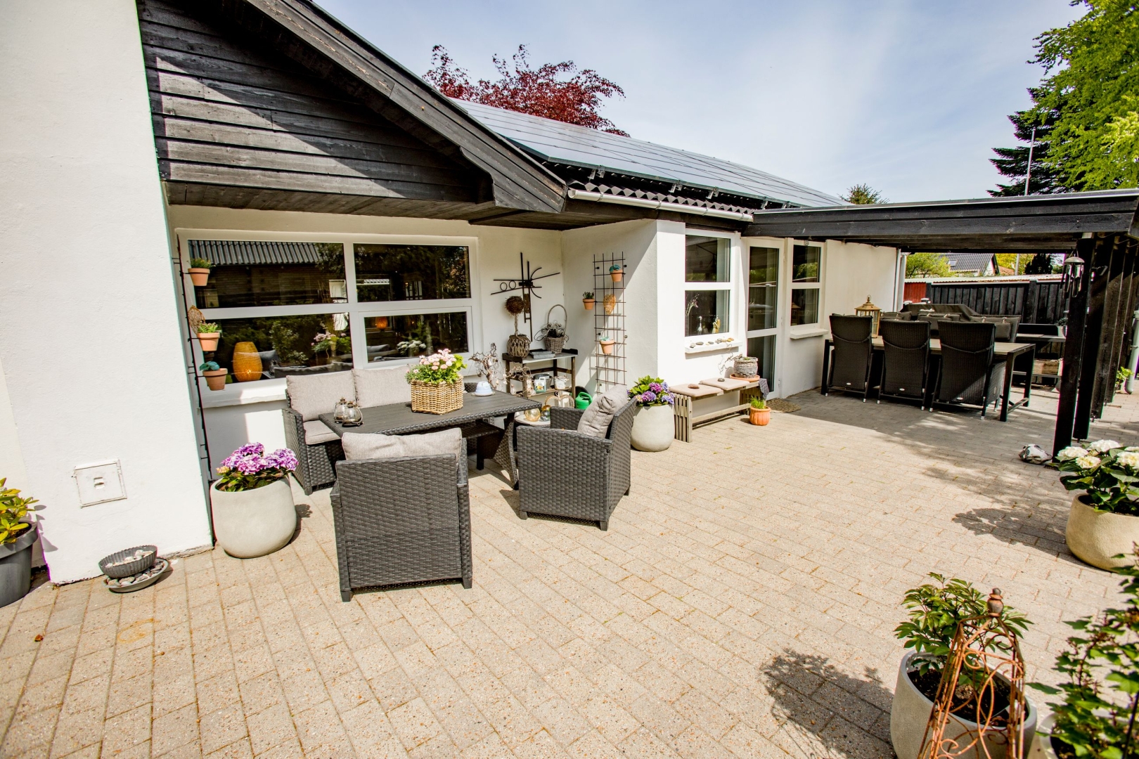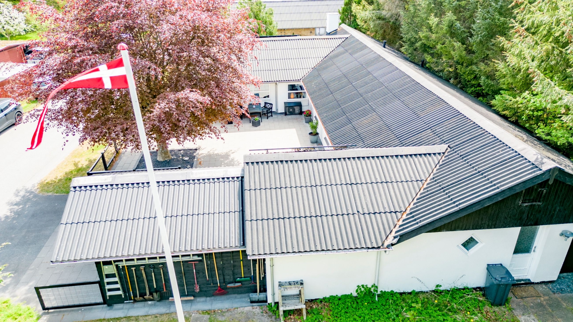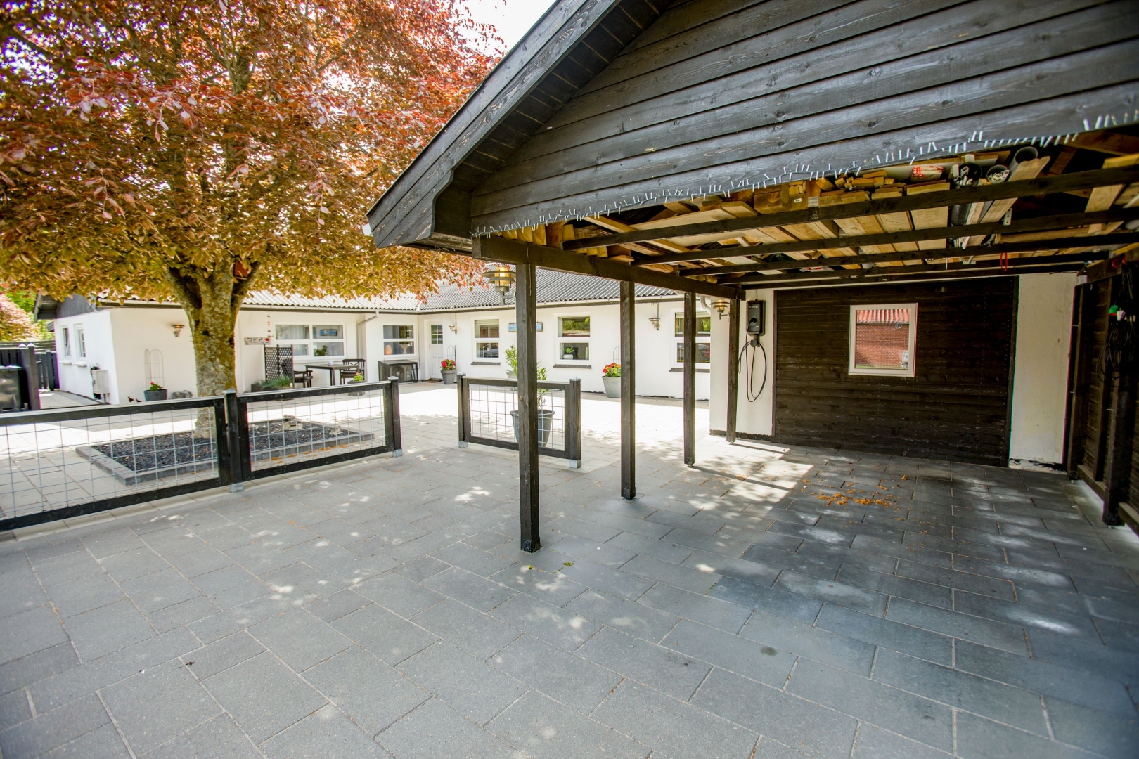 Udenfor venter en helt ugeneret og stemningsfuld gårdhave mod syd med overdækning, flisebelægning og en lille græsplæne det perfekte sted at nyde sommerens lange aftener. Der er en bred indkørsel med carport og en 37 m² stor garage, som i dag er indrettet som værksted. Hele uderummet fremstår præsentabelt og velholdt med en flot helhed.
