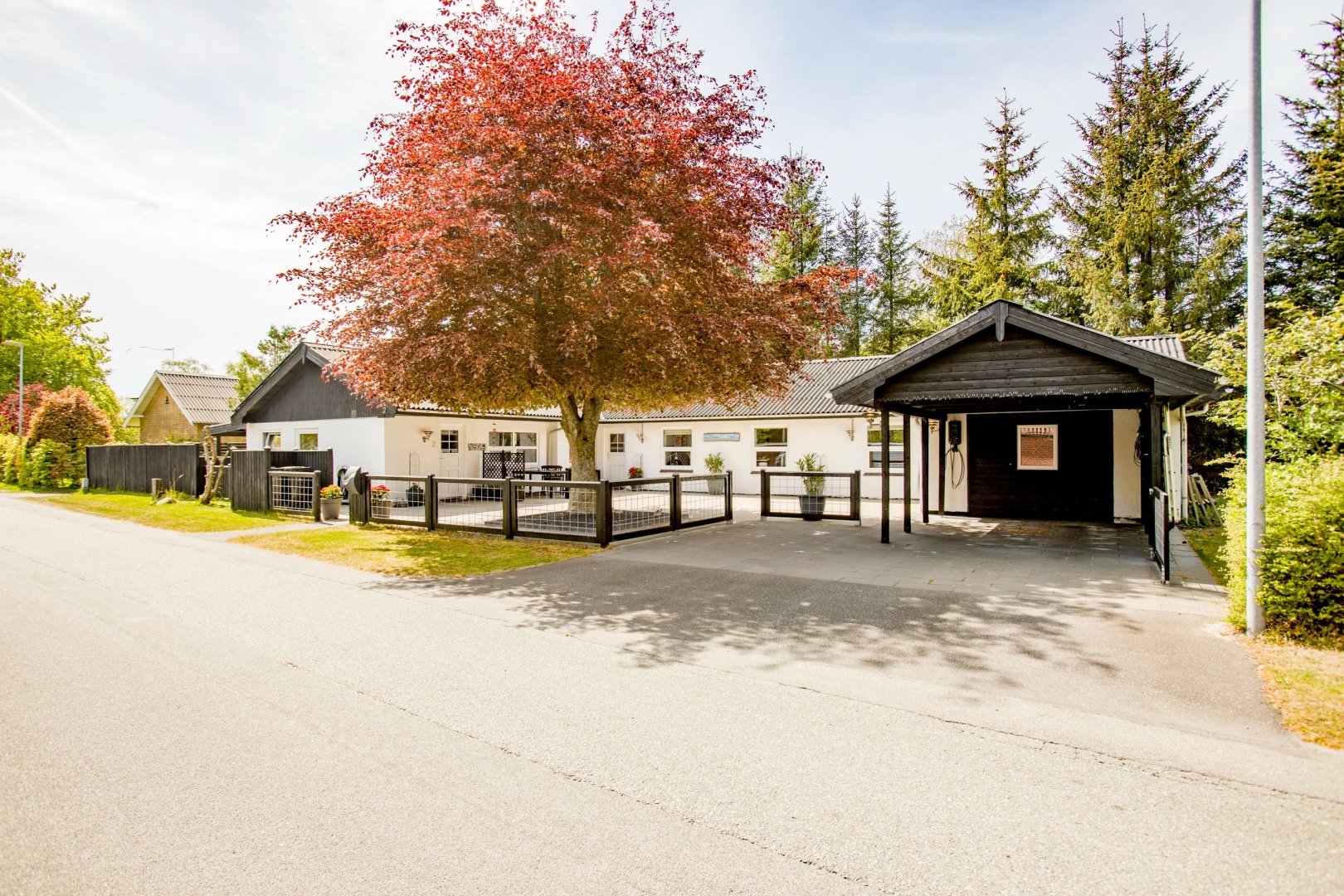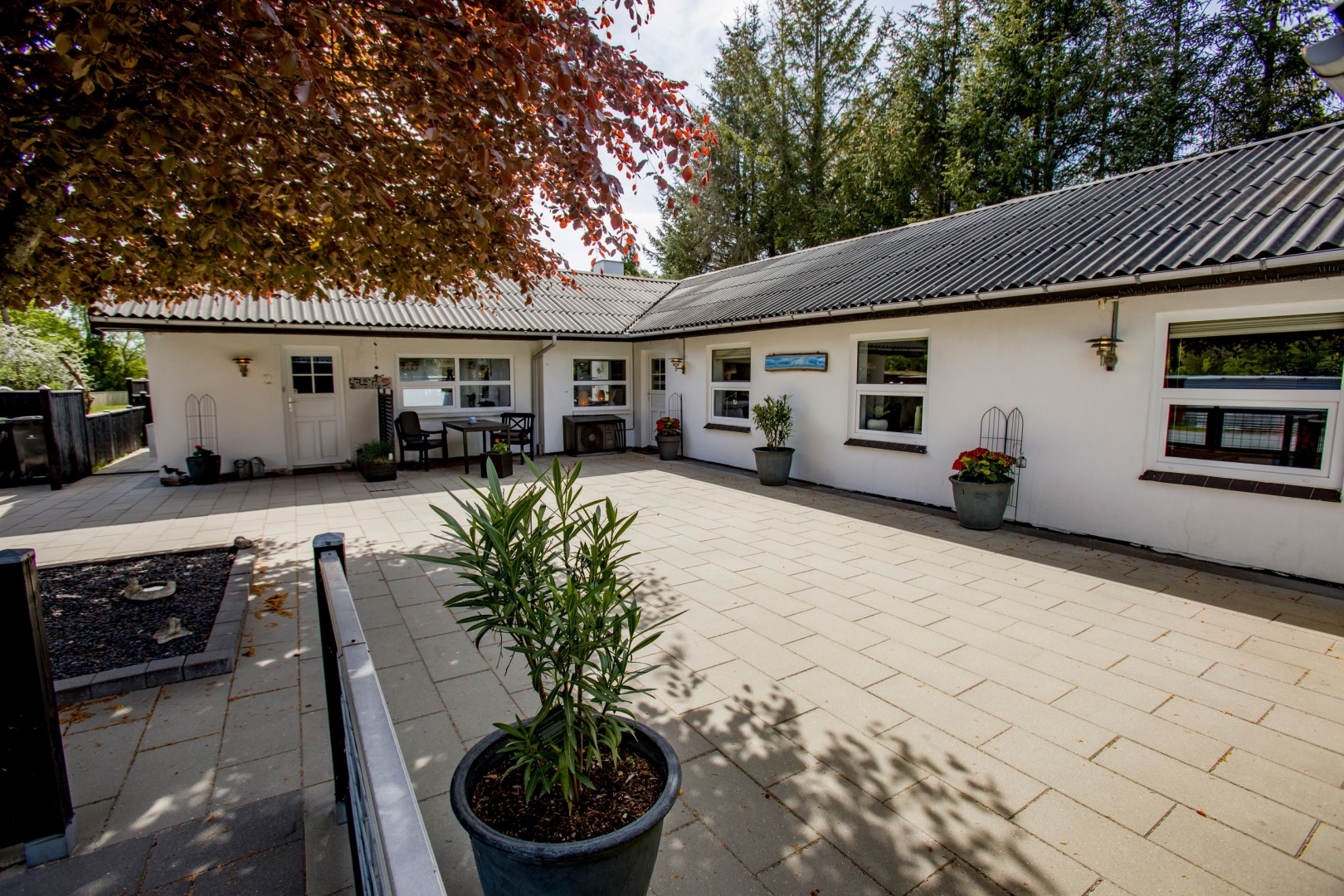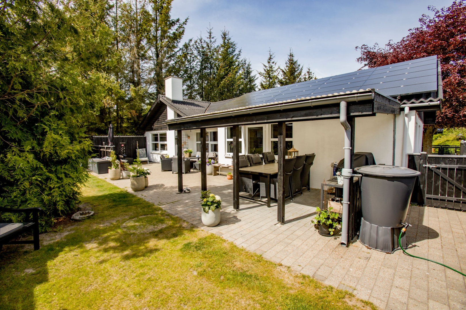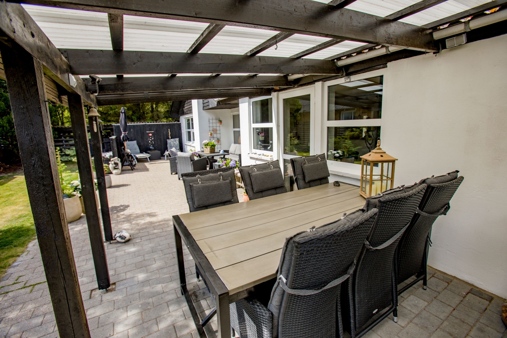 Udenfor venter en helt ugeneret og stemningsfuld gårdhave mod syd med overdækning, flisebelægning og en lille græsplæne det perfekte sted at nyde sommerens lange aftener. Der er en bred indkørsel med carport og en 37 m² stor garage, som i dag er indrettet som værksted. Hele uderummet fremstår præsentabelt og velholdt med en flot helhed.