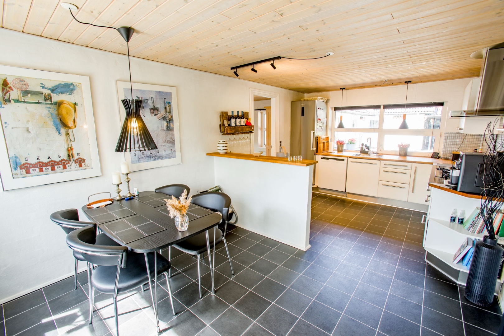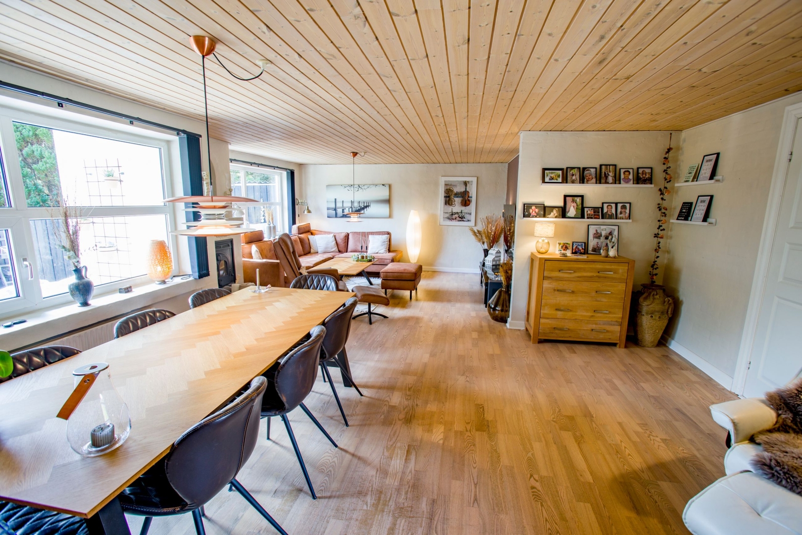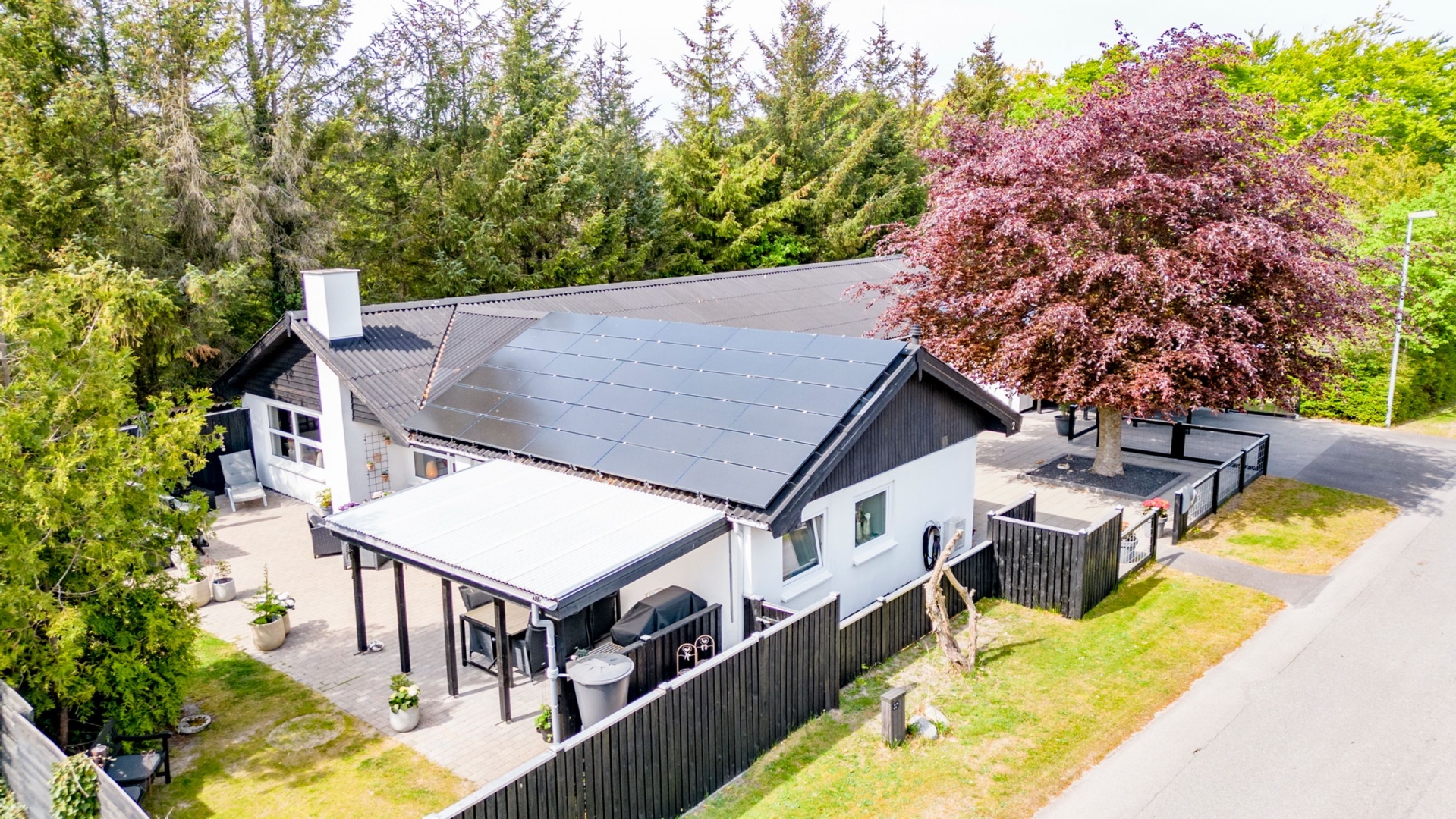 Huset fremstår hvidpudset med sortmalet eternittag og byder på hele 152 veludnyttede m², opført i solide materialer og med en lys og indbydende atmosfære. Her får du blandt andet et lækkert køkken-alrum med gulvvarme og direkte udgang til en overdækket terrasse, et praktisk bryggers med god opbevaringsplads og et viktualierum med inverter til solcellerne, som blev installeret i 2012. I den store stue er der både spiseplads, varmepumpe og en indmuret brændeovn, der skaber hygge og varme året rundt.
