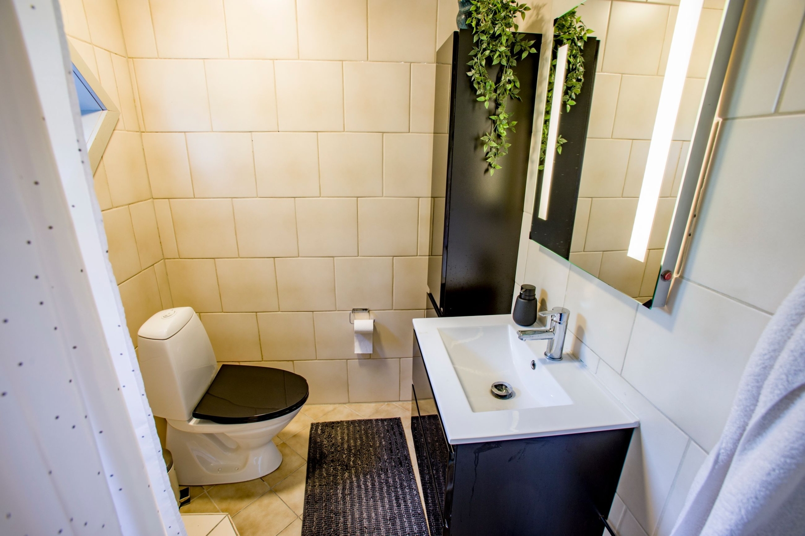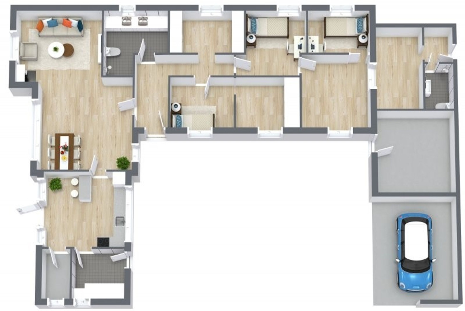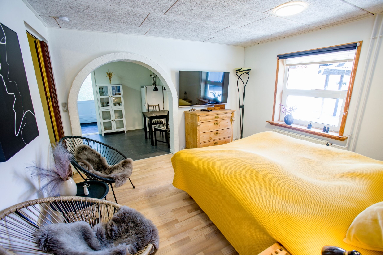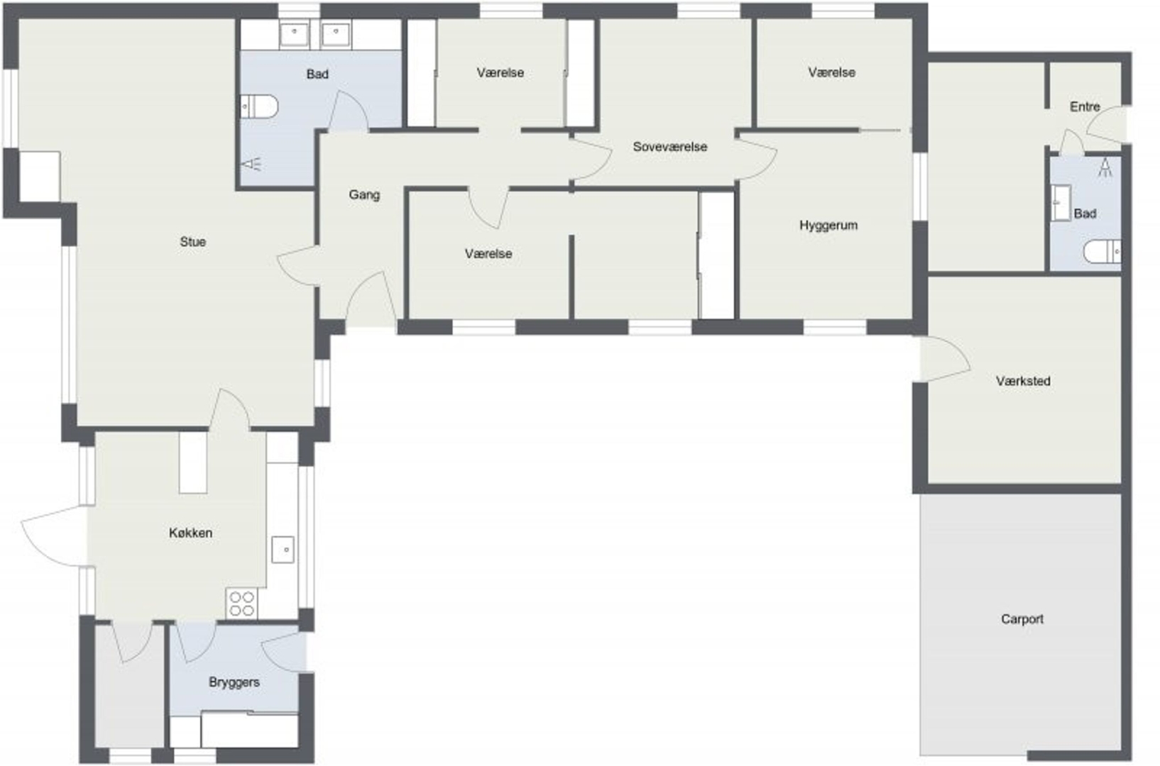 Boligen rummer desuden et soveværelse, værelse med skydedørsskabe samt et stort værelse der tidligere var to, samt et rummeligt badeværelse med bruseniche, dobbelt vask og gulvvarme. I den separate afdeling i husets ene ende finder du to ekstra værelser, et tekøkken med spiseplads og endnu et badeværelse perfekt til teenageren, gæster eller liberalt erhverv.