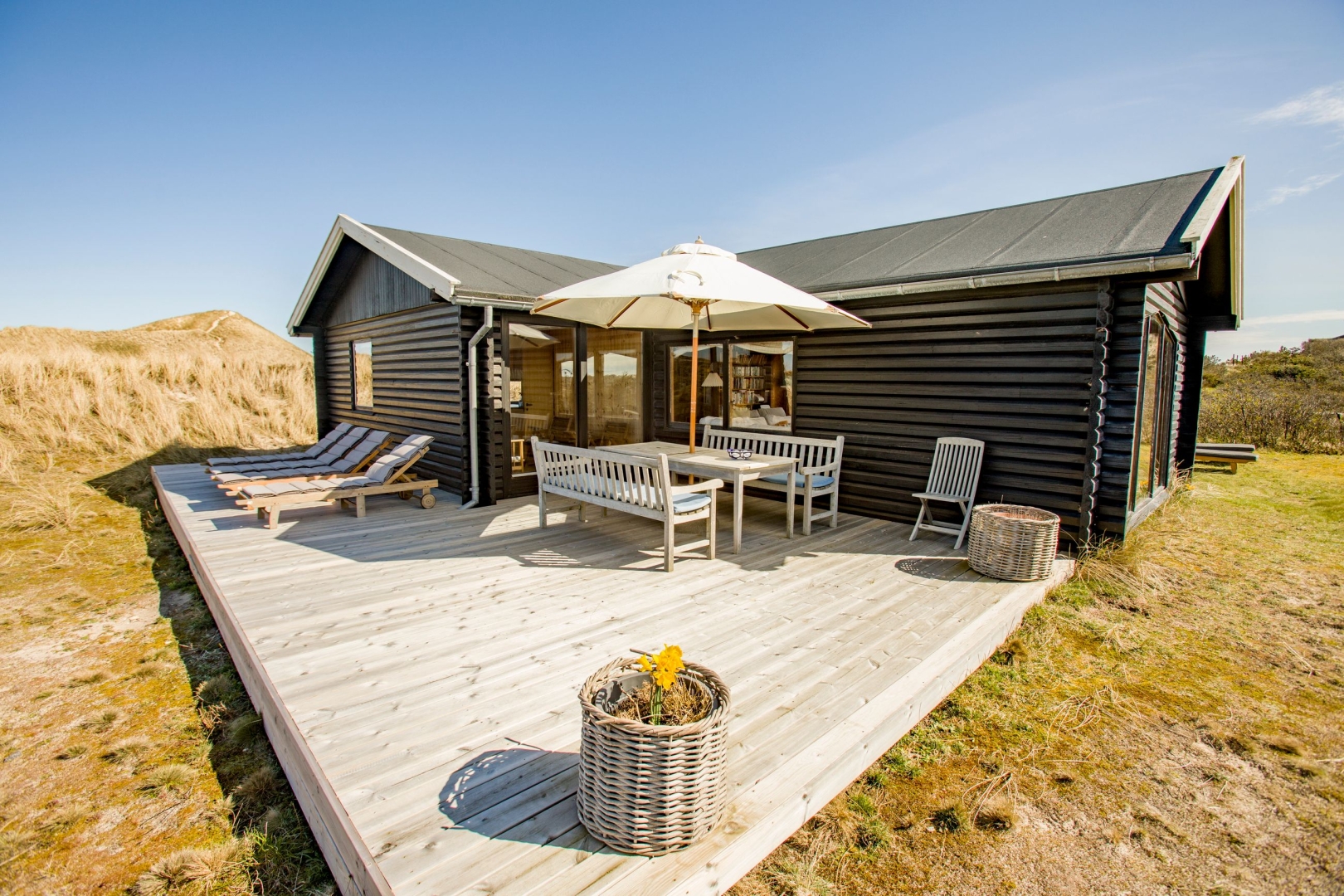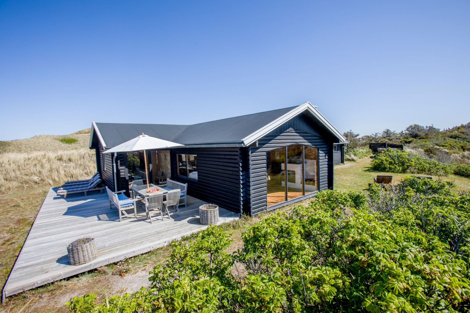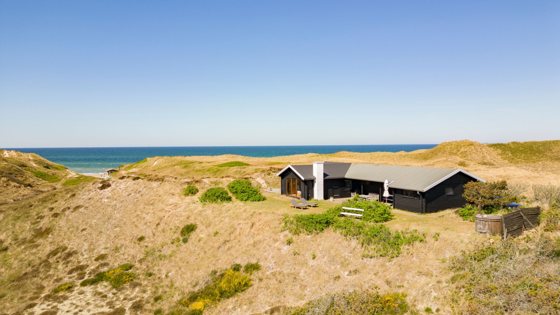 Sommerhuset er opført i træ og byder på 140 m² bolig med en gennemført sommerhusstemning. Den store, lyse opholdsstue har åben pejs og store vinduespartier, der lukker det storslåede lys og landskab ind. Mod vest har du frit udsyn til solnedgangen over havet, mens et stort panoramavindue mod syd giver dig et fantastisk kig ud over klitterne og milen. Køkkenet er hyggeligt og funktionelt med spiseplads og direkte udgang til en sydvestvendt træterrasse, hvor udsigten og solen kan nydes i fulde drag.