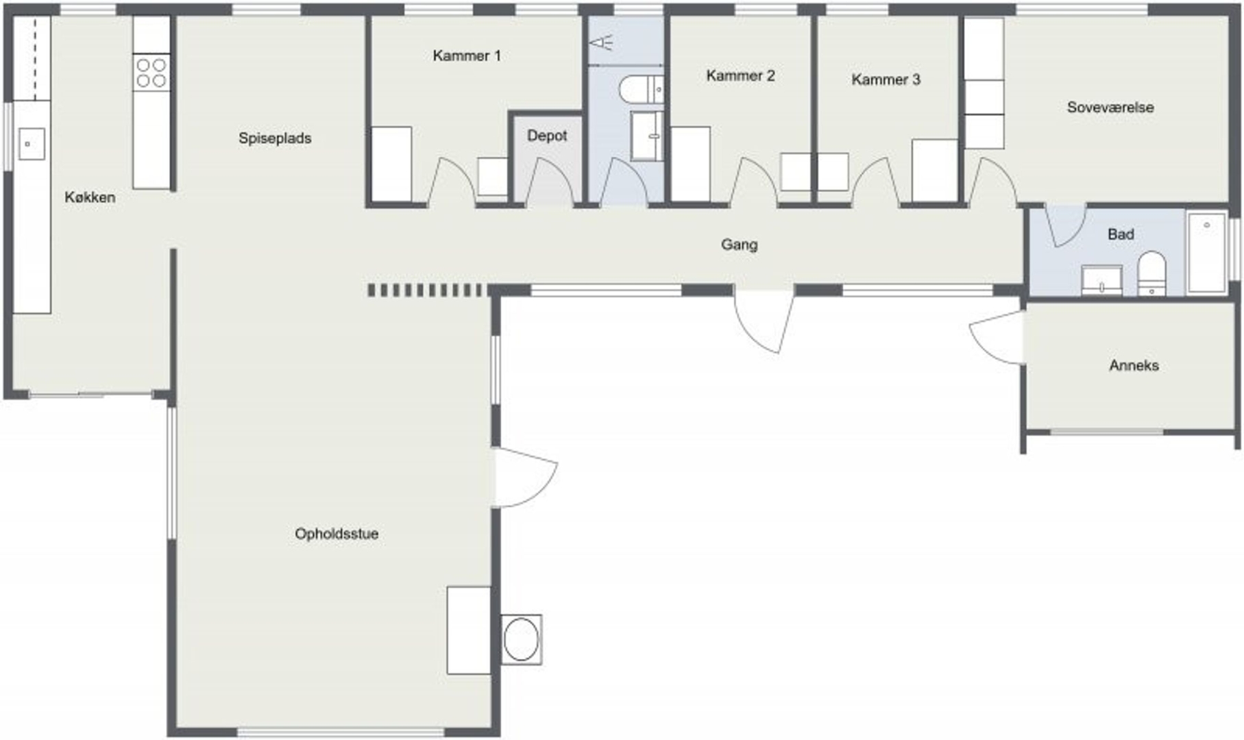 Boligen indeholder to soveværelser med dobbeltsenge, hvoraf det ene har eget badeværelse. Derudover er der to værelser med håndvaske og endnu et badeværelse med bruseniche. Et integreret anneks byder på ekstra overnatningsplads og egen håndvask perfekt til gæster eller teenagere. Udenfor finder du både en udendørs koldvandsbruser og et vildmarksbad, hvor du kan sidde i dampende varme og nyde stjernehimlen og lyden af havets brusen i baggrunden.