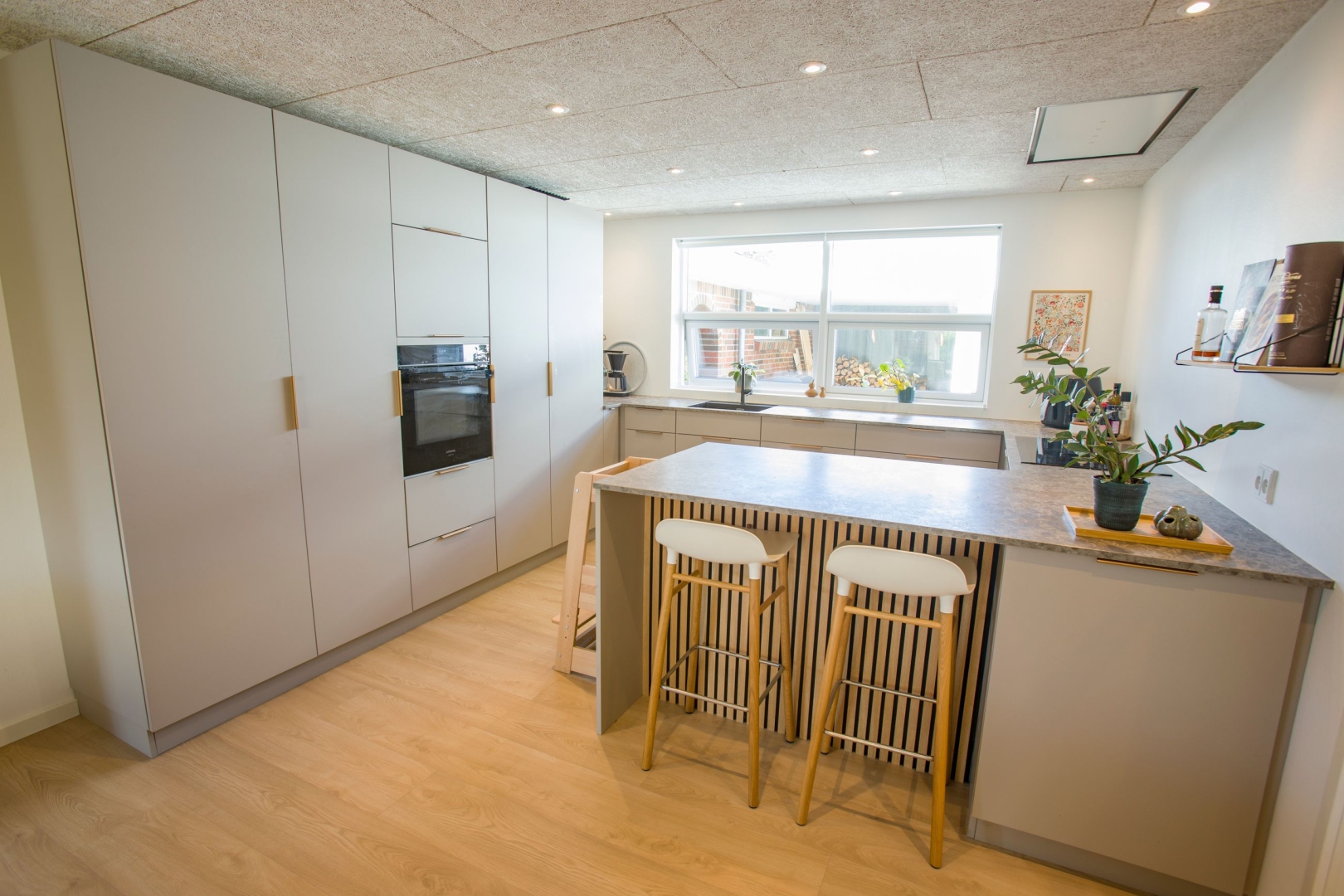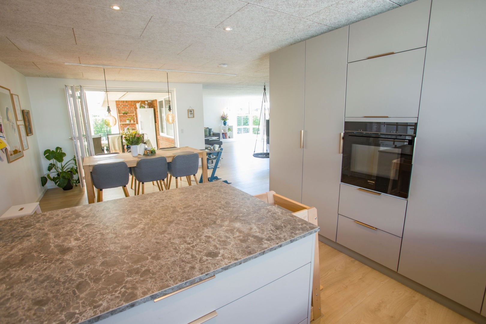 ·Eksklusivt badeværelse med væghængt toilet og bruseniche - Stort åbent køkken-alrum og stue i ét moderne Kvik-køkken med arbejdsø, lofthængt emhætte og eksklusiv Siemens ovn til 42.000,-