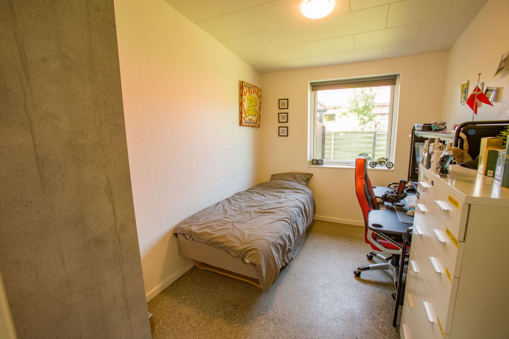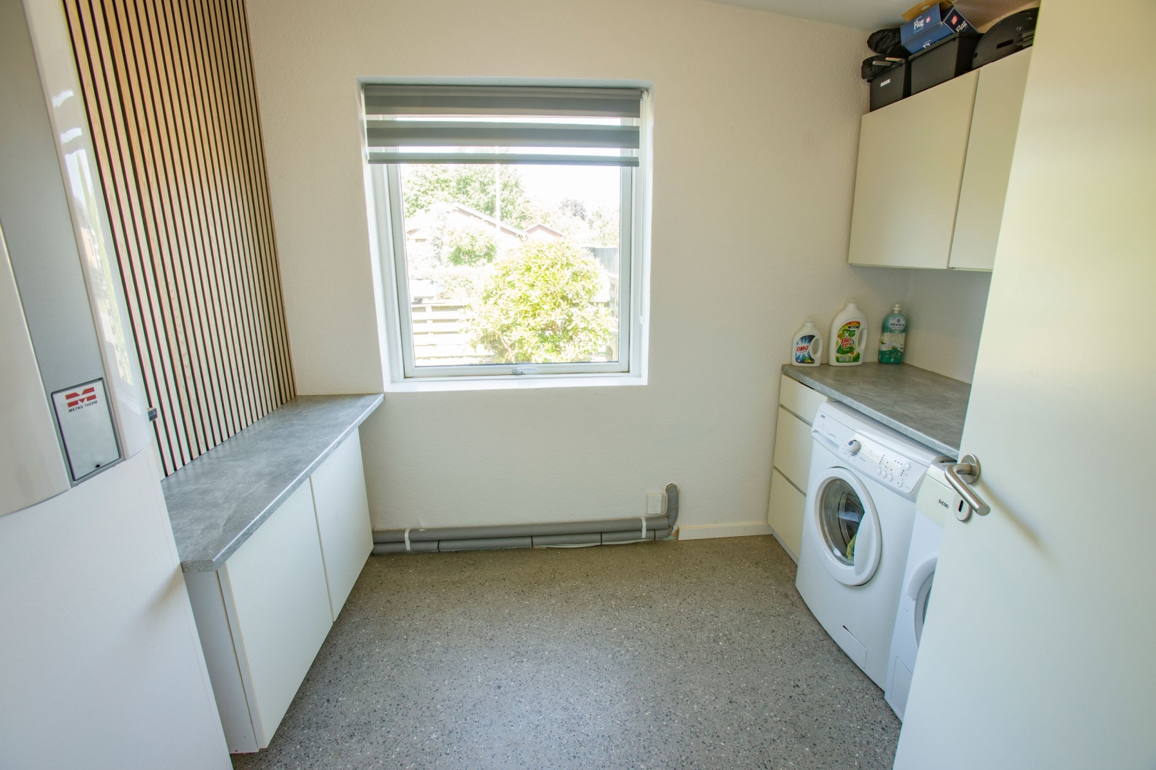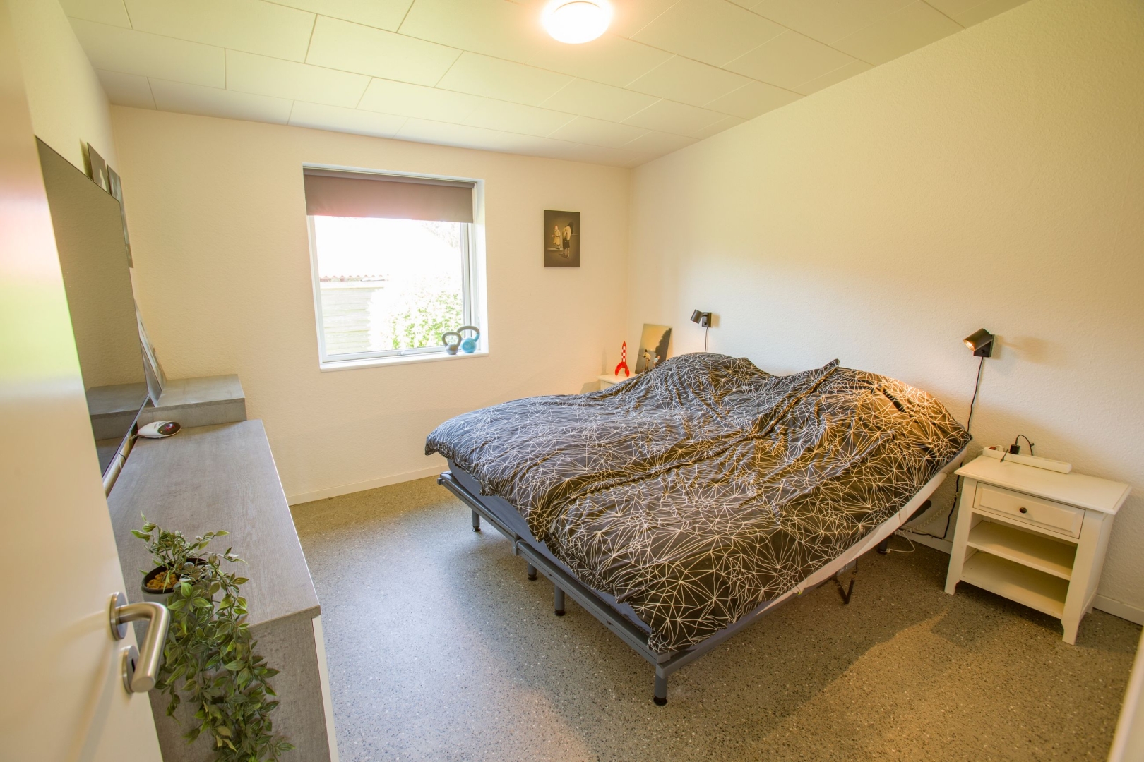 Boligen byder på en flot entré med garderobeplads, et praktisk bryggers med luft-til-vand varmepumpe installeret i december 2022, vaskemaskine og tørretumbler. Badeværelset er nyrenoveret med moderne bruseniche, vask og toilet. Der er tre gode værelser alle med skabe og et åbent, lyst køkken i direkte forbindelse med stuen. Her er der en rå og indbydende atmosfære med slebet betongulv i New Yorker-stil, som fortsætter gennem hele boligen. Gulvvarmen er ny og styres via trådløse rumtermostater, derudover kan selve varmepumpen og vandvarmer fjernstyres via app. Der er indlagt nye vandrør i huset, samt nye afløb og kloaksystem.
