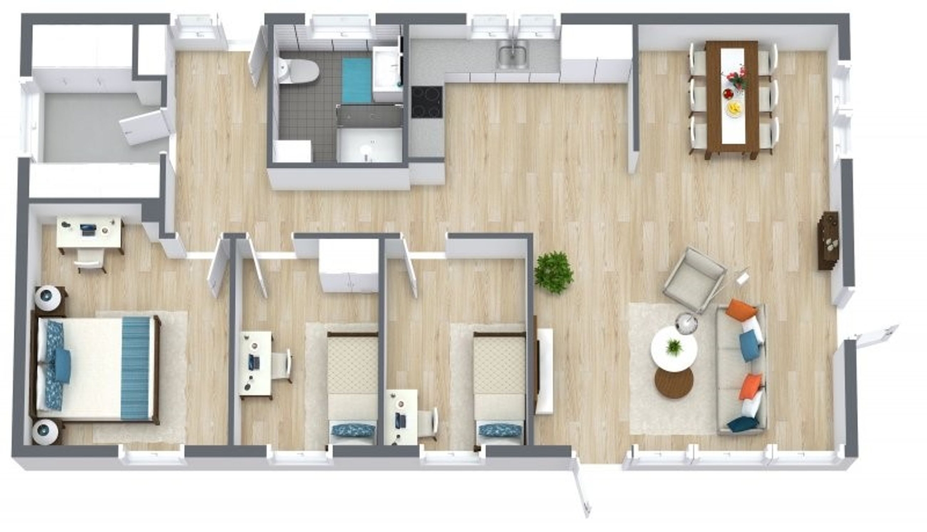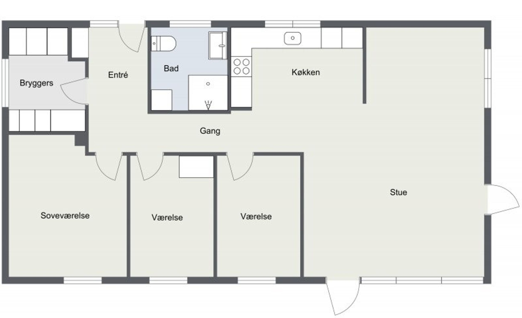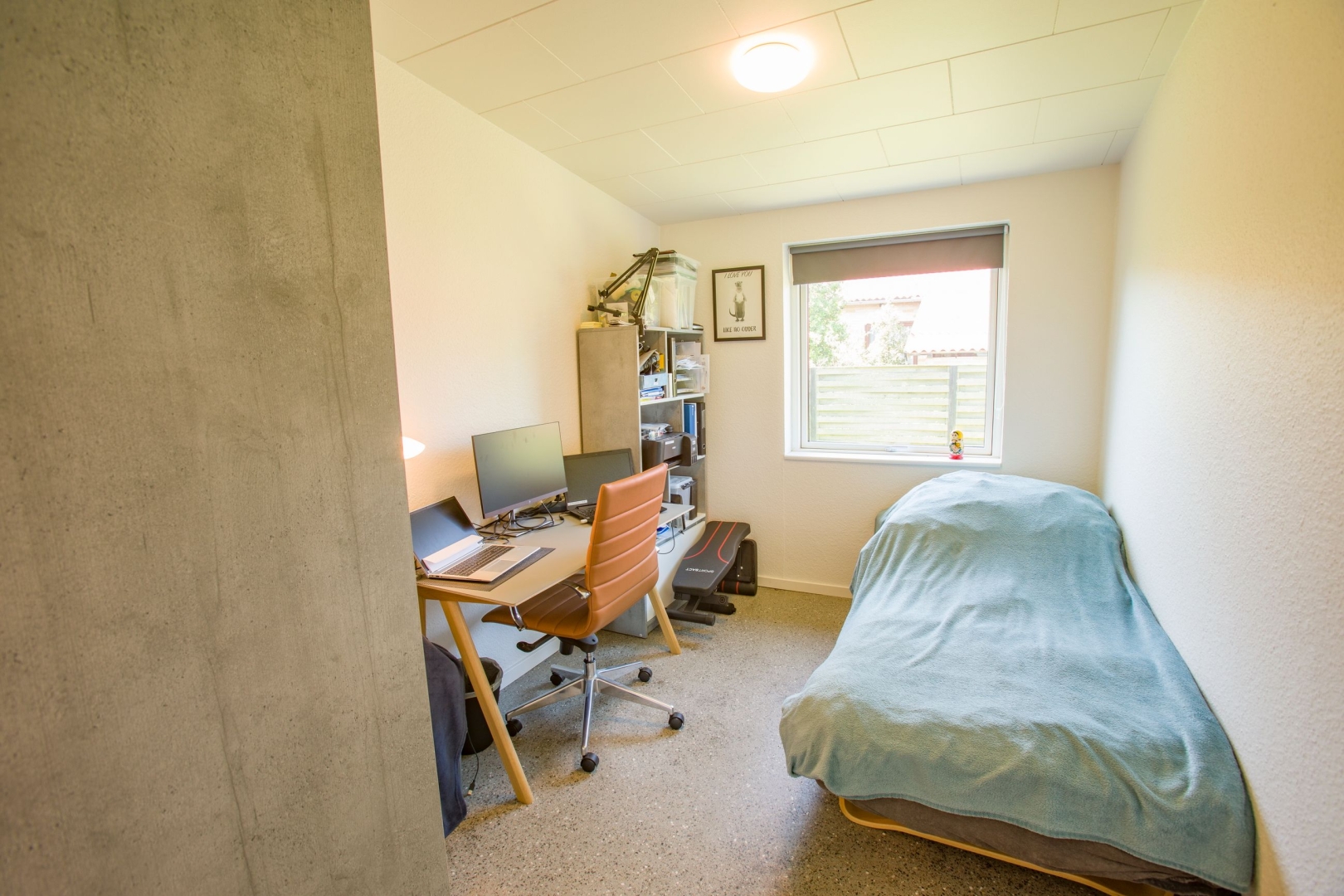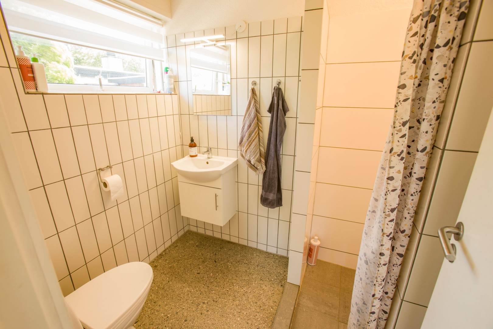 Boligen byder på en flot entré med garderobeplads, et praktisk bryggers med luft-til-vand varmepumpe installeret i december 2022, vaskemaskine og tørretumbler. Badeværelset er nyrenoveret med moderne bruseniche, vask og toilet. Der er tre gode værelser alle med skabe og et åbent, lyst køkken i direkte forbindelse med stuen. Her er der en rå og indbydende atmosfære med slebet betongulv i New Yorker-stil, som fortsætter gennem hele boligen. Gulvvarmen er ny og styres via trådløse rumtermostater, derudover kan selve varmepumpen og vandvarmer fjernstyres via app. Der er indlagt nye vandrør i huset, samt nye afløb og kloaksystem.
