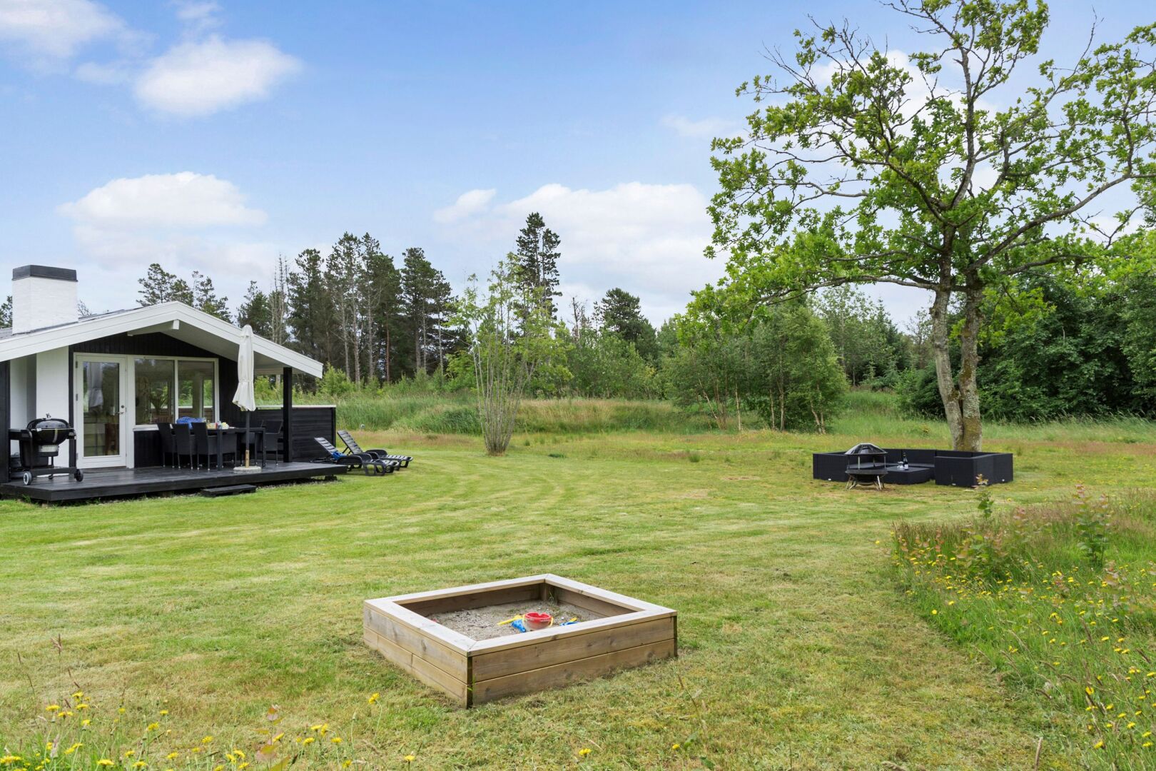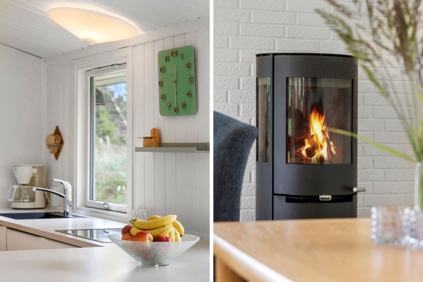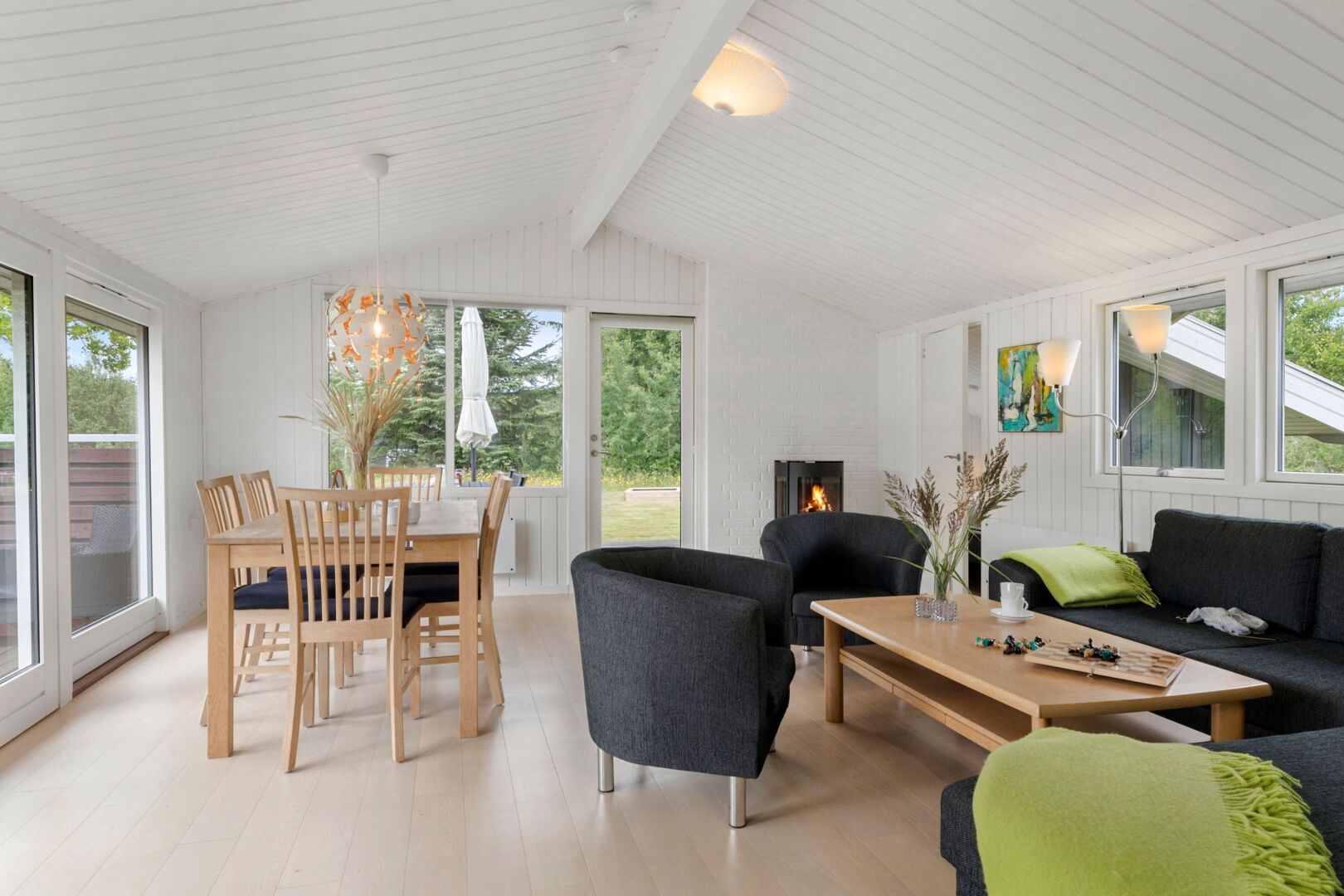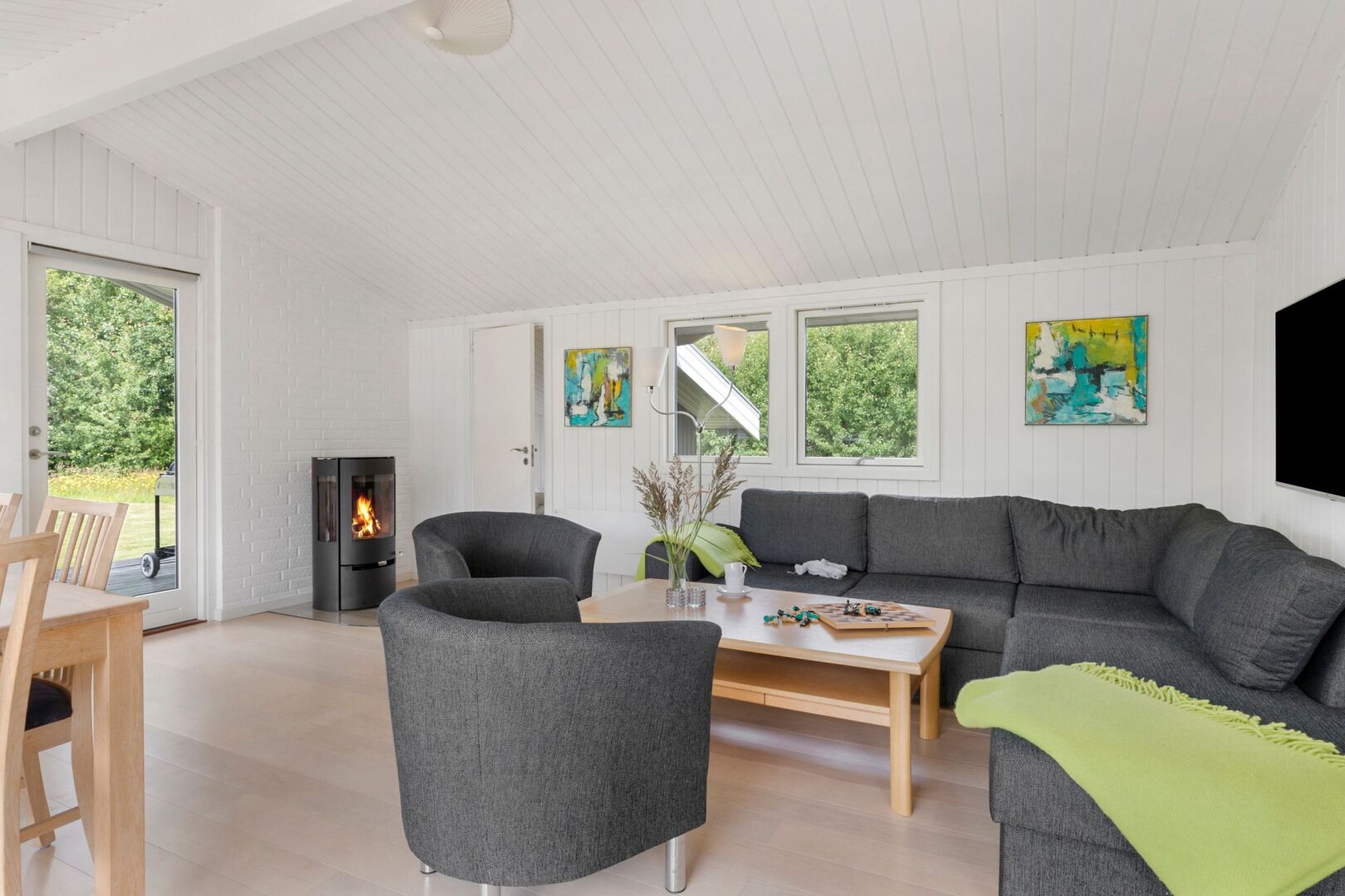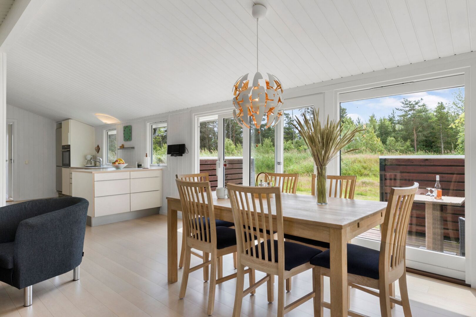Sommerhuset fremstår lyst, indbydende og indflytningsklart med en god planløsning, der skaber plads til samvær og afslapning. De store vinduespartier i stuen lukker lyset ind hele dagen og skaber en behagelig atmosfære i opholdsrummene. Her er åbent til kip og en god rumfornemmelse, mens brændeovnen tilføjer hygge og varme. Det åbne køkken og den tilhørende spiseplads har direkte adgang til både sydvendt og vestvendt træterrasse, hvor solen kan nydes hele dagen perfekt til sommerdage med morgenkaffe, frokost i det fri og lange aftener under åben himmel.