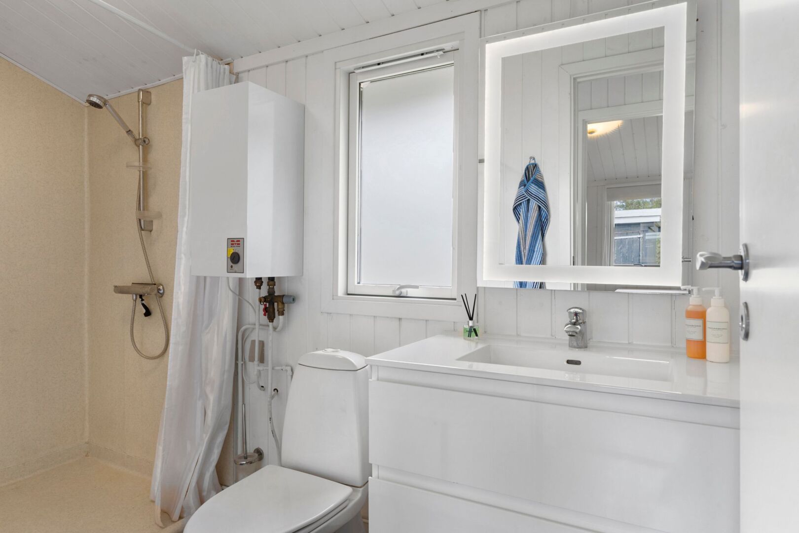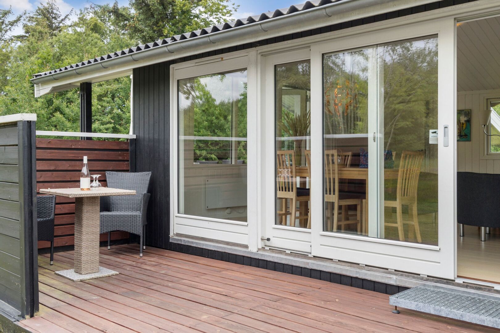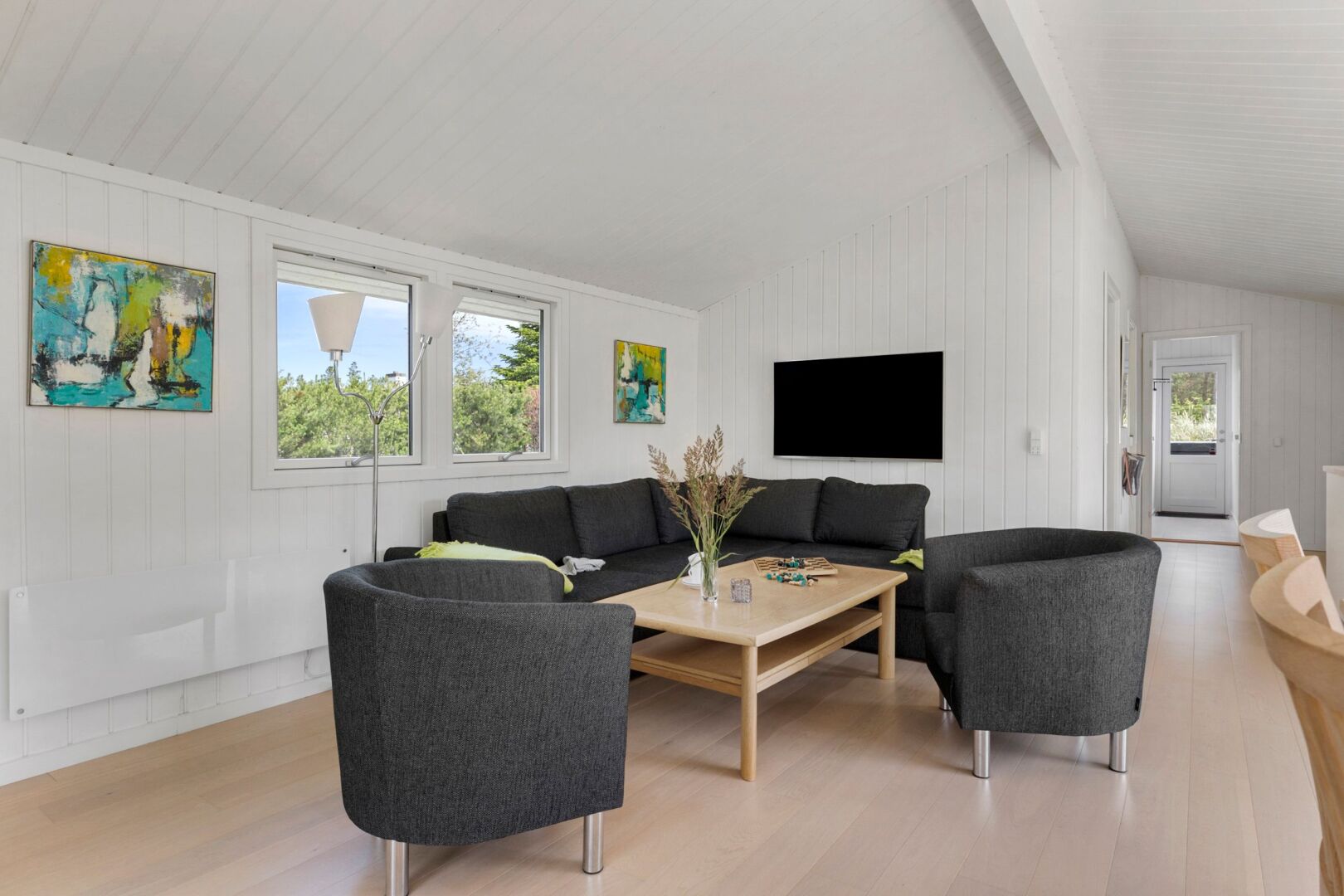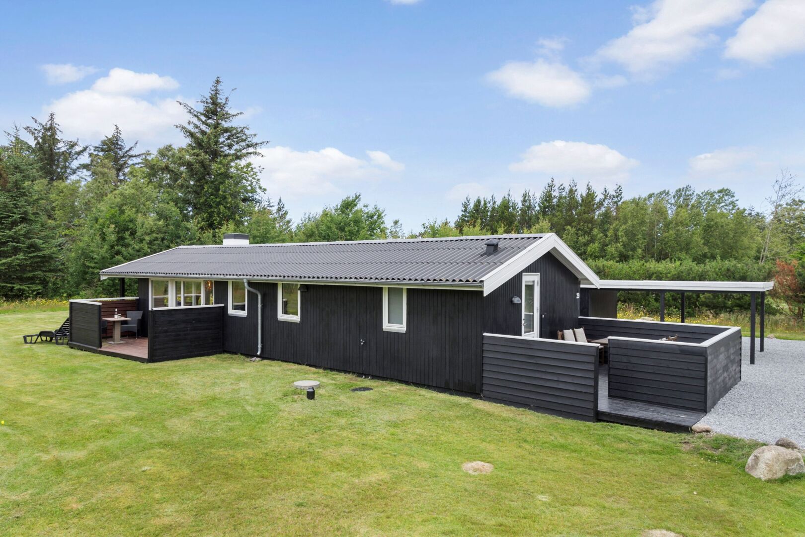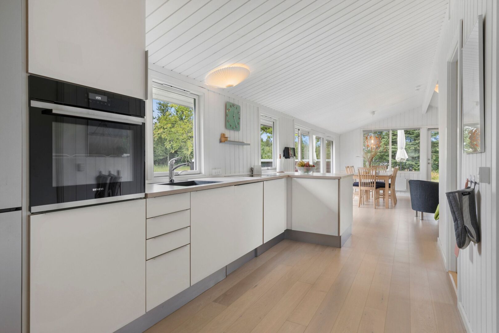 Sommerhuset fremstår lyst, indbydende og indflytningsklart med en god planløsning, der skaber plads til samvær og afslapning. De store vinduespartier i stuen lukker lyset ind hele dagen og skaber en behagelig atmosfære i opholdsrummene. Her er åbent til kip og en god rumfornemmelse, mens brændeovnen tilføjer hygge og varme. Det åbne køkken og den tilhørende spiseplads har direkte adgang til både sydvendt og vestvendt træterrasse, hvor solen kan nydes hele dagen perfekt til sommerdage med morgenkaffe, frokost i det fri og lange aftener under åben himmel.