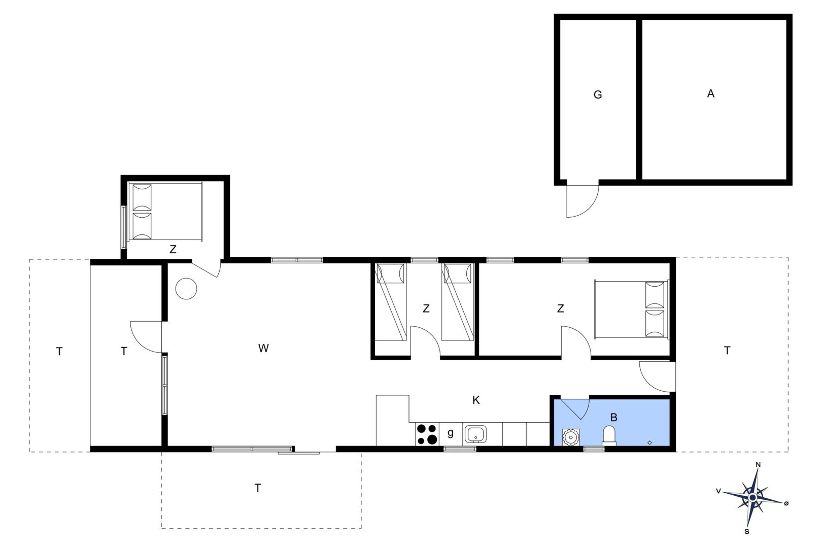 Huset rummer et rummeligt soveværelse, et værelse med køjeseng og skabsplads samt et badeværelse med bruseniche. Derudover er der et praktisk indbygget udhus med mange anvendelsesmuligheder som pt er indrettet som ekstra værelse, og til sommerhuset hører også en carport med tilhørende udhus til opbevaring.
